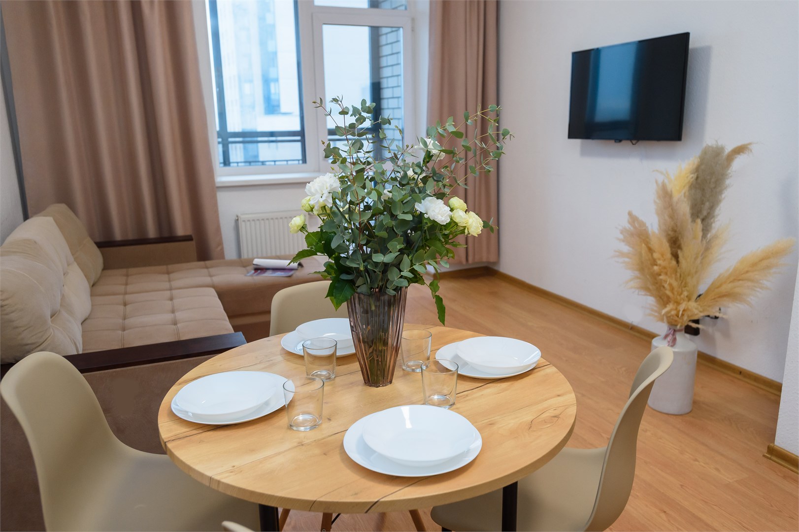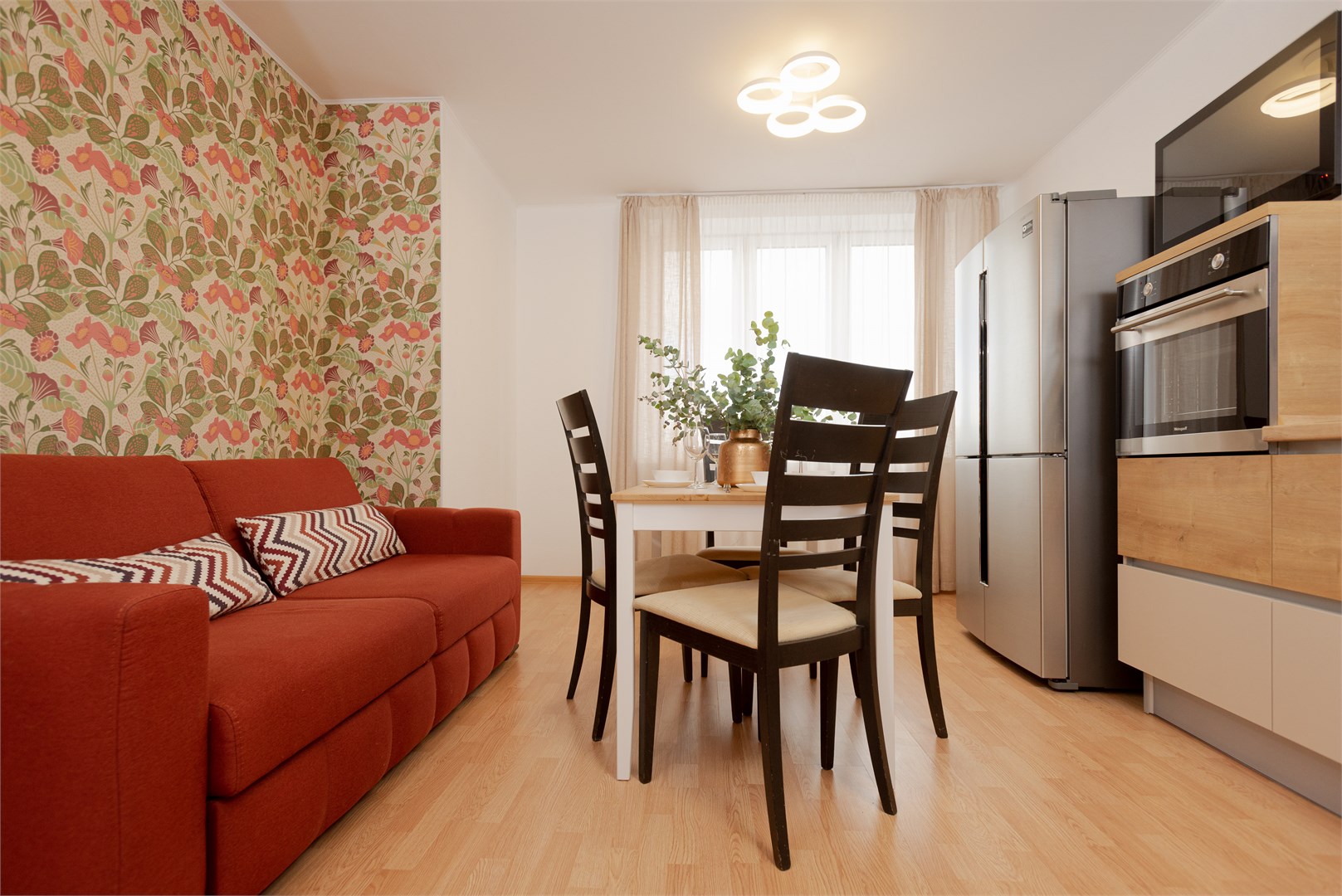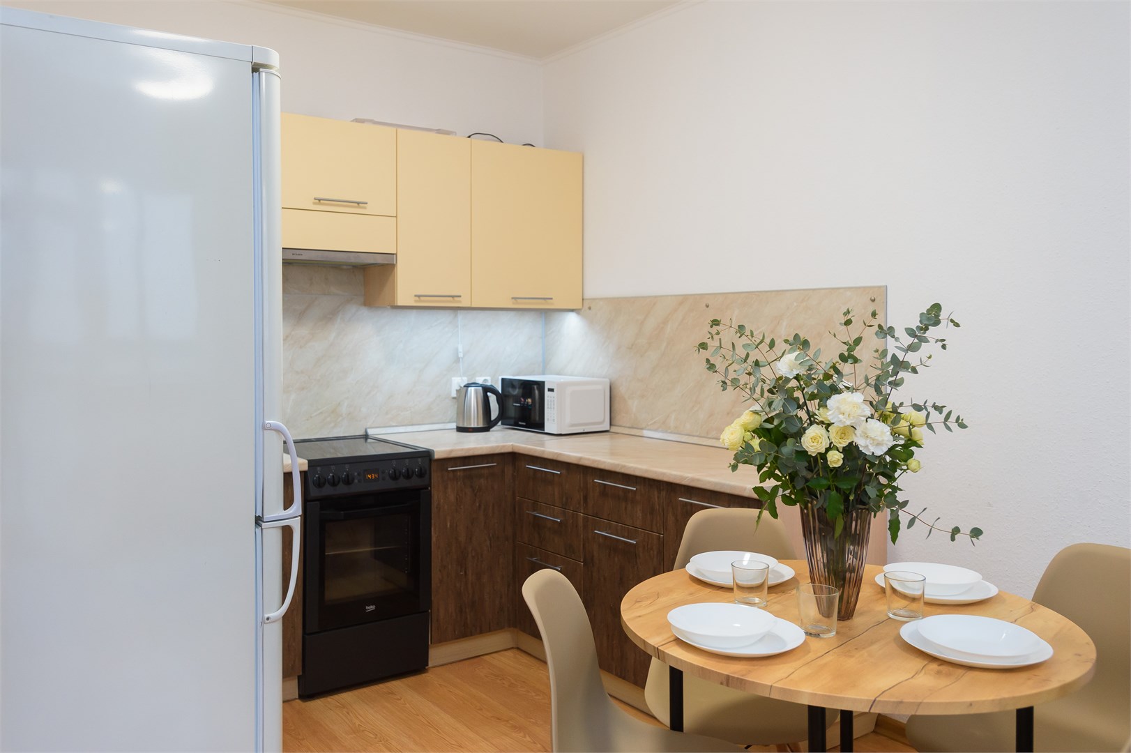 В номере: вешалка, диван раскладной, зеркало, кровать двуспальная, прикроватный столик, стол, стулья, шкаф-купе, гладильная доска, микроволновая печь, набор посуды, плита электрическая, стиральная машина, сушилка для белья, телевизор, утюг, холодильник, электрочайник