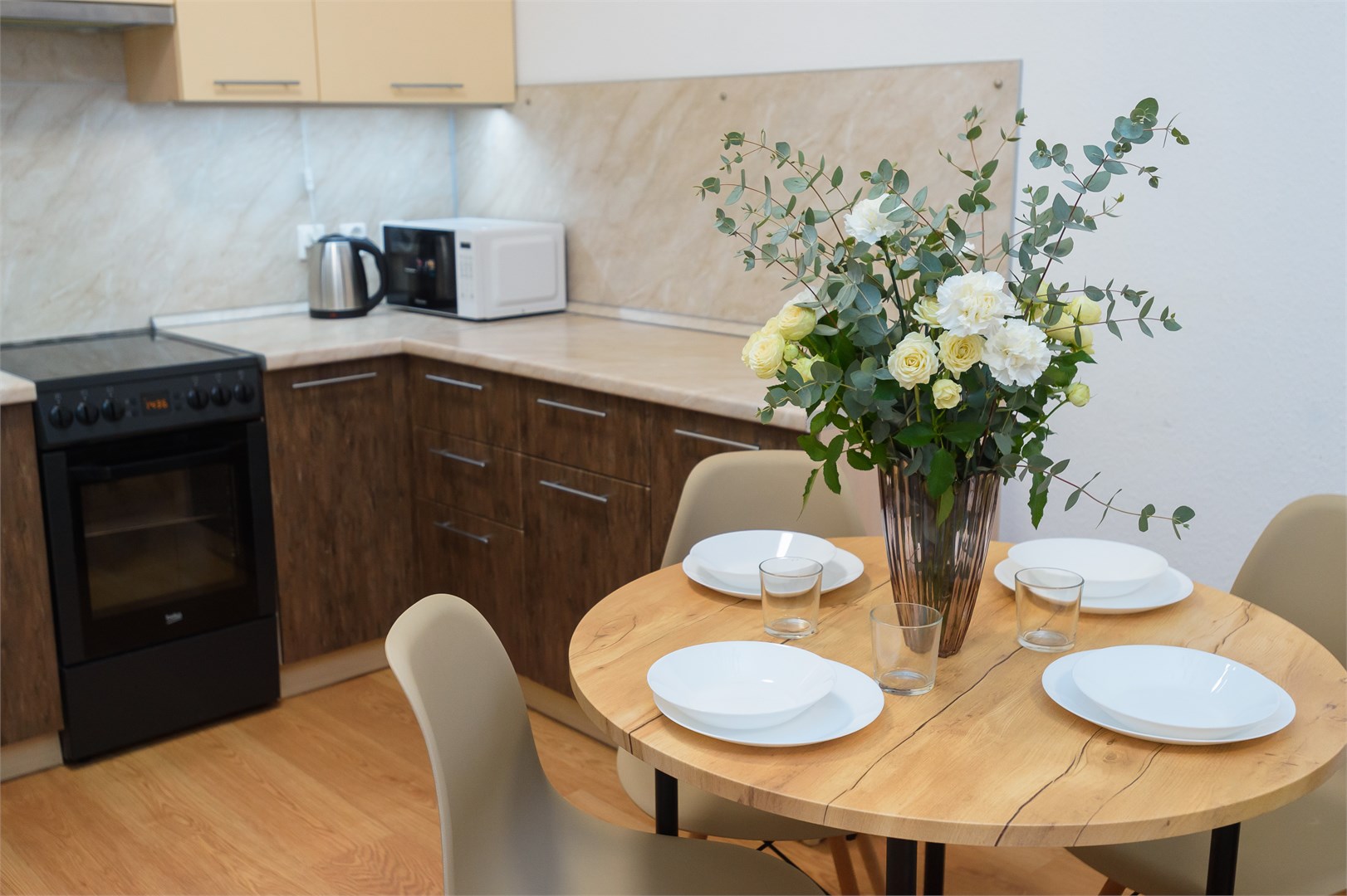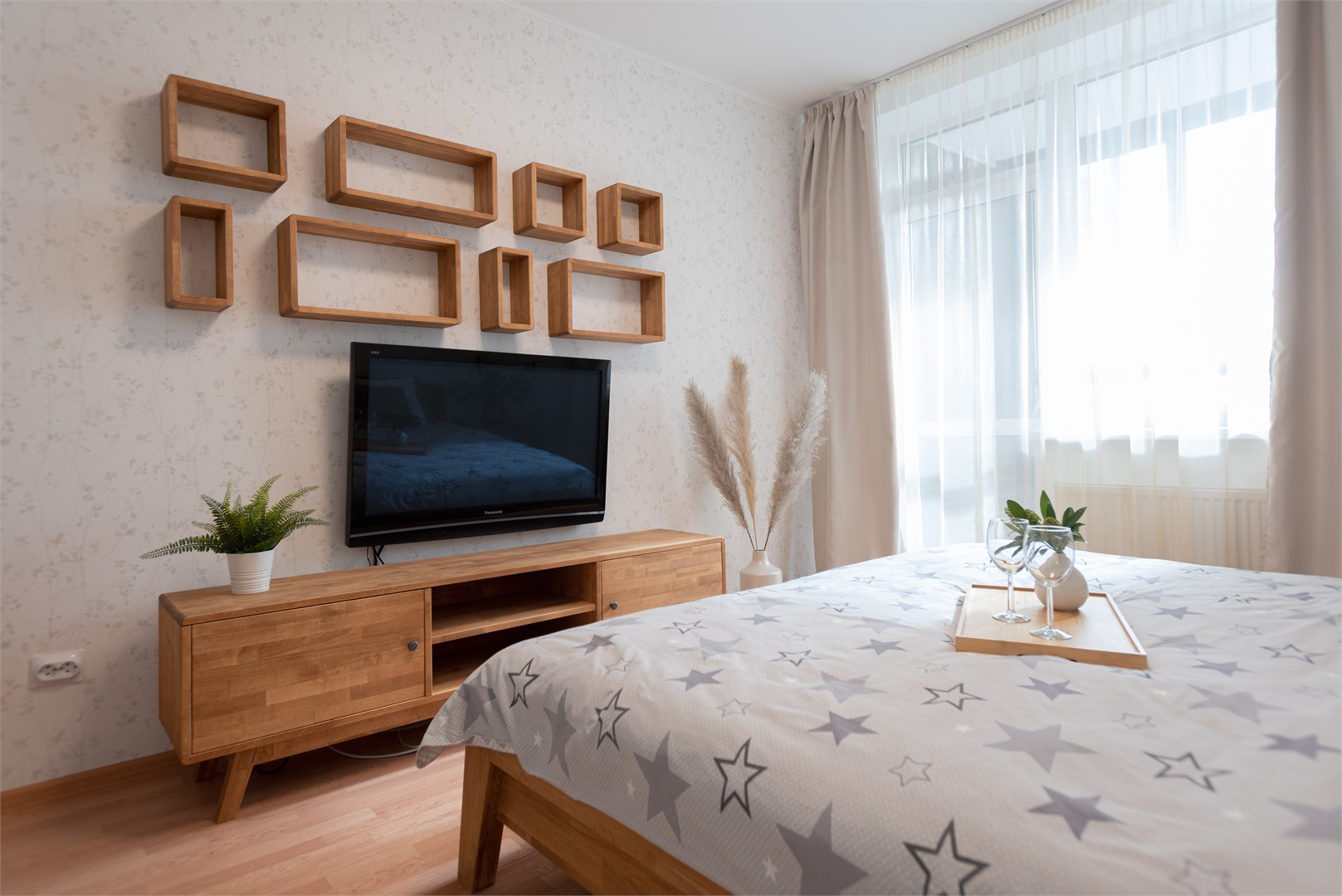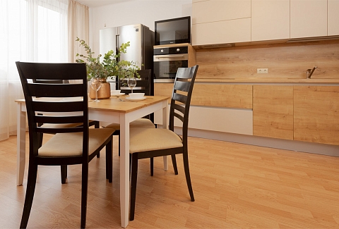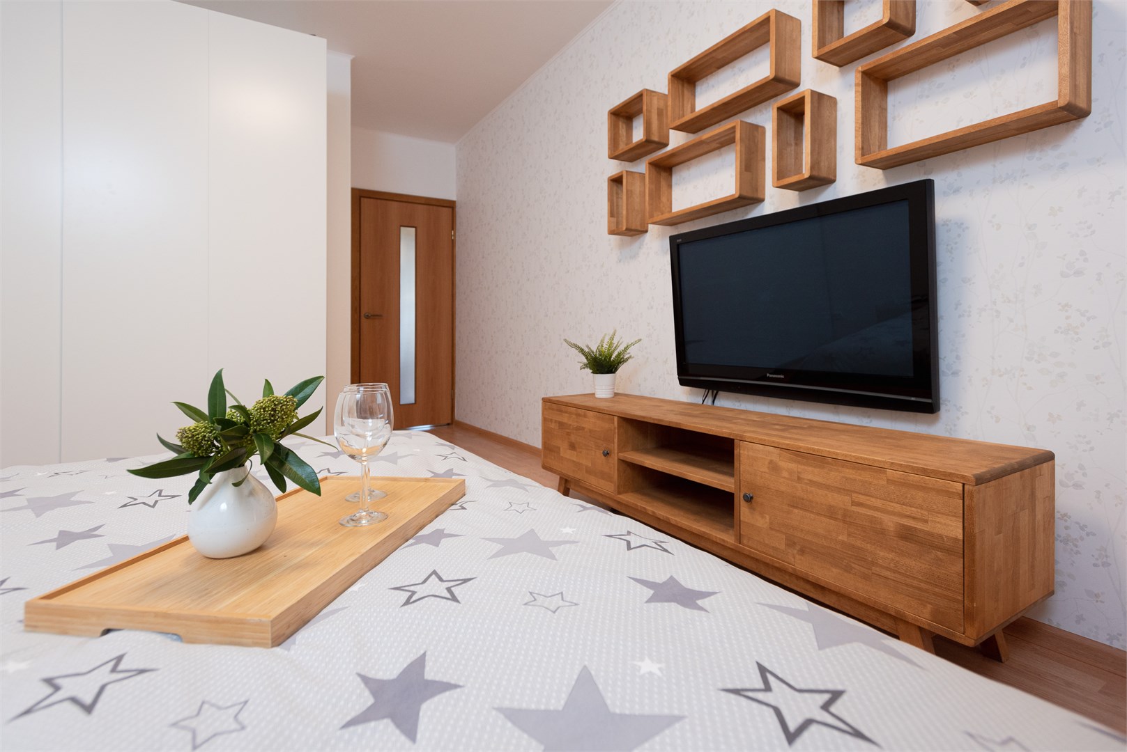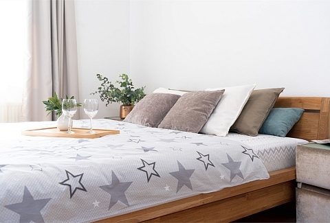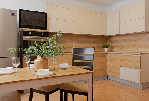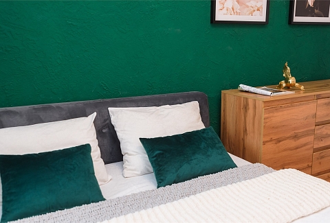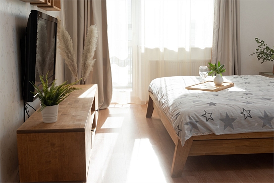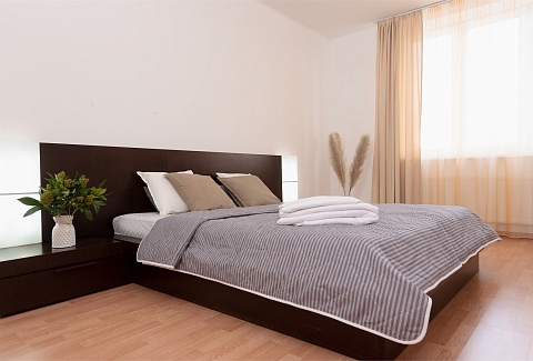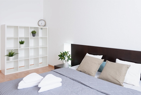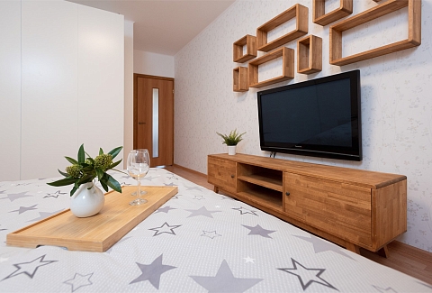 В номере: вешалка, диван раскладной, зеркало, кровать двуспальная, прикроватные тумбочки, стол, стулья, тумба под телевизор, шкаф, гладильная доска, духовой шкаф, микроволновая печь, набор посуды, плита электрическая, стиральная машина, сушилка для белья, телевизор, утюг, холодильник, электрочайник