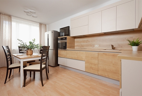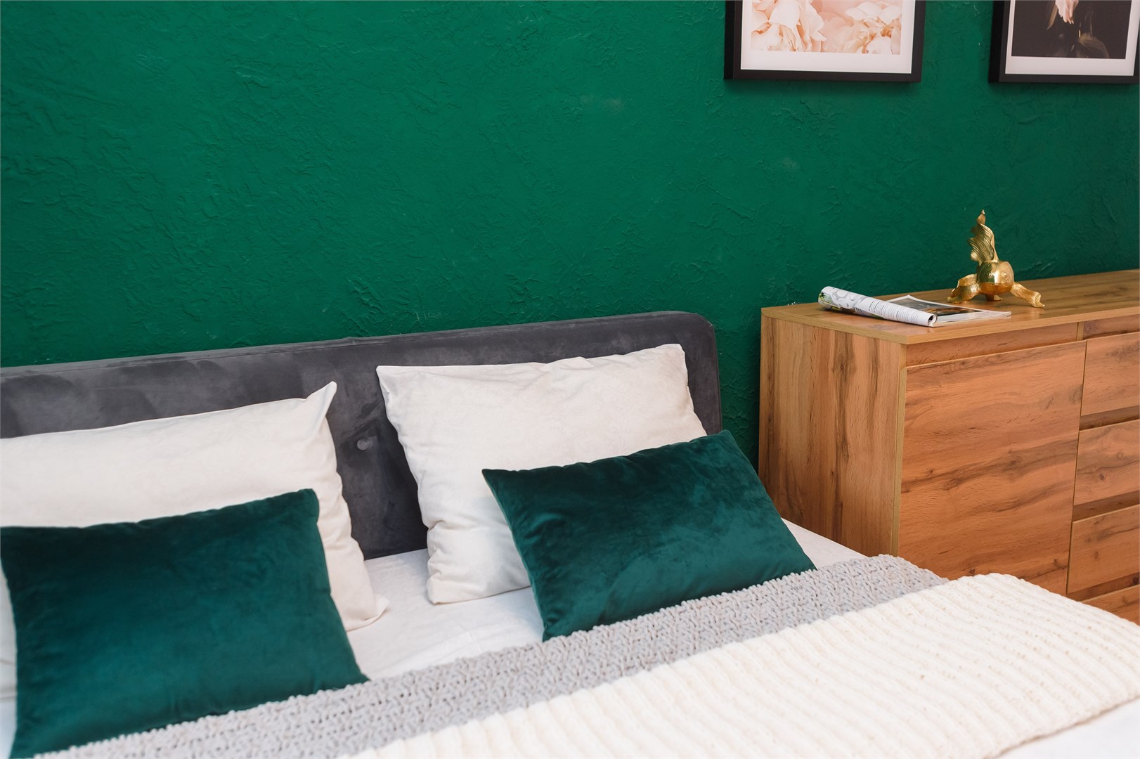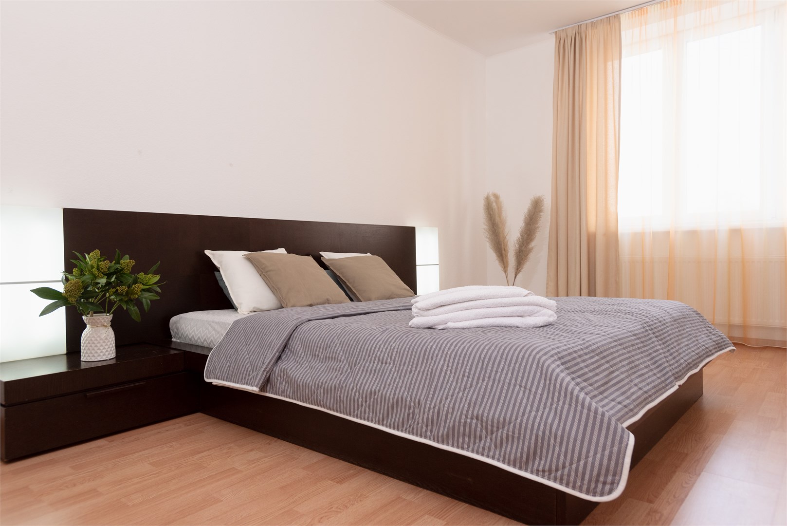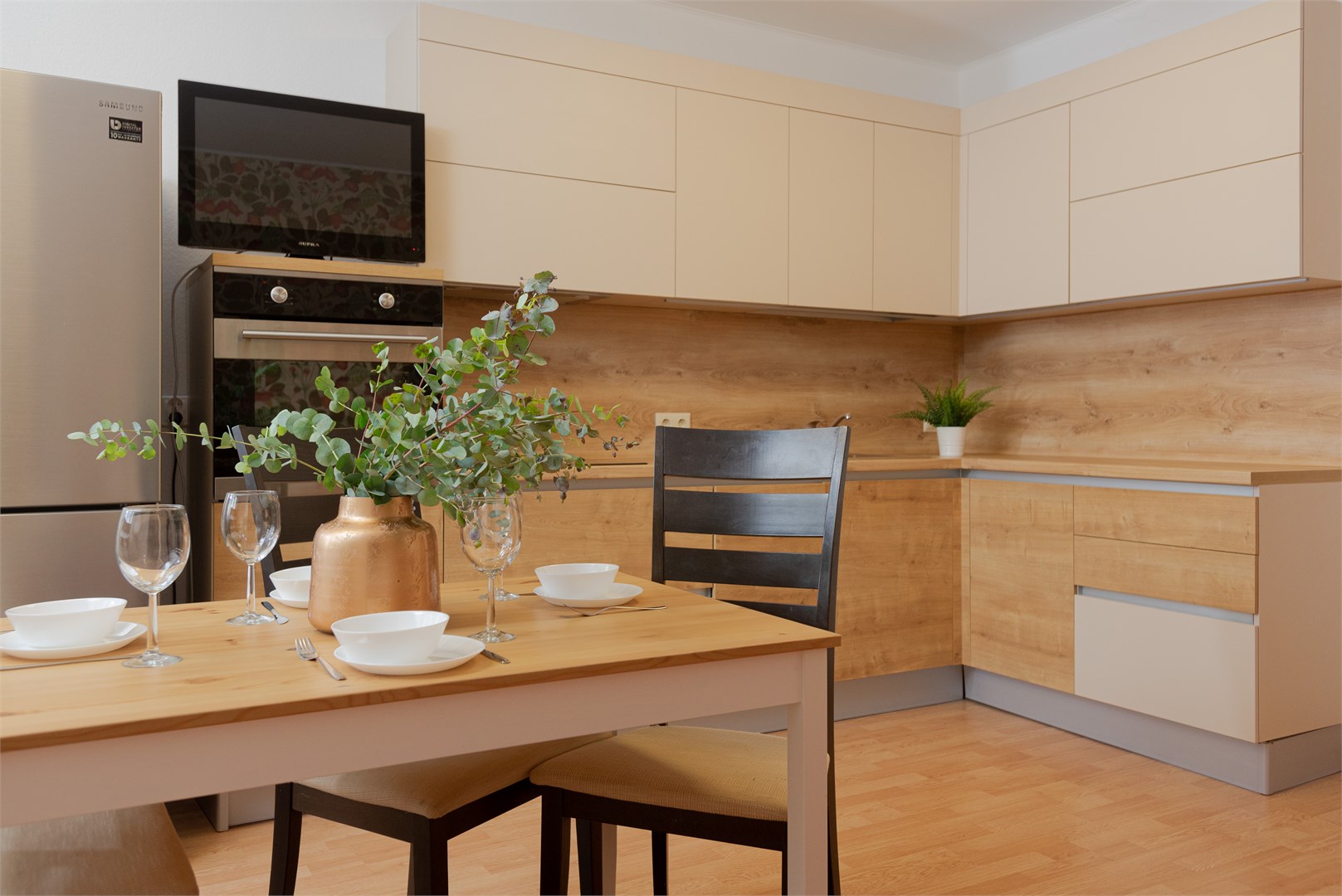 В номере: вешалка, диван раскладной, зеркало, кровать двуспальная, прикроватные тумбочки, стол, стулья, тумба под телевизор, шкаф, гладильная доска, духовой шкаф, микроволновая печь, набор посуды, плита электрическая, стиральная машина, сушилка для белья, телевизор, утюг, холодильник, электрочайник