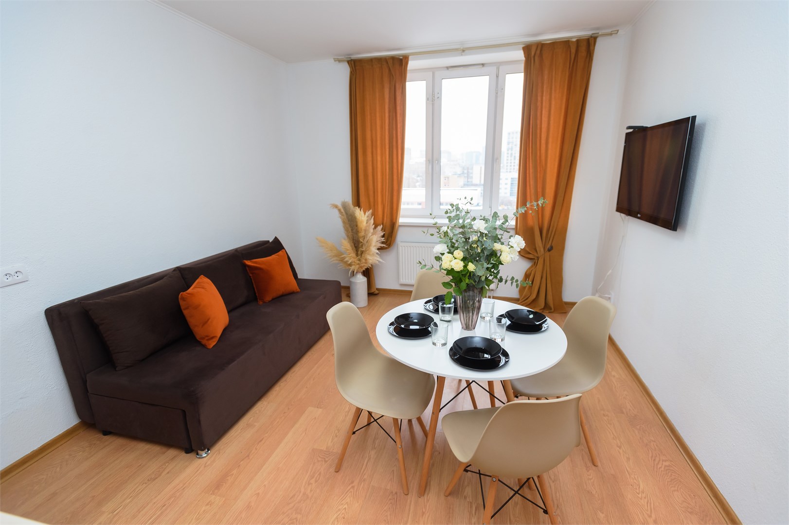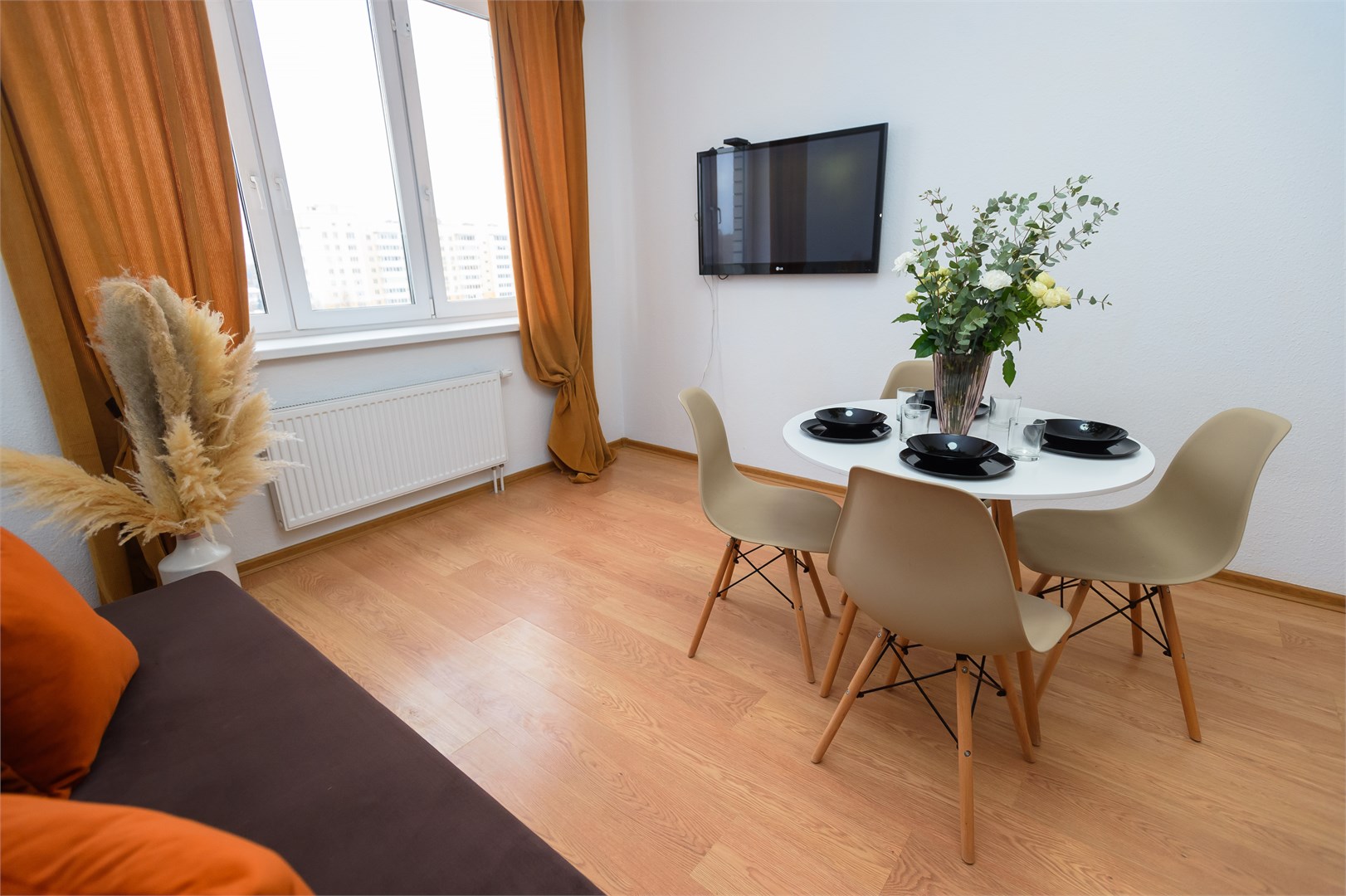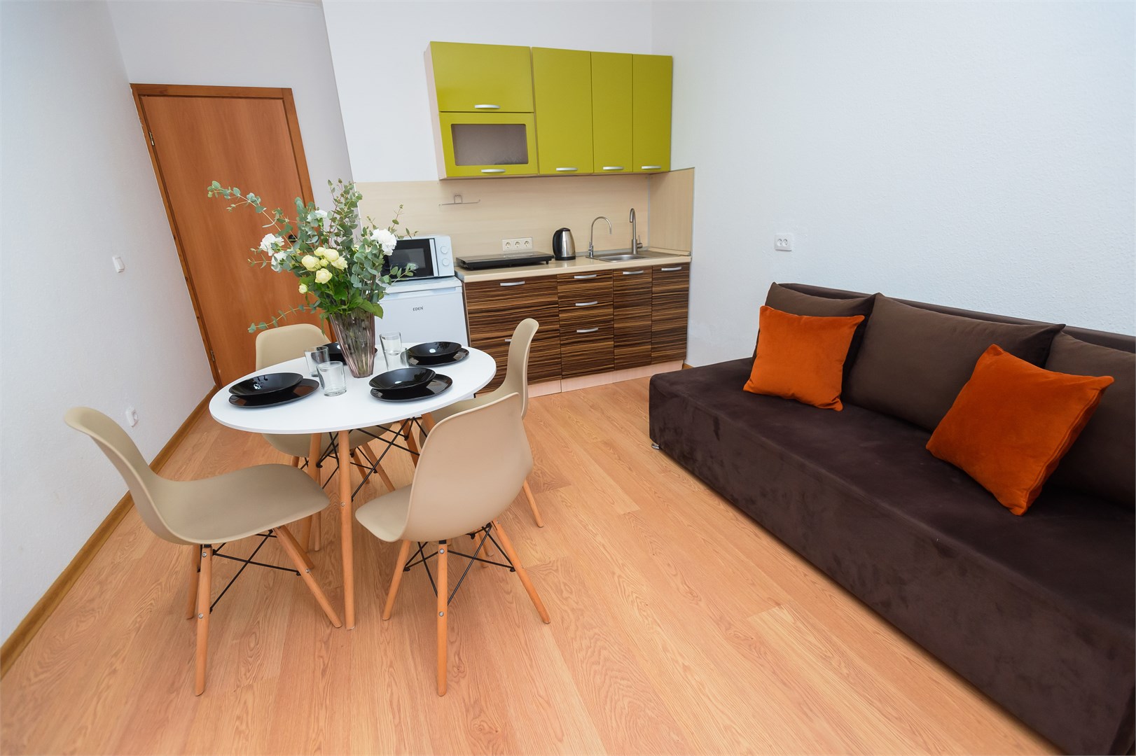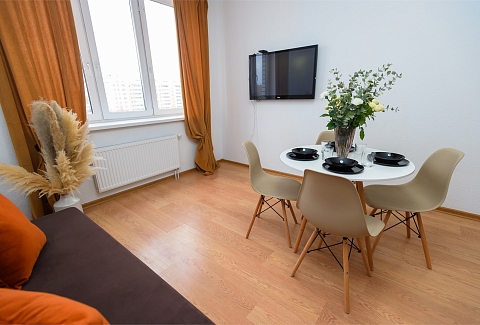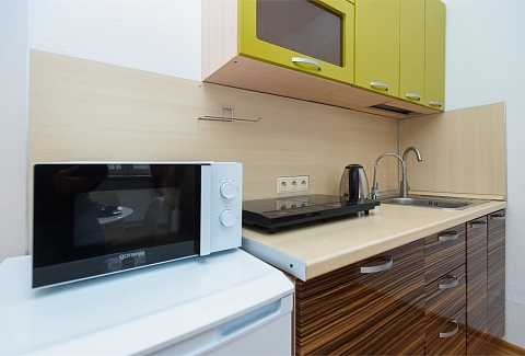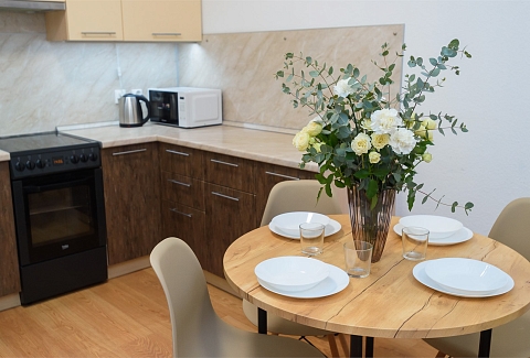 В номере: вешалка, диван раскладной, зеркало, комод, кровать двуспальная, стол, стулья, гладильная доска, микроволновая печь, мини-холодильник, набор посуды, плита электрическая, сушилка для белья, телевизор, утюг, электрочайник