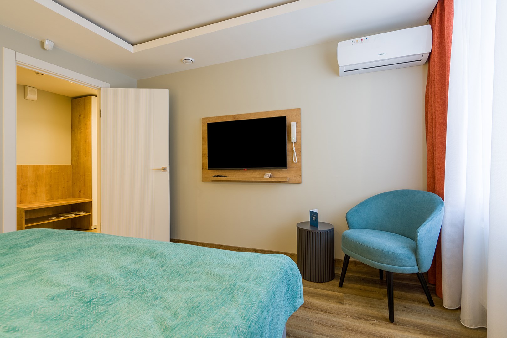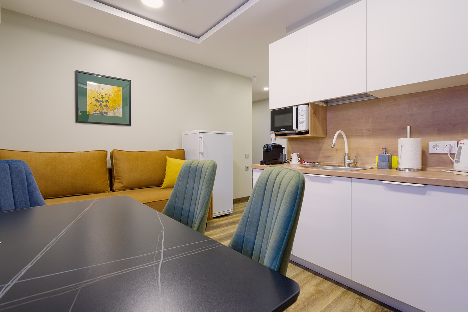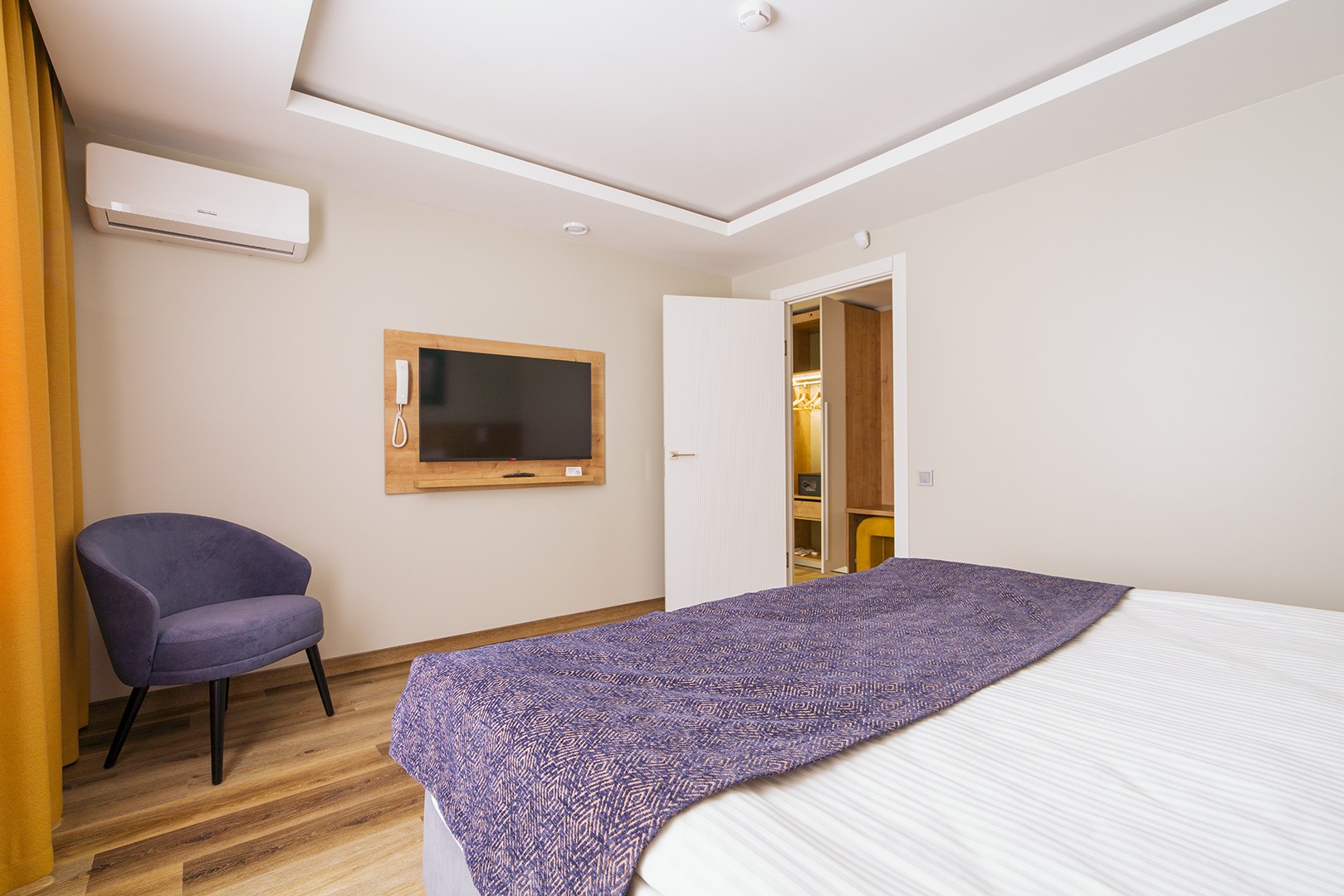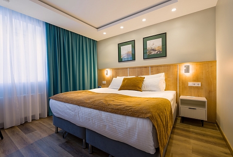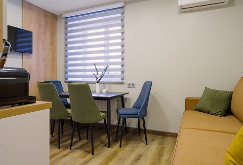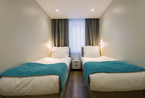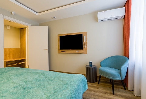 В номере: вешалка, диван раскладной, зеркало, кровати односпальные /одна двуспальная кровать, прикроватные тумбочки, стол, стулья, шкаф, гладильная доска, кондиционер, микроволновая печь, мини-холодильник, набор посуды, плита электрическая, посудомоечная машина, сейф, стиральная машина, сушилка для белья, телевизор, утюг, электрочайник