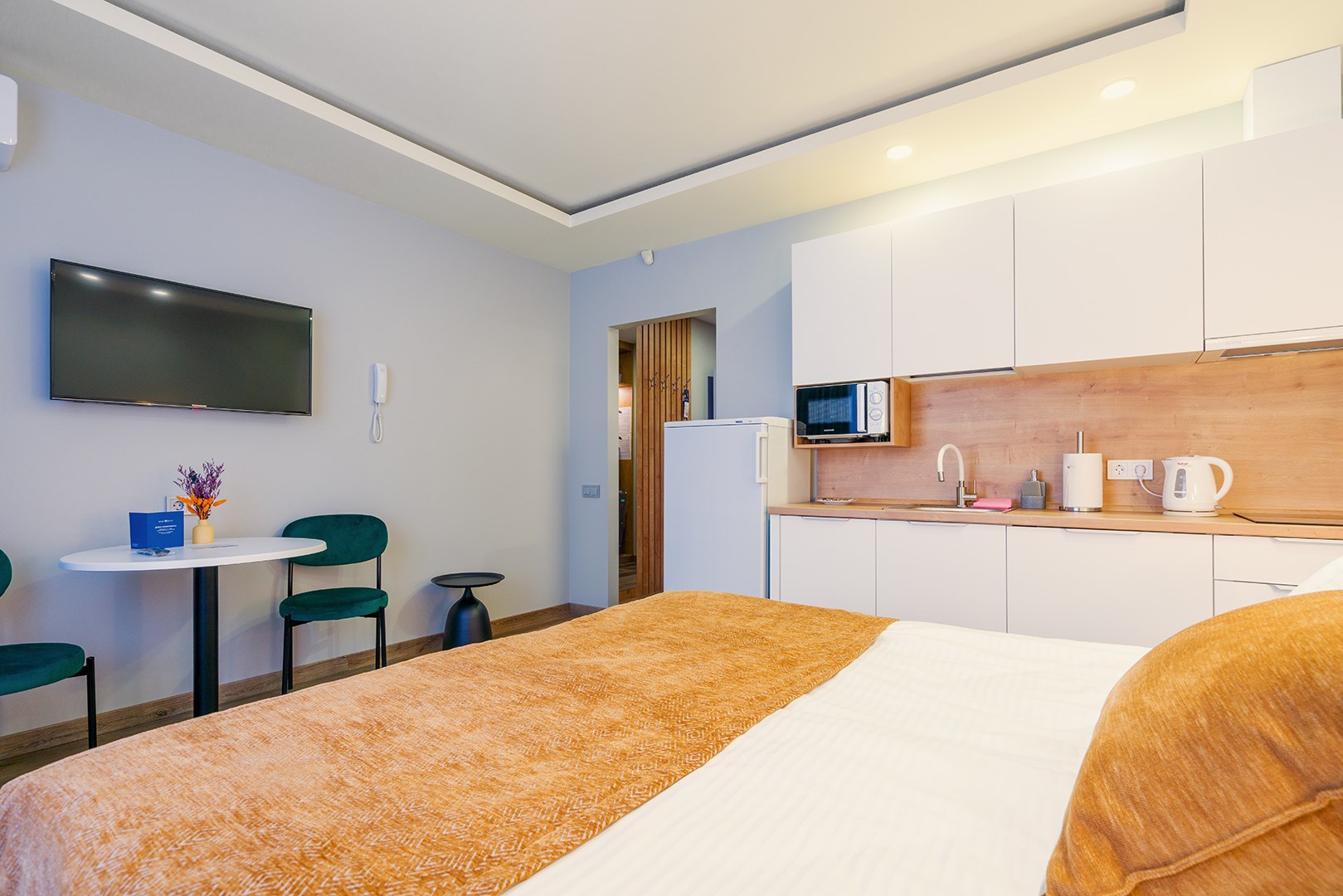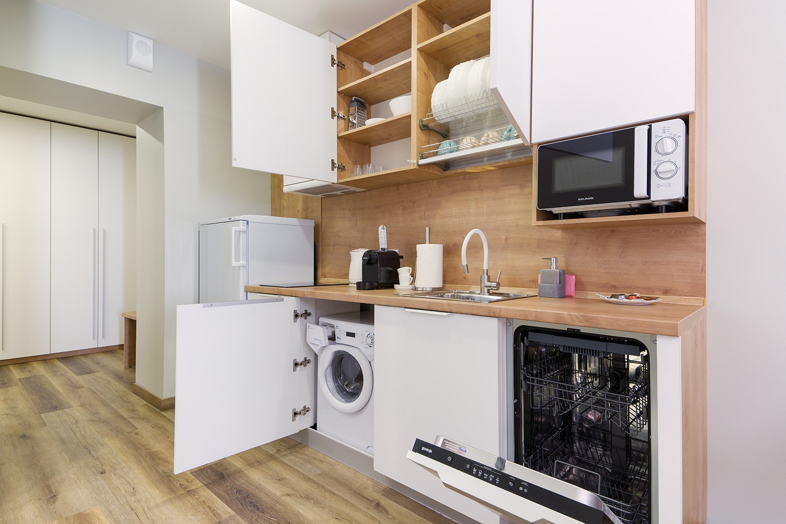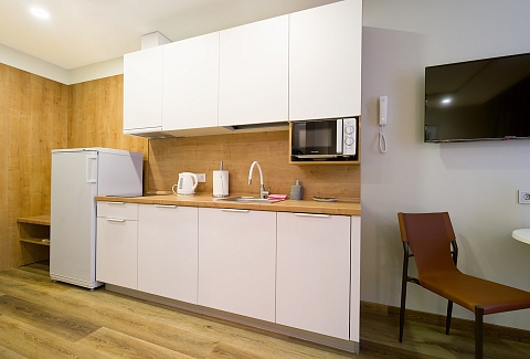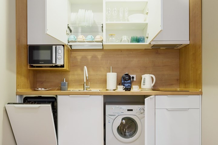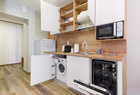В номере: вешалка, зеркало, кровати односпальные /одна двуспальная кровать, прикроватные тумбочки, стол, стулья, шкаф, гладильная доска, кондиционер, микроволновая печь, мини-холодильник, набор посуды, плита электрическая, посудомоечная машина, сейф, стиральная машина, сушилка для белья, телевизор, утюг, электрочайник