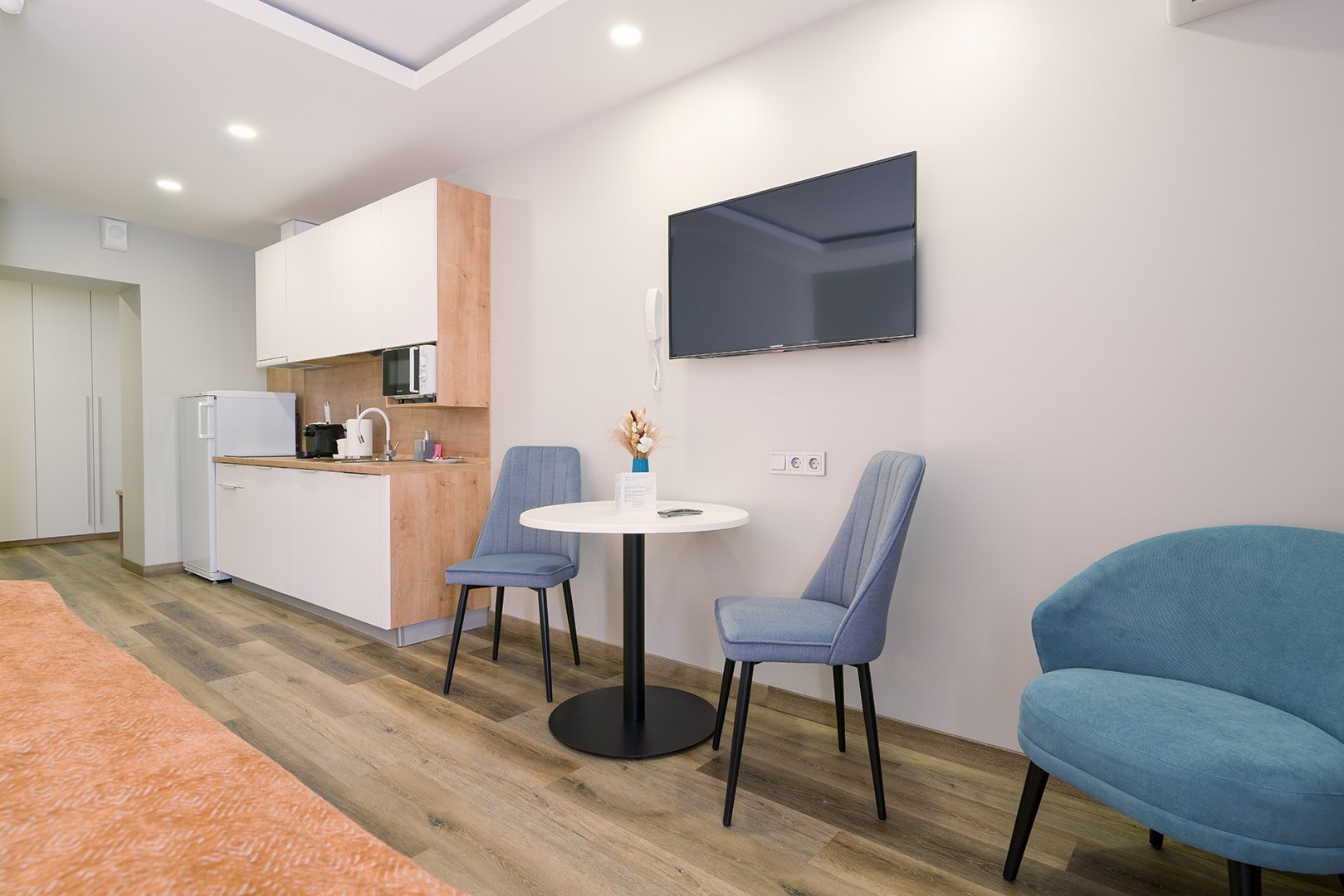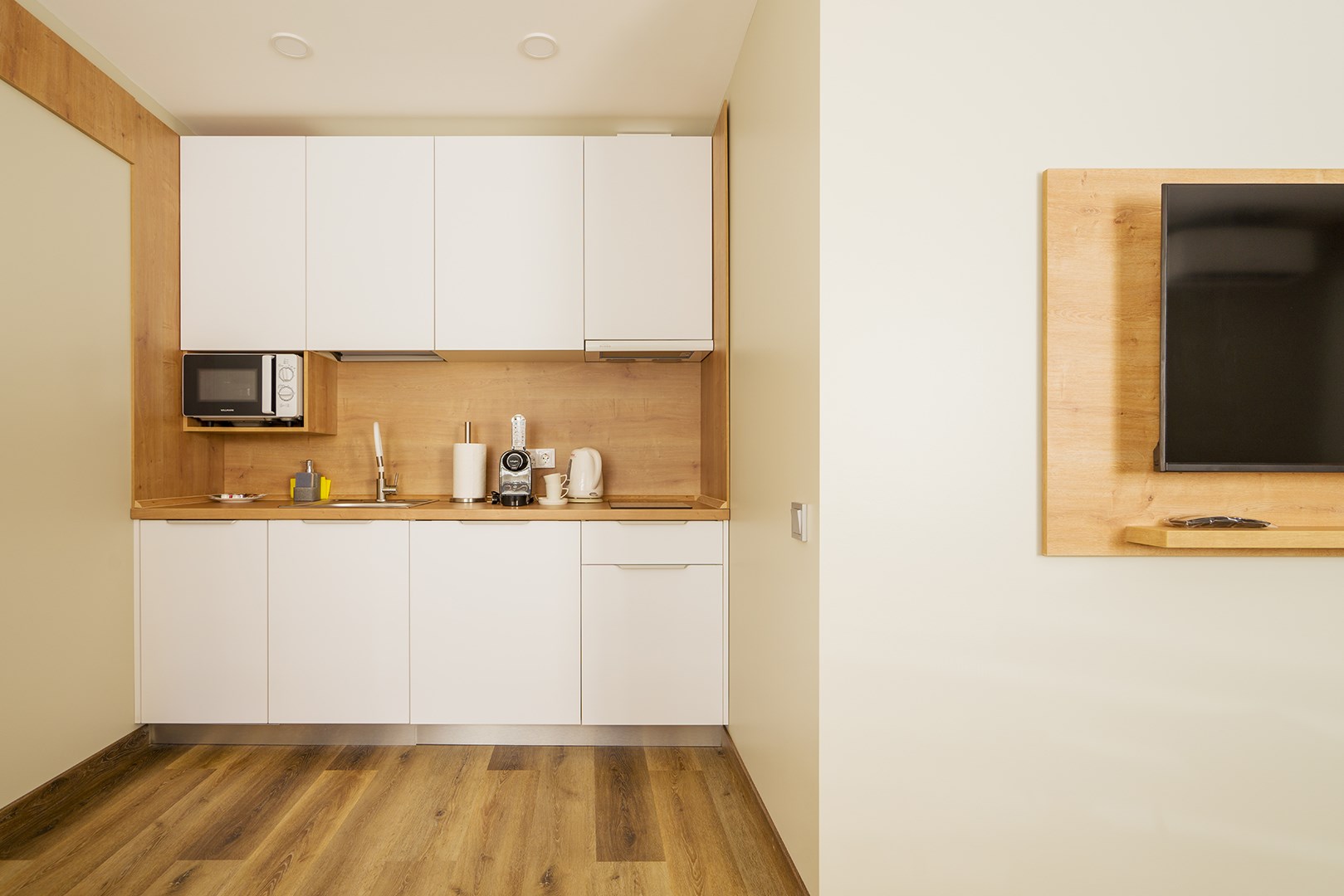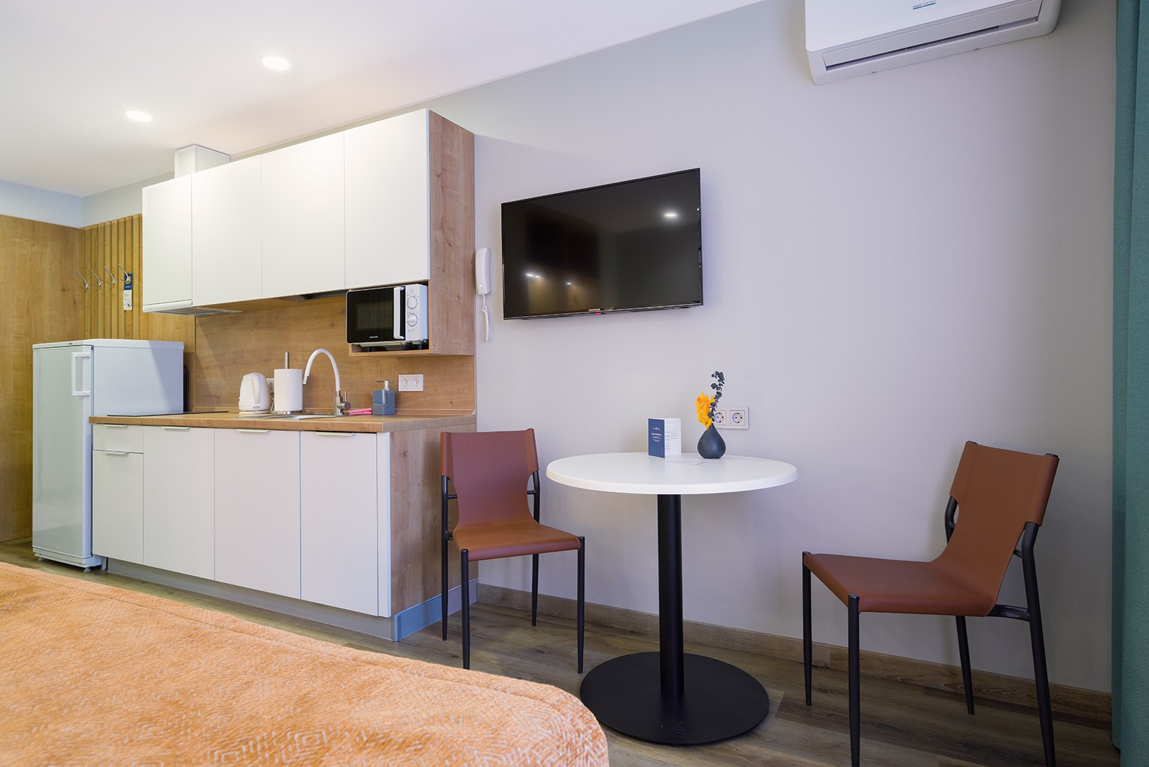 В номере: вешалка, зеркало, кровати односпальные /одна двуспальная кровать, прикроватные тумбочки, стол, стулья, шкаф, гладильная доска, кондиционер, микроволновая печь, мини-холодильник, набор посуды, плита электрическая, посудомоечная машина, сейф, стиральная машина, сушилка для белья, телевизор, утюг, электрочайник