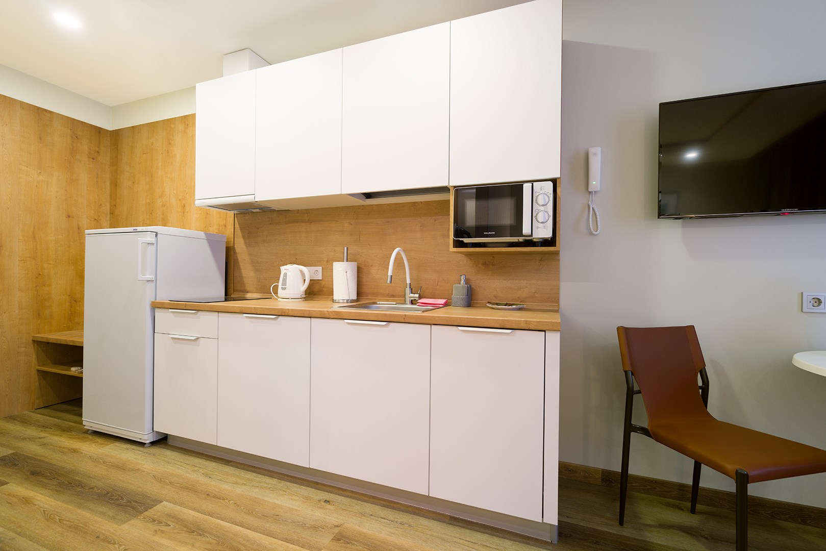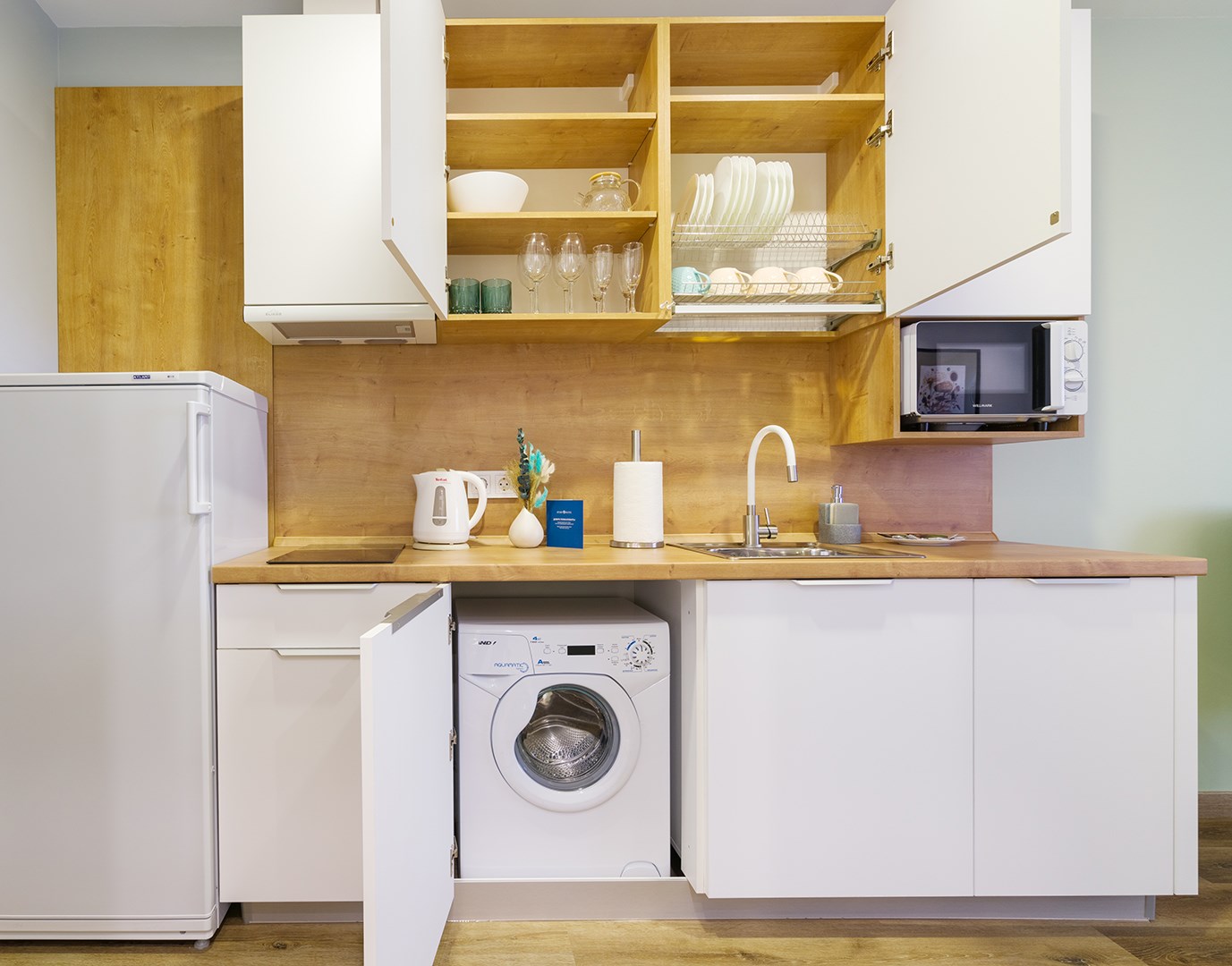 В номере: вешалка, зеркало, кровати односпальные /одна двуспальная кровать, прикроватные тумбочки, стол, стулья, шкаф, гладильная доска, микроволновая печь, набор посуды, плита электрическая, посудомоечная машина, сейф, стиральная машина, сушилка для белья, телевизор, утюг, холодильник, электрочайник