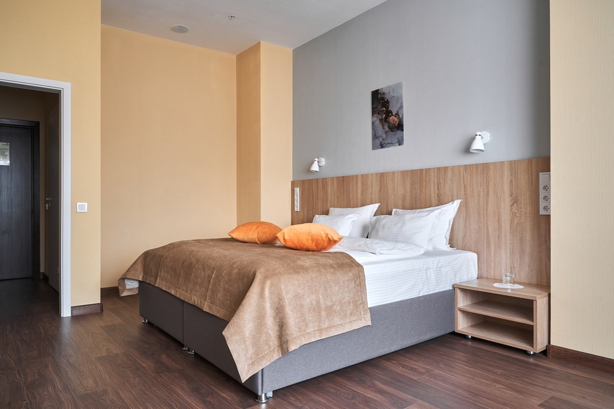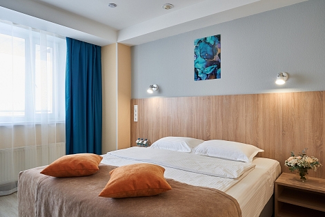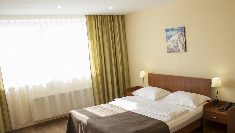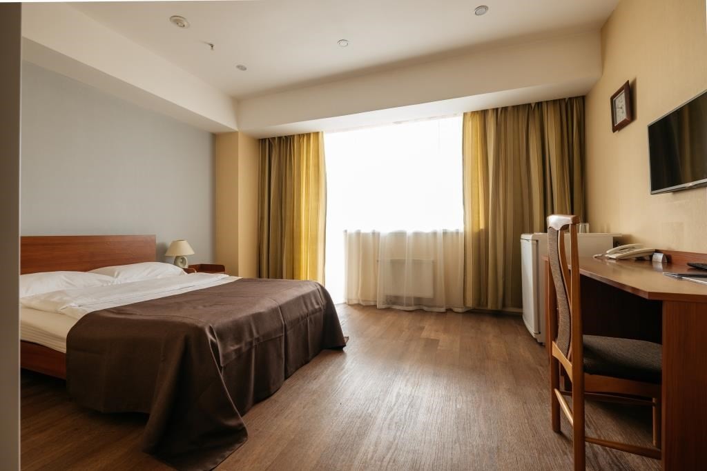 В номере: вешалка, зеркало, кровать двуспальная, прикроватные тумбочки, стол, стулья, шкаф, мини-холодильник, телевизор, телефон