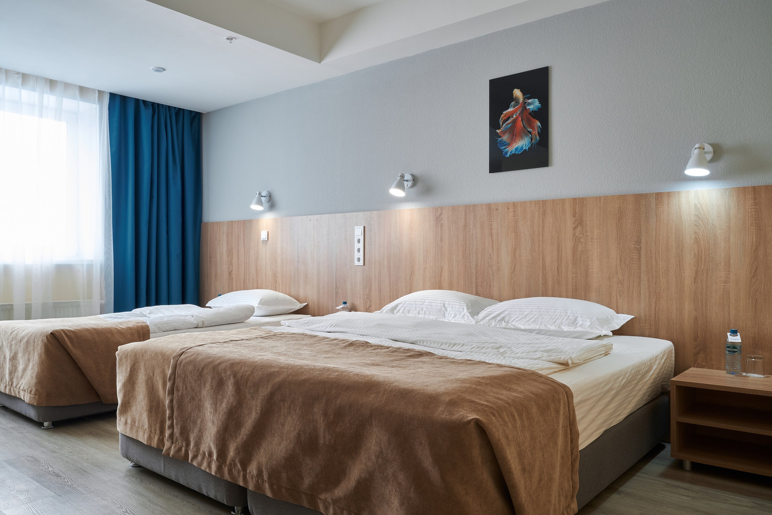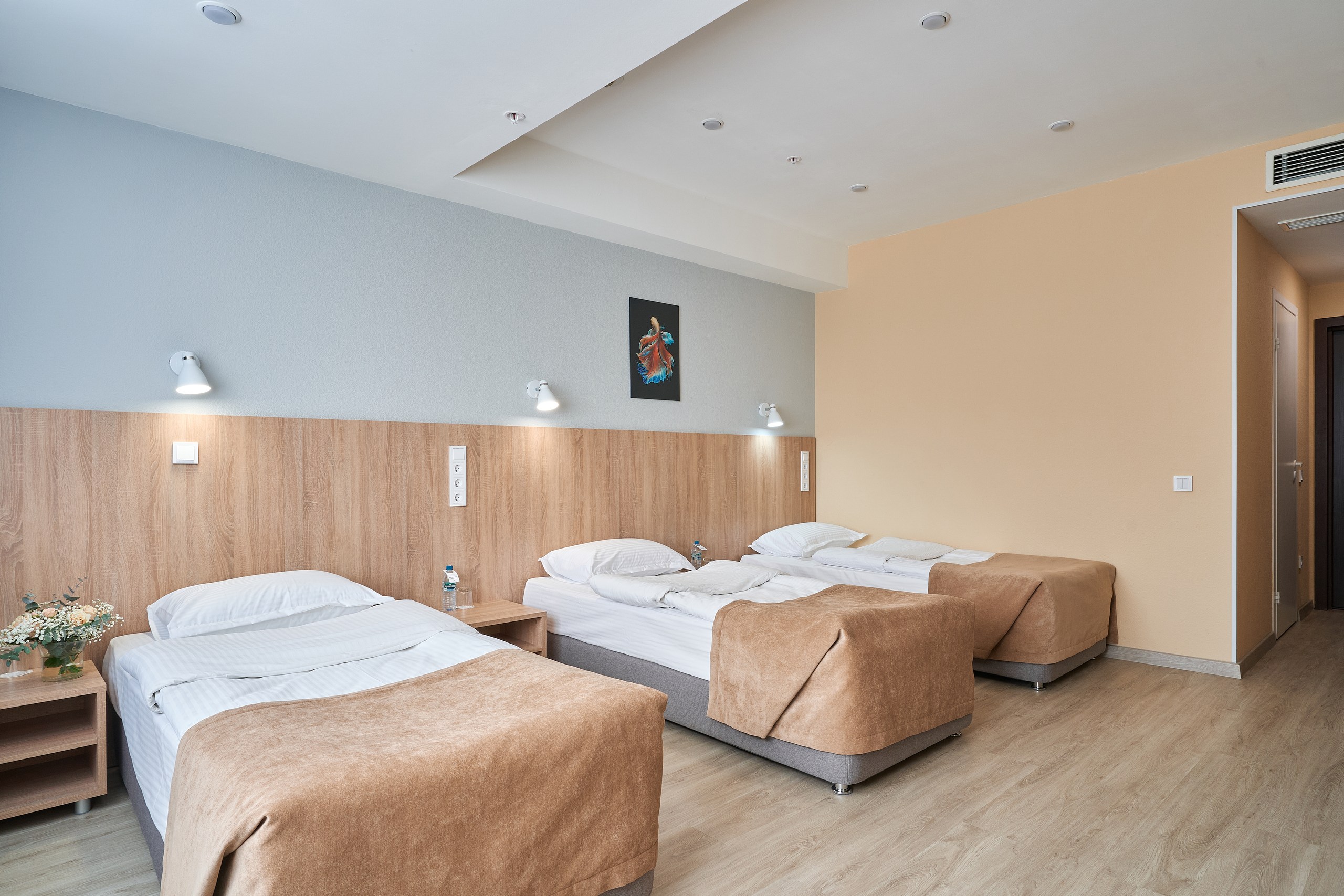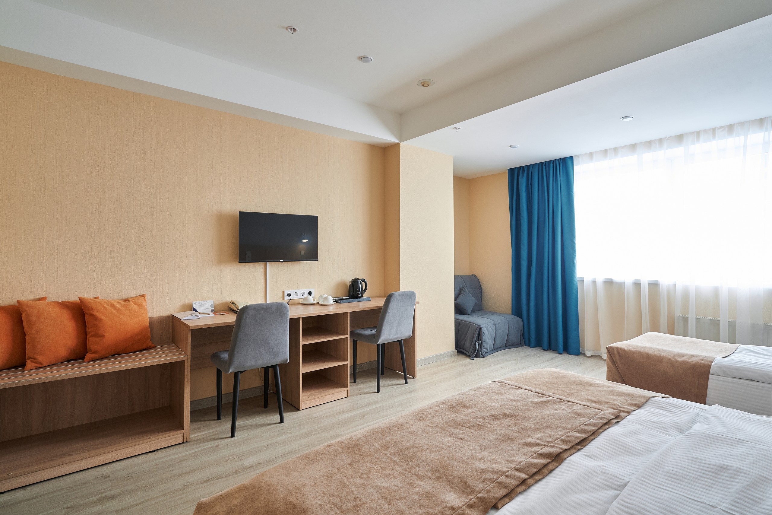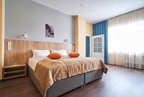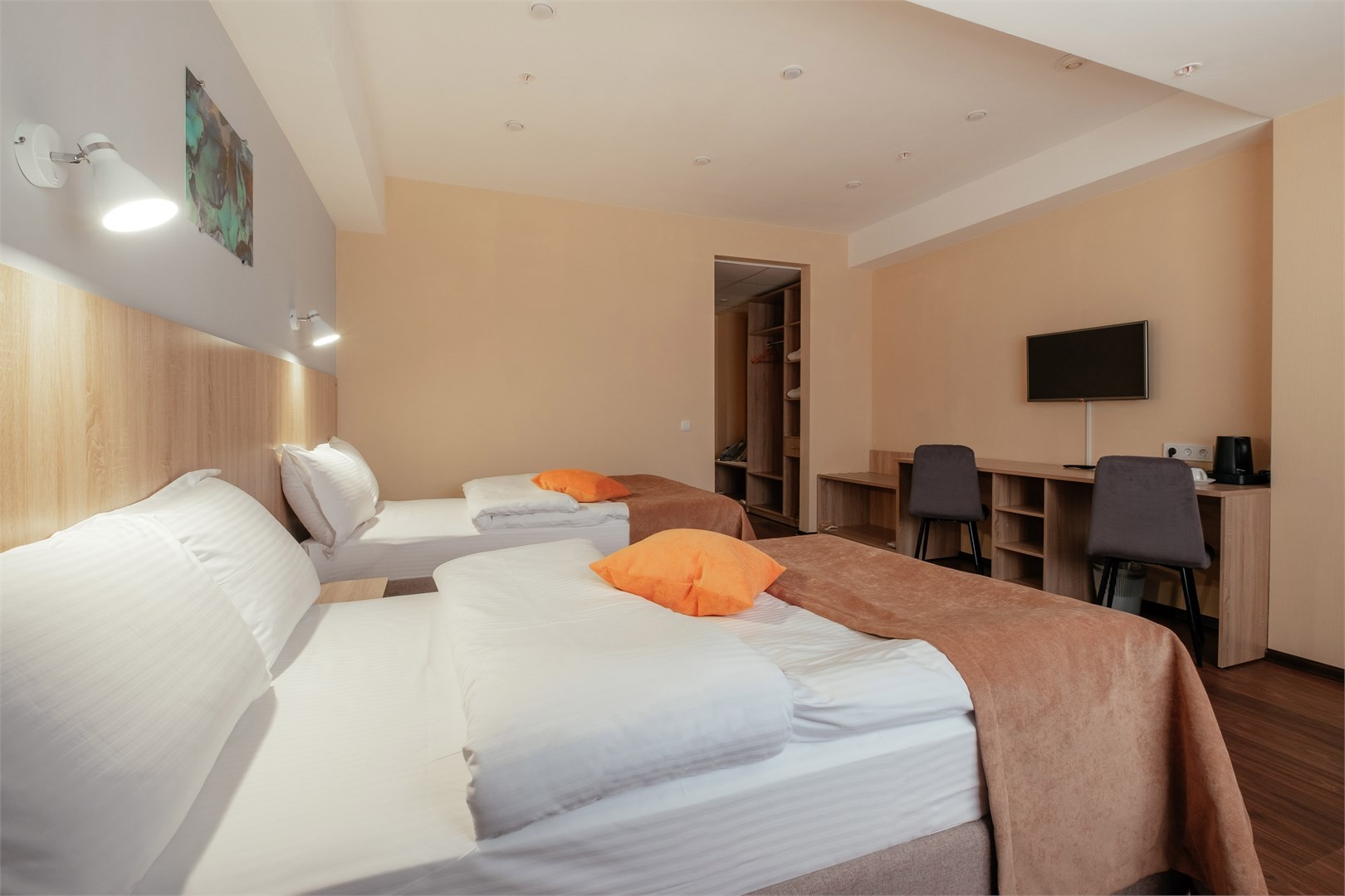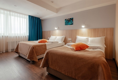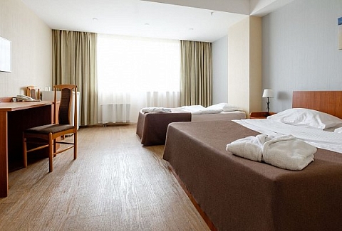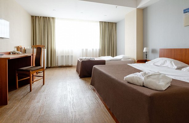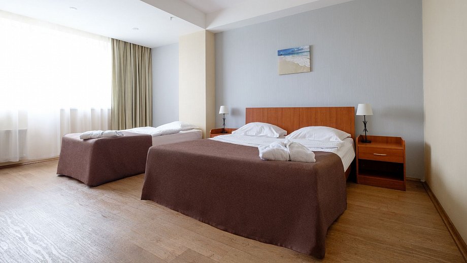 В номере: вешалка, зеркало, кровать двуспальная, кровать односпальная, прикроватные тумбочки, стол, стулья, шкаф, мини-холодильник, сплит-система, телевизор ЖК, телефон