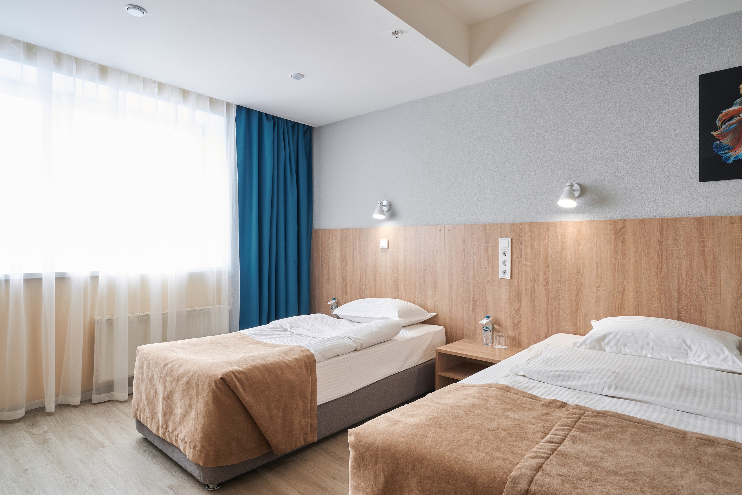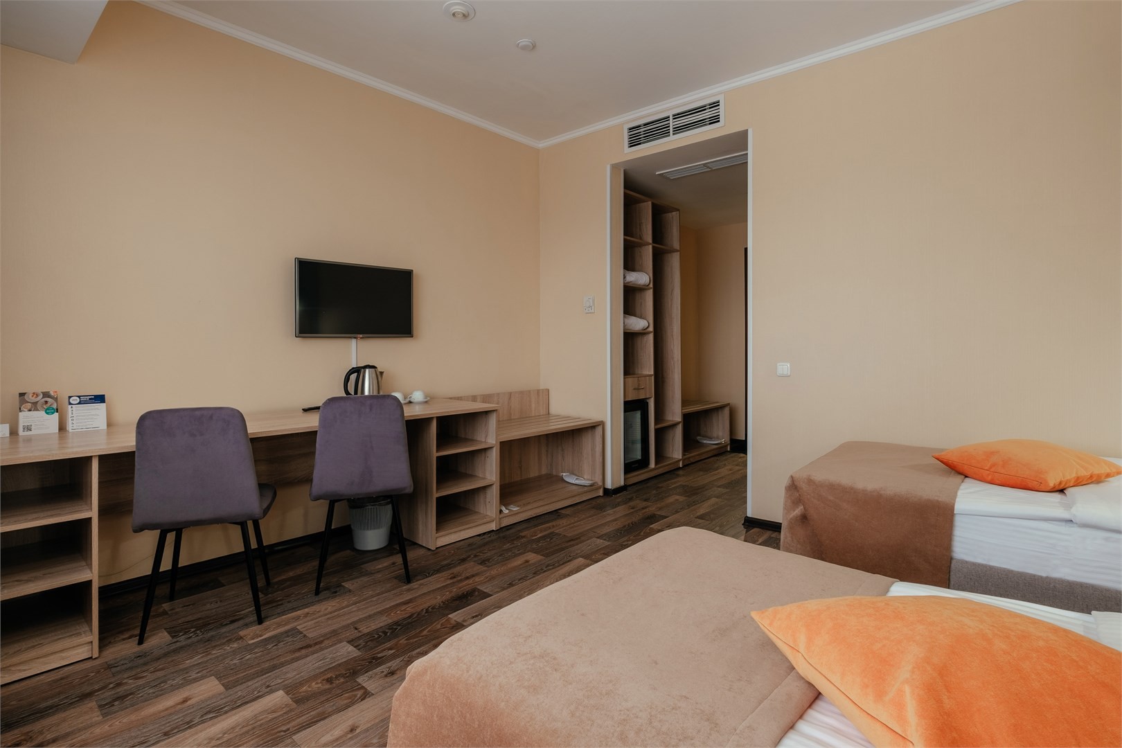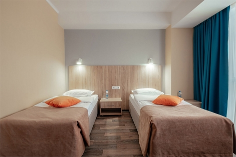 В номере: вешалка, зеркало, кровати односпальные, прикроватные тумбочки, стол, стулья, шкаф, мини-холодильник, телевизор ЖК, телефон