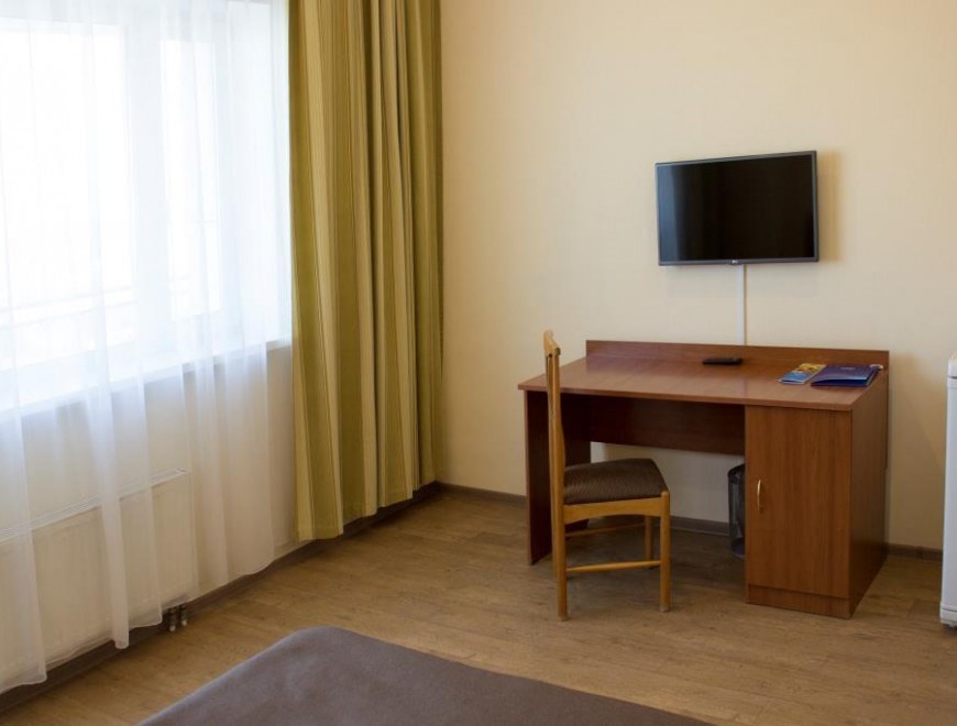 В номере: вешалка, зеркало, кровать полутороспальная, прикроватные тумбочки, стол, стулья, шкаф, мини-холодильник, телевизор ЖК, телефон