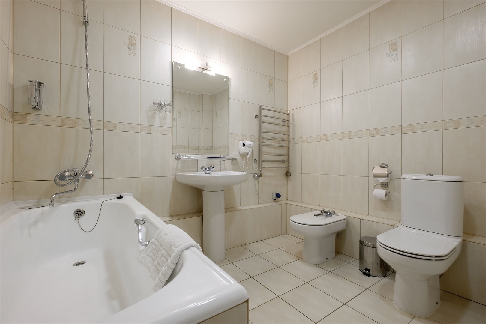 Санузел: биде, с ванной, тапочки, туалетные принадлежности, фен, халат