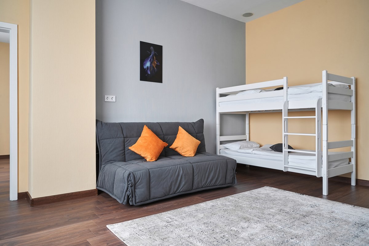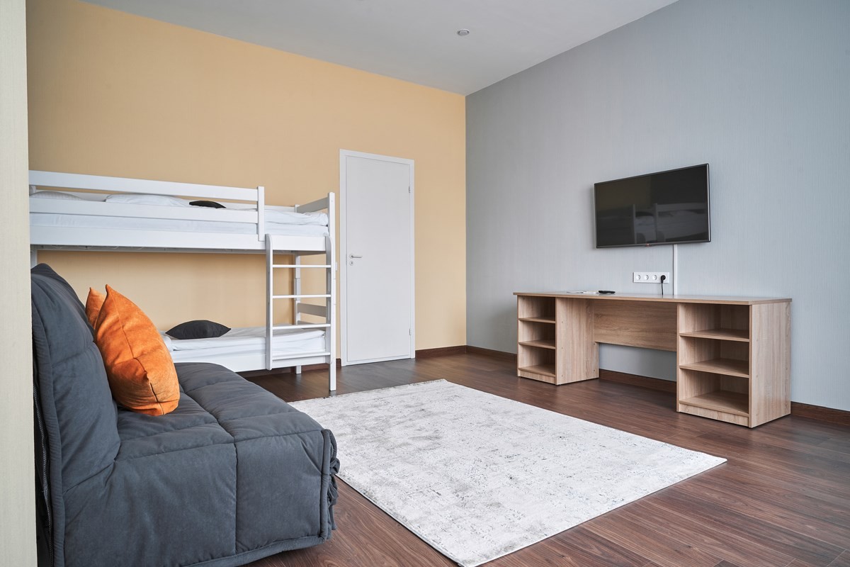 В номере: вешалка, диван раскладной, зеркало, кровать двуспальная, кровать двухъярусная, прикроватные тумбочки, стол, стулья, шкаф, мини-холодильник, телевизор, телефон