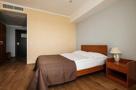 В номере: вешалка, диван, зеркало, кресло, кровать двуспальная, прикроватные тумбочки, стол, стулья, шкаф, мини-холодильник, телевизор, телефон
