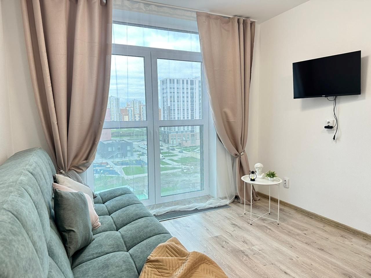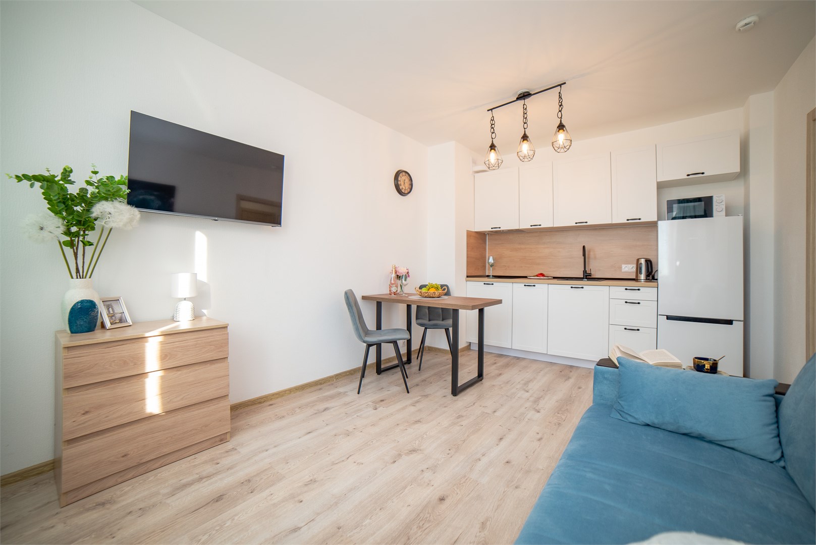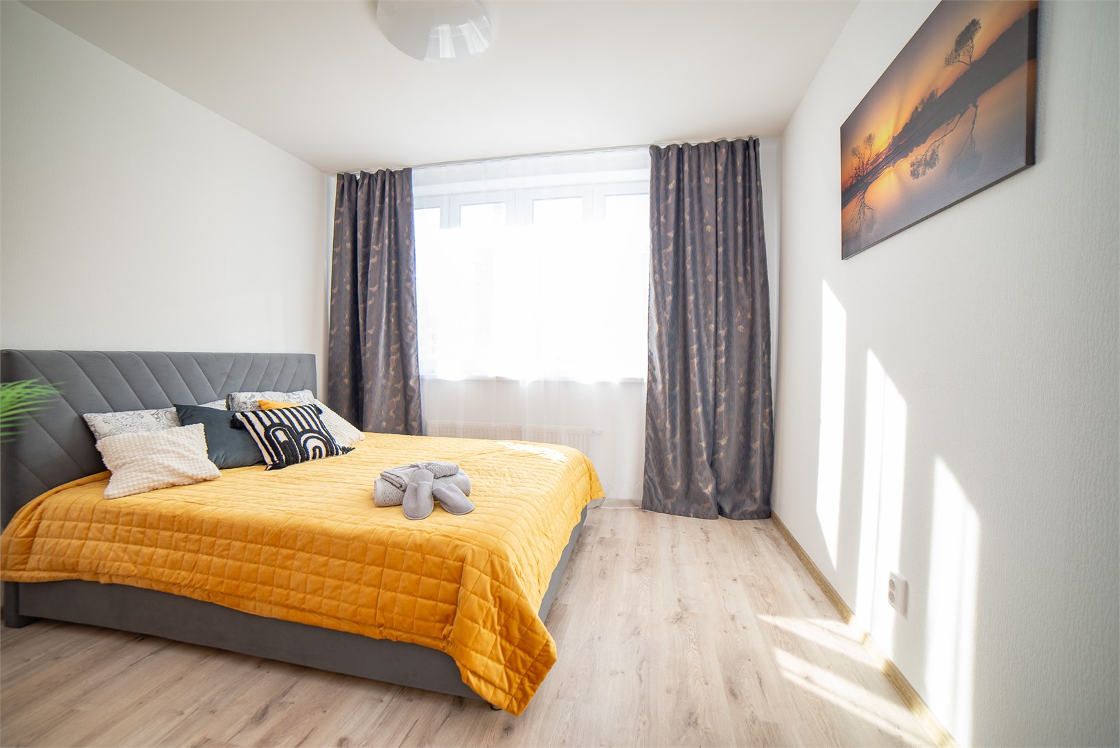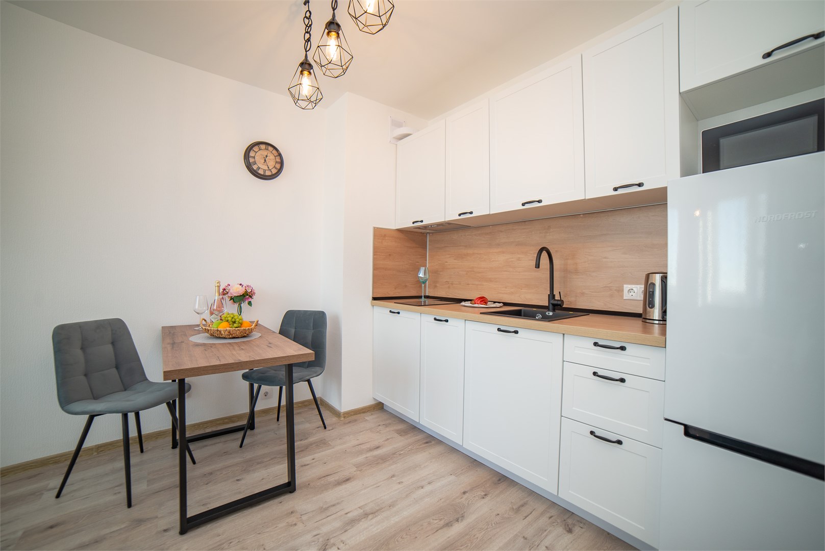 В номере: вешалка, диван раскладной, зеркало, комод, кровать двуспальная, стол, стулья, шкаф, гладильная доска, микроволновая печь, набор посуды, плита электрическая, стиральная машина, сушилка для белья, телевизор, утюг, холодильник, электрочайник