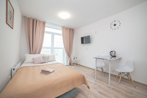 В номере: вешалка, диван раскладной, зеркало, стол, стулья, шкаф, гладильная доска, набор посуды, плита электрическая, стиральная машина, сушилка для белья, телевизор, утюг, холодильник, электрочайник