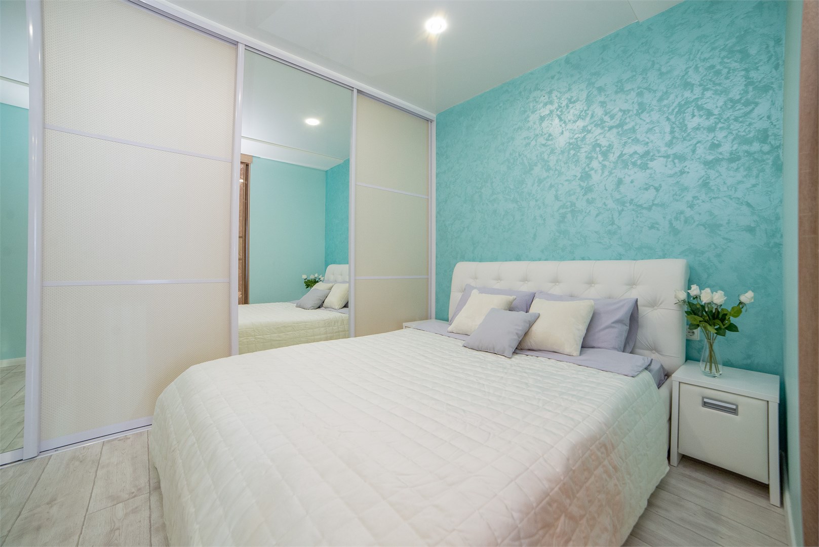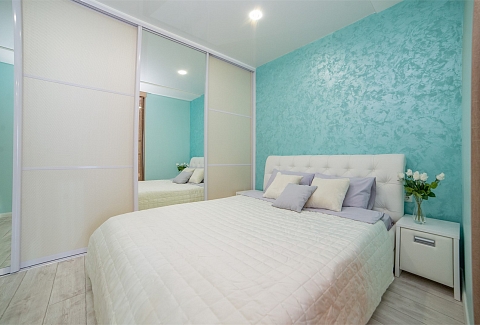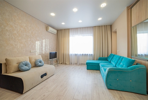 В номере: вешалка, диван раскладной, зеркало, кровать двуспальная, прикроватные тумбочки, стол, стулья, шкаф, гладильная доска, духовой шкаф, кондиционер, мини-холодильник, набор посуды, плита электрическая, стиральная машина, сушилка для белья, телевизор, утюг, холодильник, электрочайник