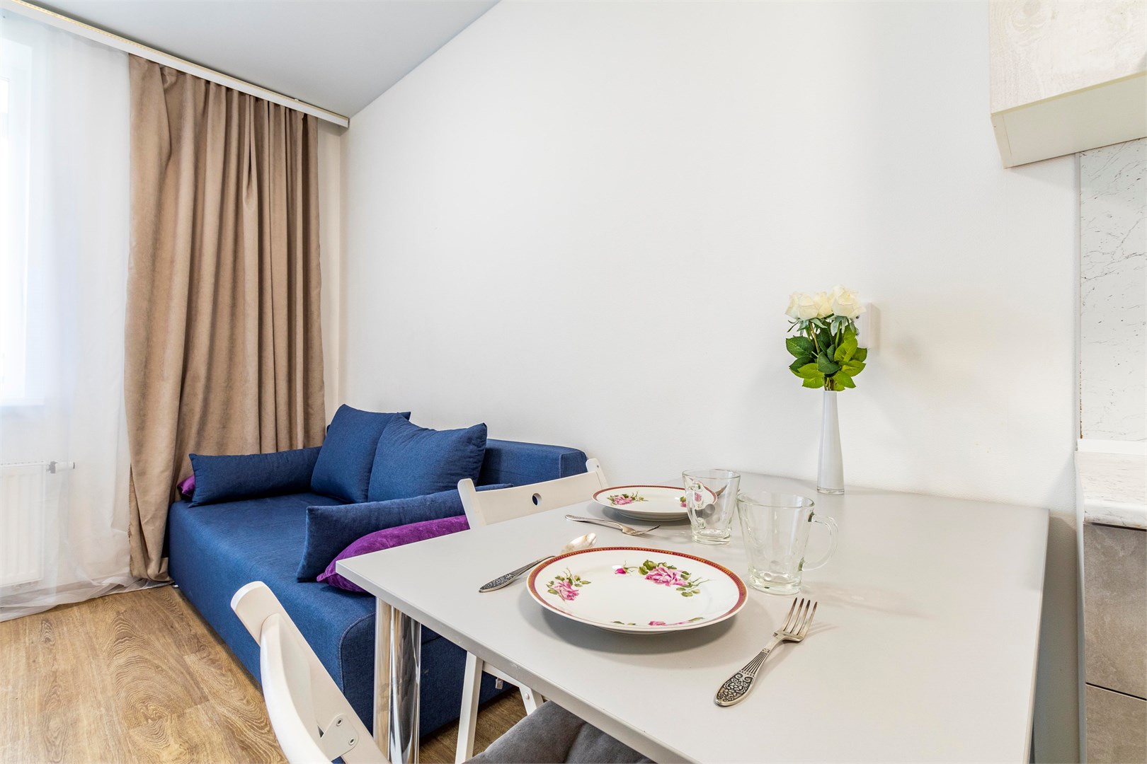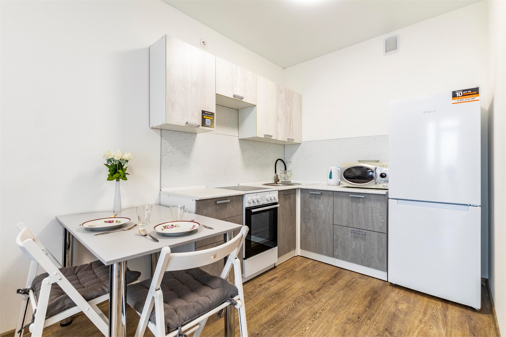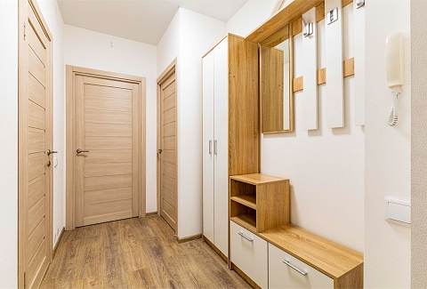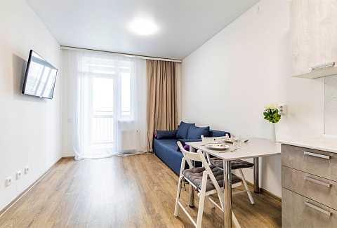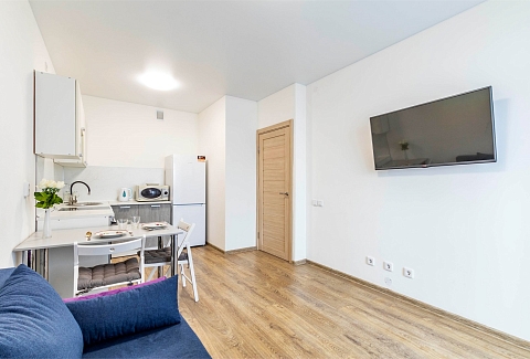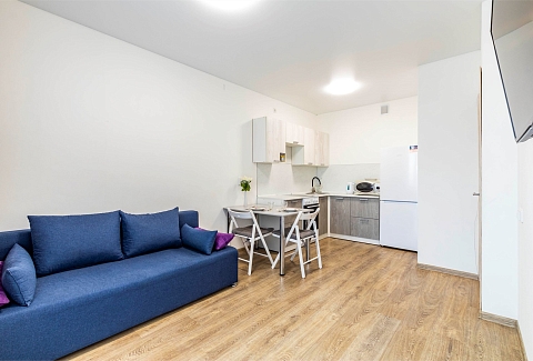 В номере: вешалка, диван раскладной, зеркало, кровать двуспальная, стол, стулья, шкаф, гладильная доска, духовой шкаф, микроволновая печь, набор посуды, плита электрическая, стиральная машина, сушилка для белья, телевизор, утюг, холодильник, электрочайник