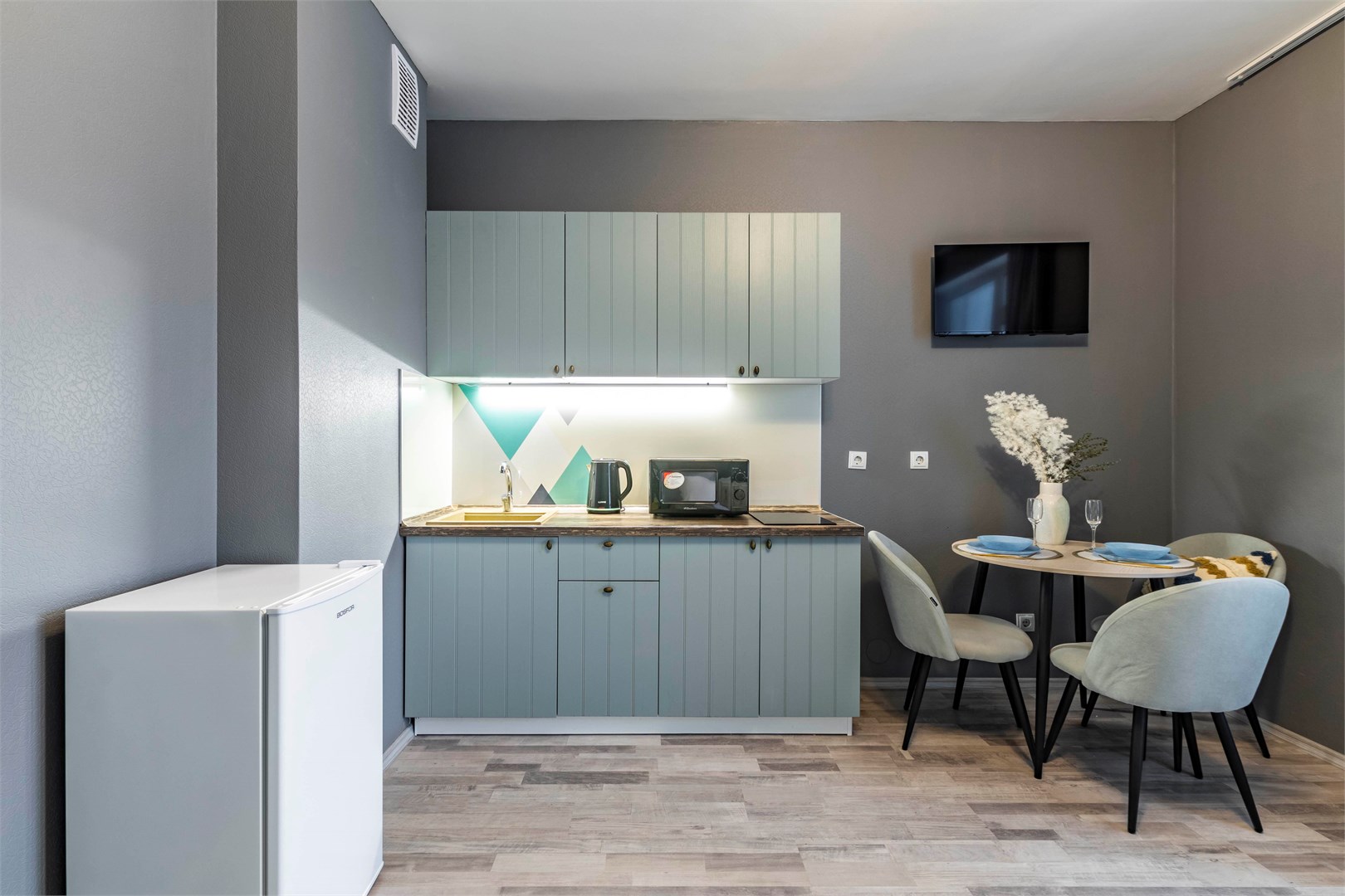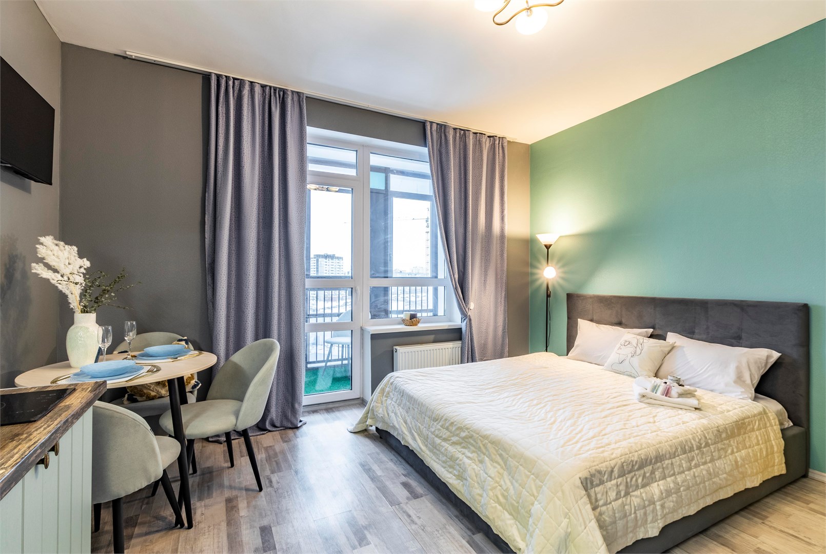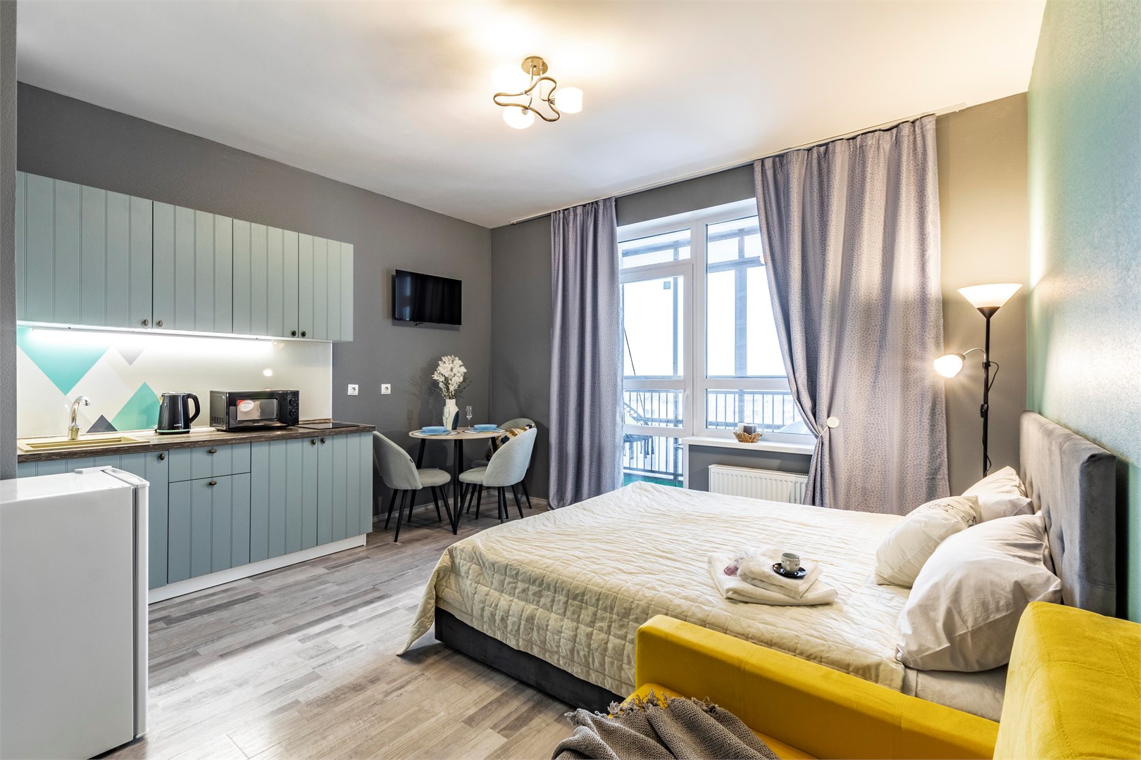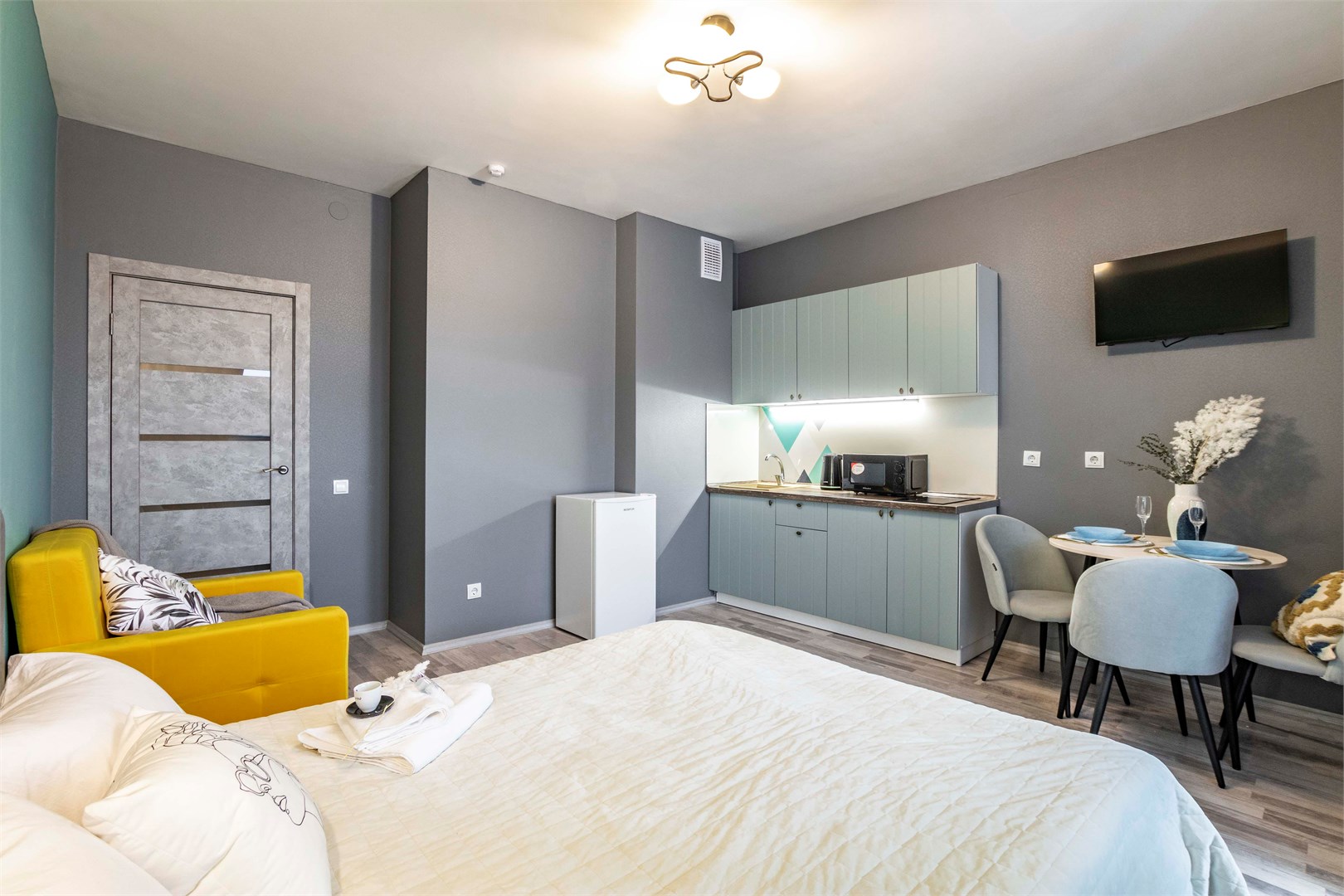 В номере: вешалка, кресло-кровать, кровать двуспальная, стол, стулья, гладильная доска, микроволновая печь, мини-холодильник, набор посуды, плита электрическая, стиральная машина, сушилка для белья, телевизор, утюг, электрочайник