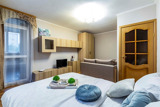 В номере: вешалка, диван раскладной, зеркало, кровать двуспальная, стол, стулья, шкаф, гладильная доска, духовой шкаф, кондиционер, микроволновая печь, набор посуды, плита электрическая, стиральная машина, сушилка для белья, телевизор, утюг, холодильник, электрочайник