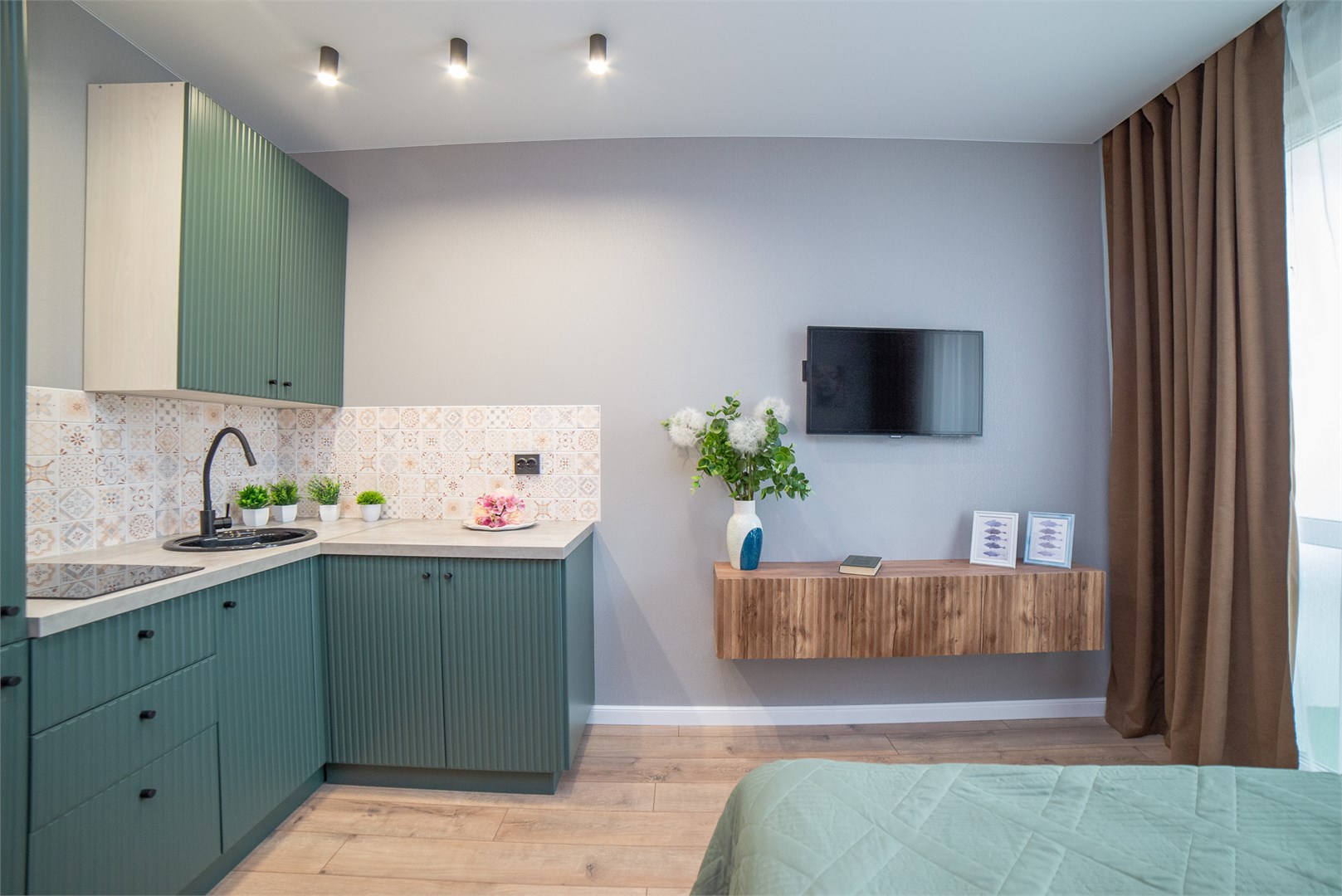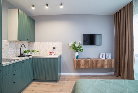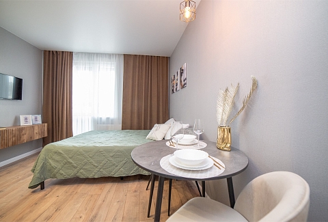 В номере: вешалка, зеркало, кровать двуспальная, стол, стулья, тумба, шкаф, гладильная доска, микроволновая печь, набор посуды, плита электрическая, стиральная машина, сушилка для белья, телевизор, утюг, холодильник, электрочайник