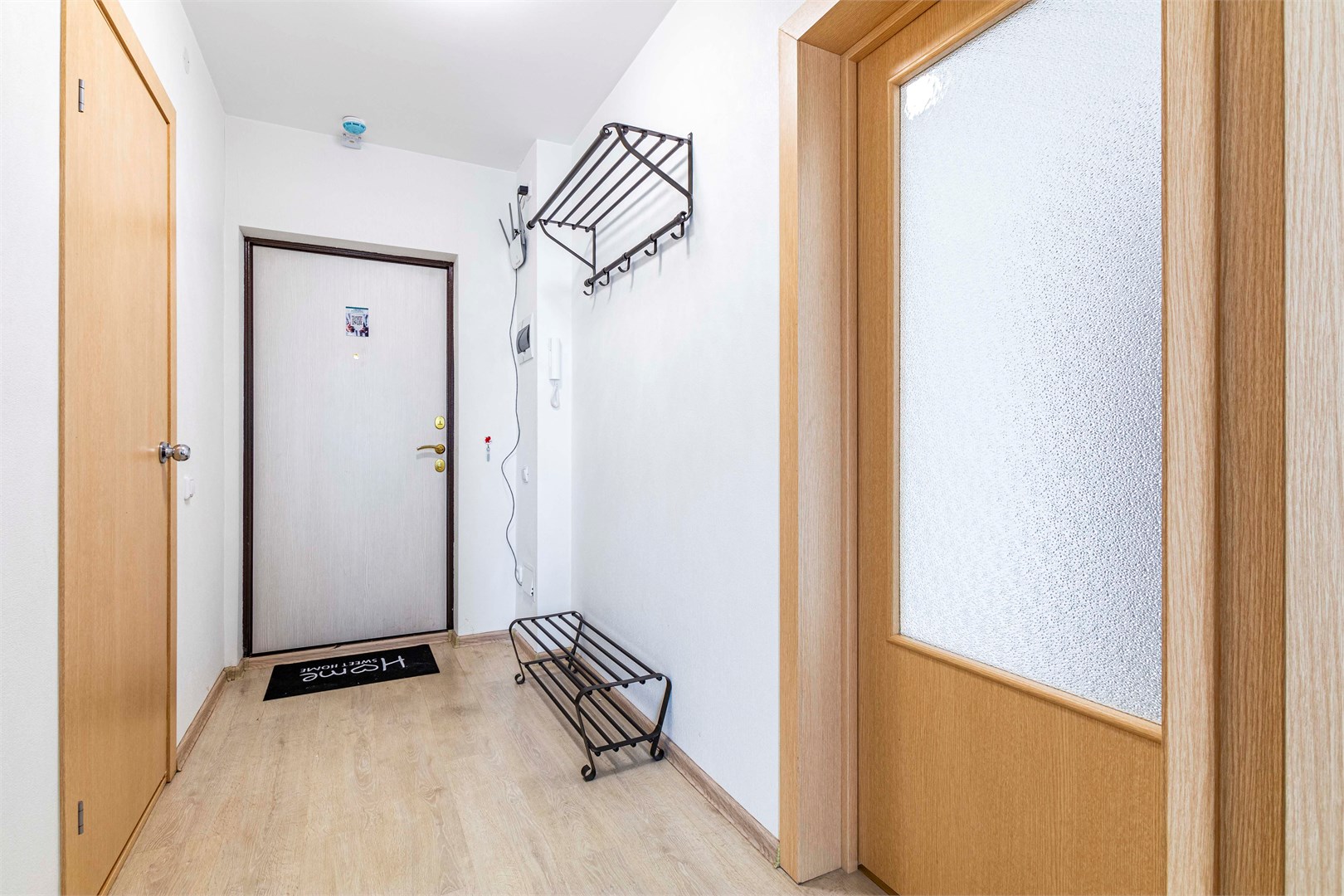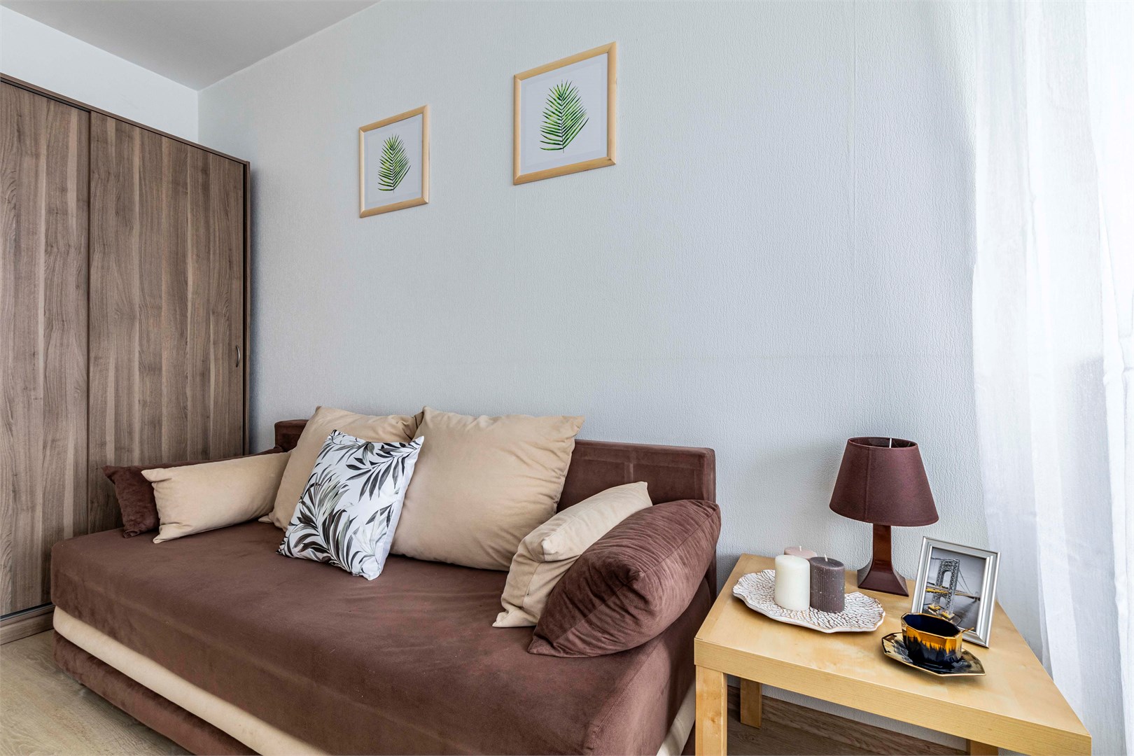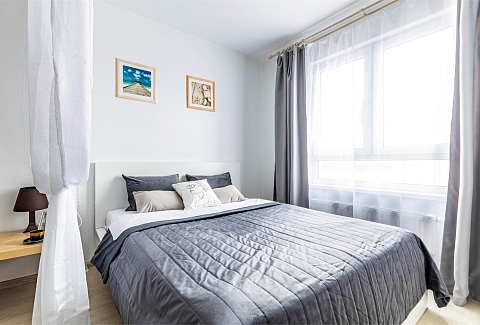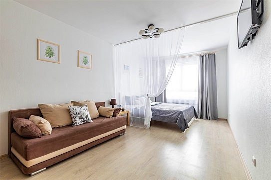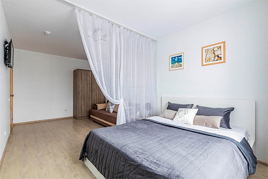В номере: вешалка, диван раскладной, зеркало, кровать двуспальная, стол, стулья, шкаф, гладильная доска, духовой шкаф, микроволновая печь, набор посуды, плита электрическая, стиральная машина, сушилка для белья, телевизор, утюг, холодильник, электрочайник
