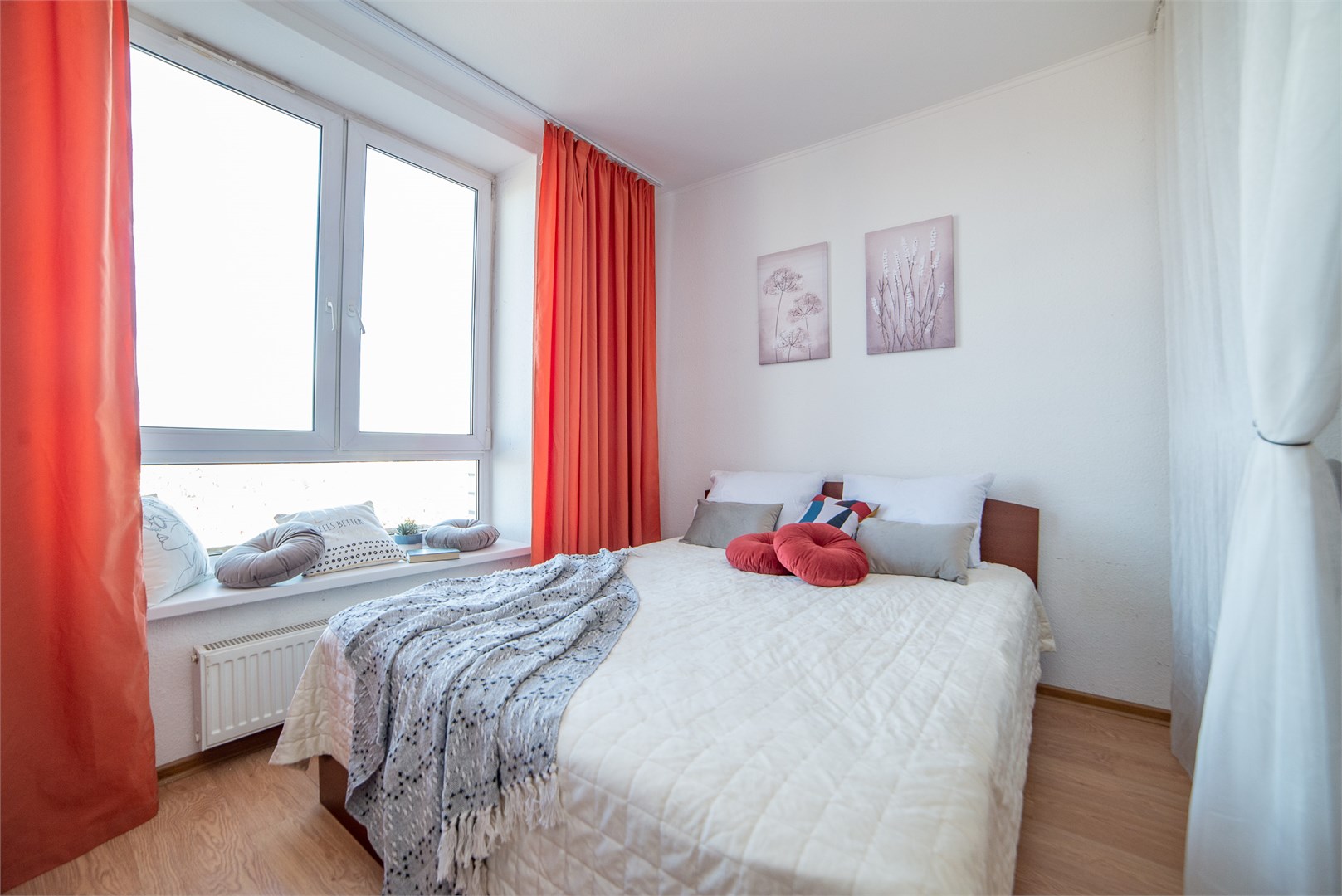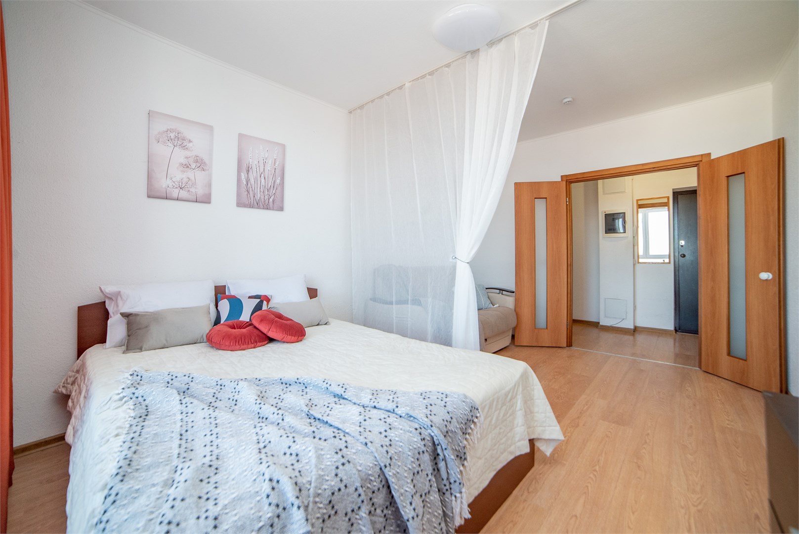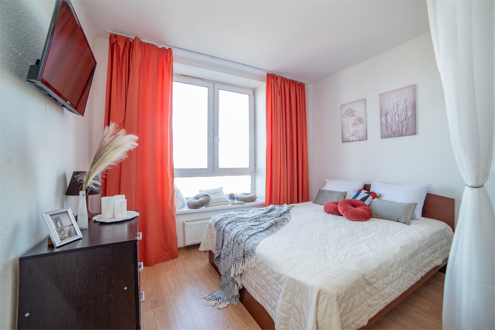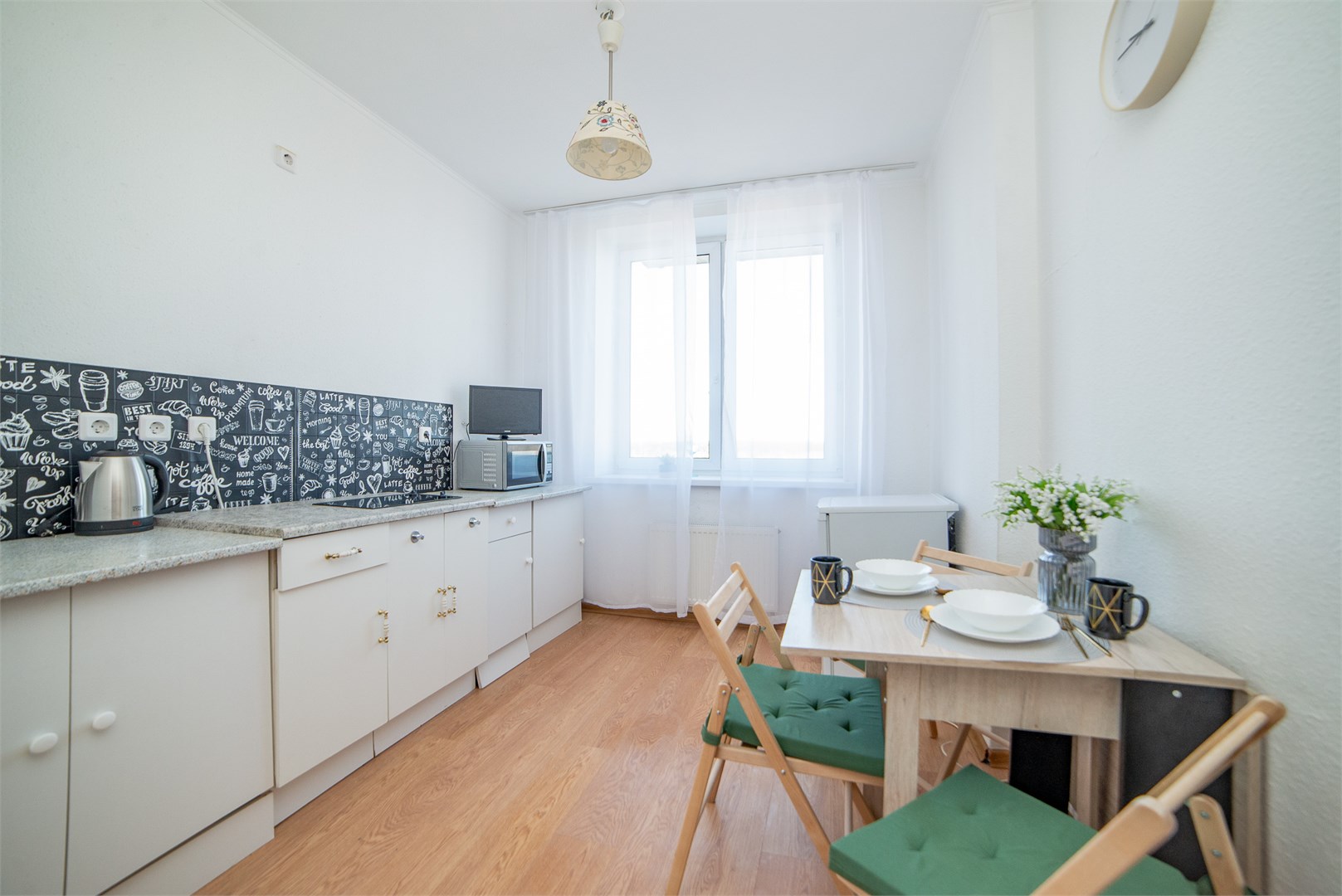 В номере: вешалка, диван раскладной, зеркало, комод, кровать двуспальная, стол, стулья, шкаф, гладильная доска, кондиционер, микроволновая печь, мини-холодильник, набор посуды, плита электрическая, стиральная машина, сушилка для белья, телевизор, утюг, холодильник, электрочайник