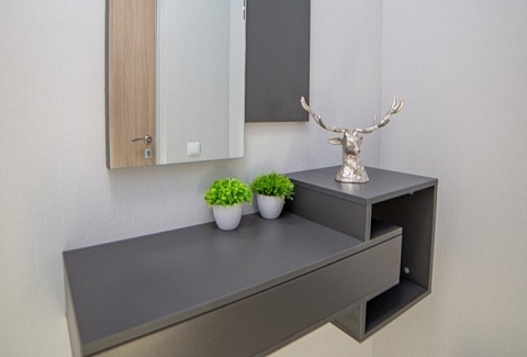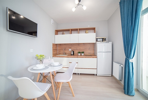 В номере: вешалка, диван раскладной, зеркало, комод, кровать двуспальная, стол, стулья, шкаф, гладильная доска, микроволновая печь, набор посуды, плита электрическая, стиральная машина, сушилка для белья, телевизор, утюг, холодильник, электрочайник