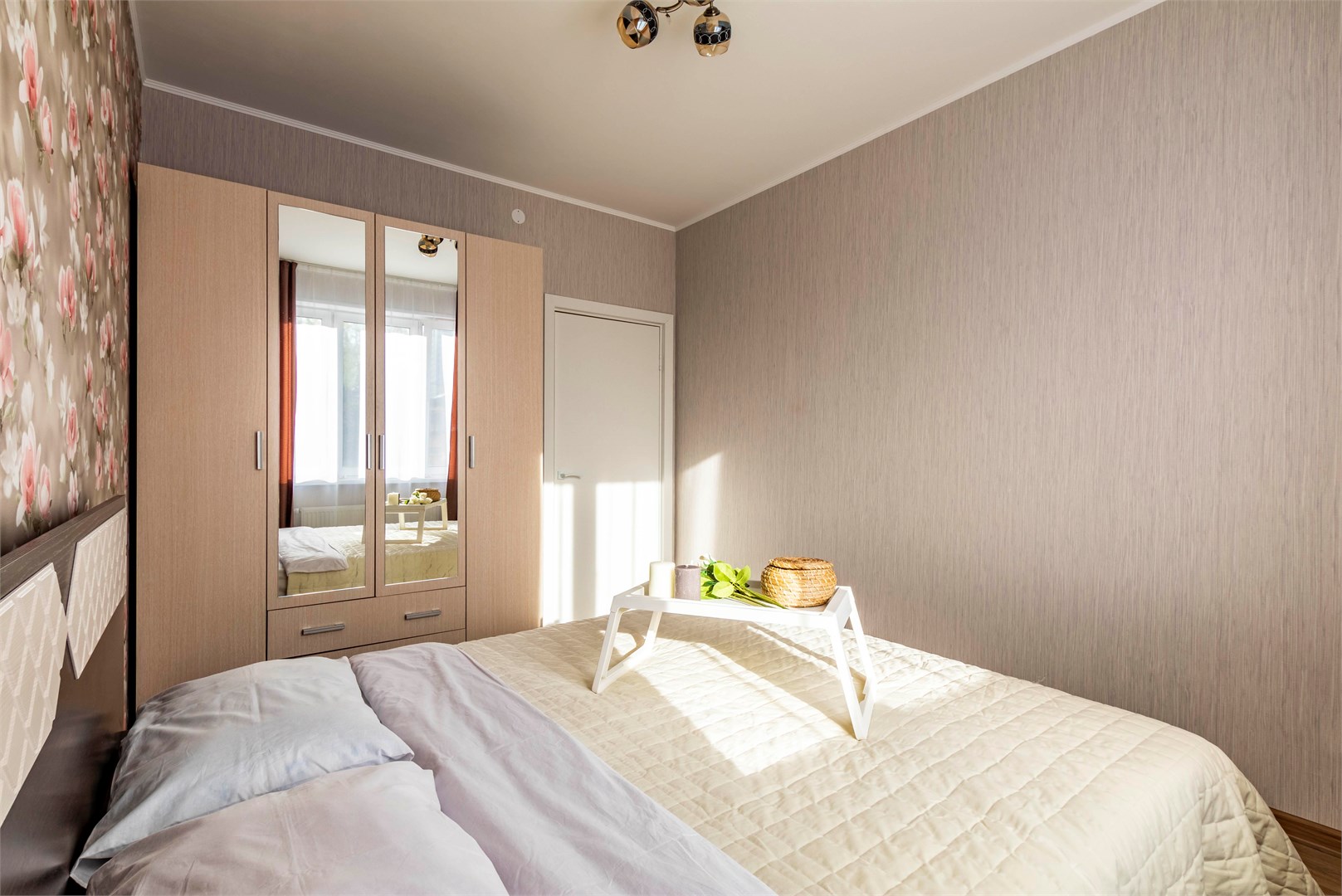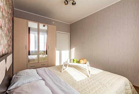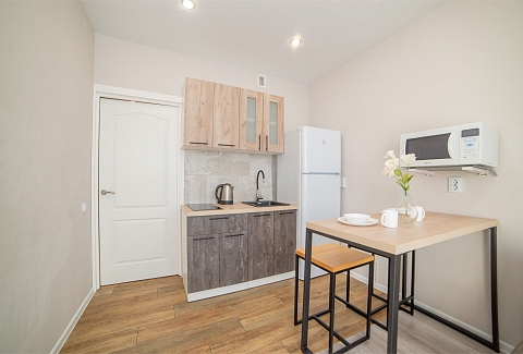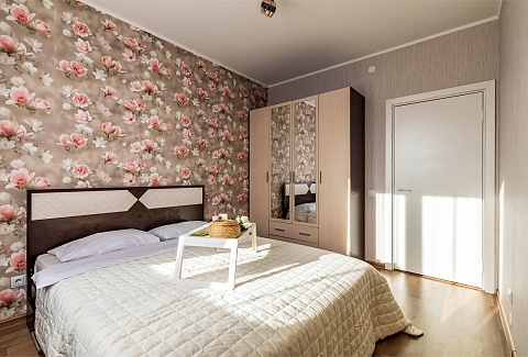 В номере: вешалка, диван раскладной, зеркало, кровать двуспальная, стол, стулья, шкаф, гладильная доска, микроволновая печь, набор посуды, плита электрическая, стиральная машина, сушилка для белья, телевизор, утюг, холодильник, электрочайник