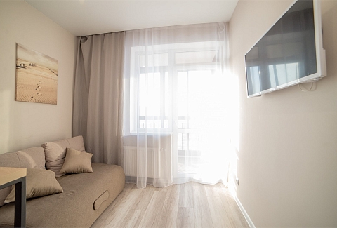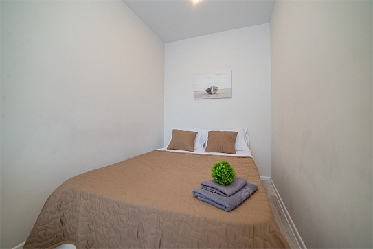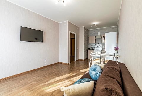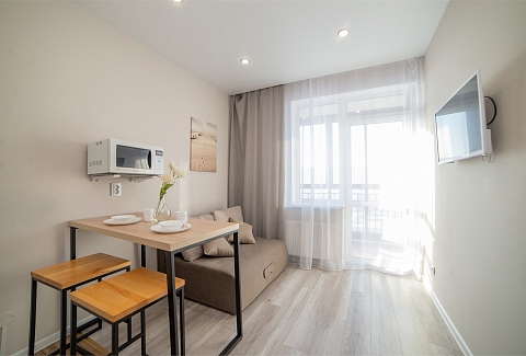 В номере: вешалка, диван раскладной, зеркало, кровать двуспальная, стол, стулья, шкаф, гладильная доска, духовой шкаф, кондиционер, микроволновая печь, набор посуды, плита электрическая, стиральная машина, сушилка для белья, телевизор, утюг, холодильник, электрочайник