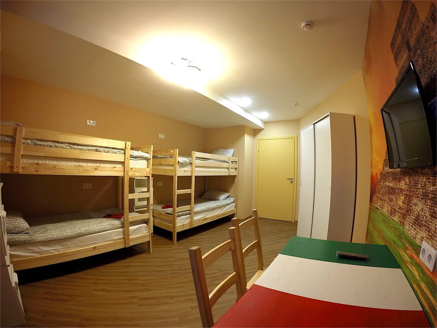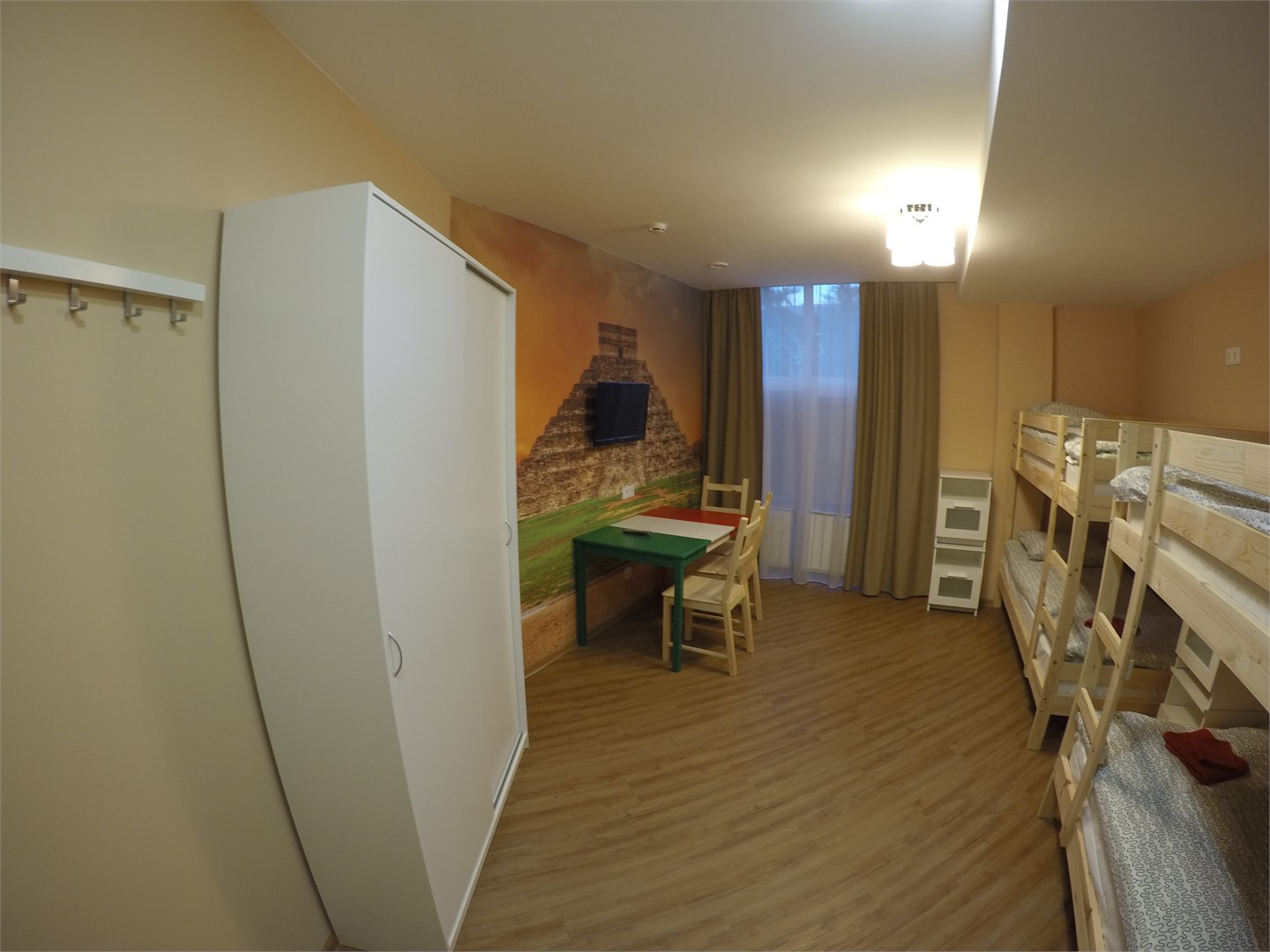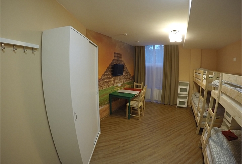 В номере: вешалка, кровать двухъярусная, прикроватные тумбочки, стол, стулья, шкаф, телевизор