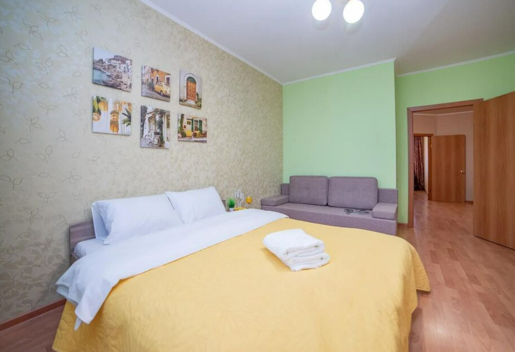 В номере: вешалка, диван раскладной, зеркало, кровать двуспальная, прикроватные тумбочки, стол, стулья, шкаф-купе, гладильная доска, духовой шкаф, микроволновая печь, набор посуды, плита электрическая, стиральная машина, сушилка для белья, телевизор, утюг, холодильник, электрочайник