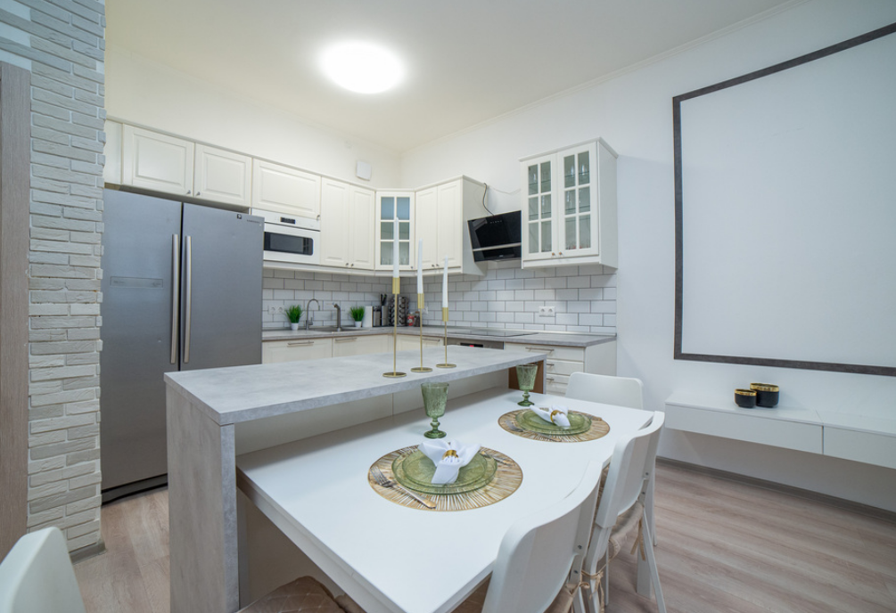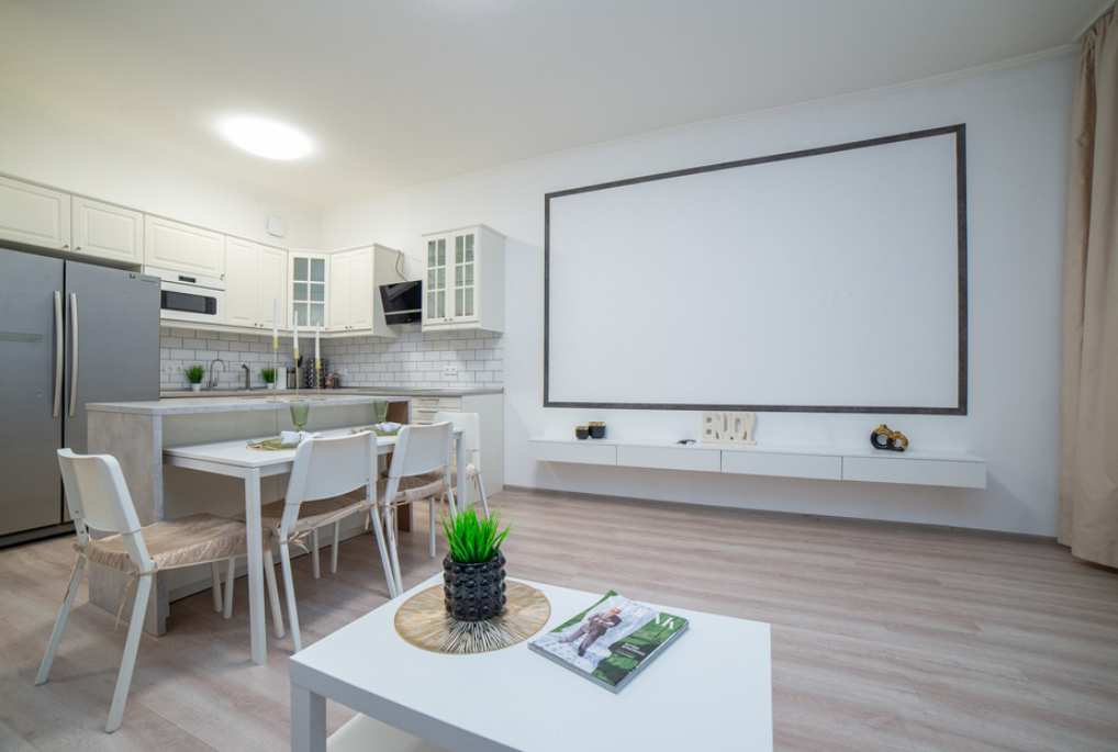 В номере: вешалка, диван раскладной, кровать двуспальная, прикроватные тумбочки, стол, стулья, шкаф, гладильная доска, духовой шкаф, микроволновая печь, набор посуды, плита электрическая, стиральная машина, сушилка для белья, телевизор, утюг, холодильник, электрочайник