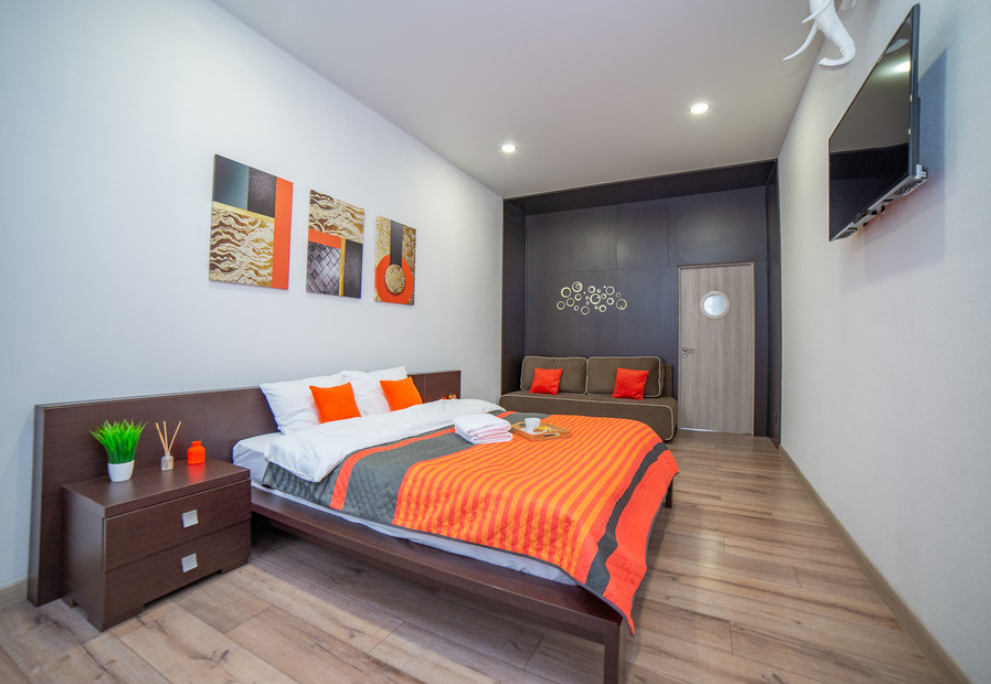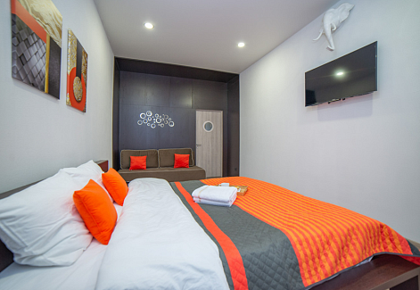 В номере: вешалка, диван раскладной, зеркало, кровать двуспальная, прикроватные тумбочки, стол, стулья, шкаф, гладильная доска, духовой шкаф, микроволновая печь, набор посуды, плита электрическая, стиральная машина, сушилка для белья, телевизор, утюг, холодильник, электрочайник