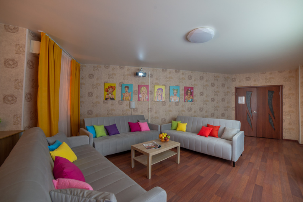 В номере: вешалка, диван раскладной, зеркало, кровать двуспальная, прикроватные тумбочки, стол, стулья, шкаф, гладильная доска, духовой шкаф, микроволновая печь, набор посуды, плита электрическая, стиральная машина, сушилка для белья, телевизор, утюг, холодильник, электрочайник