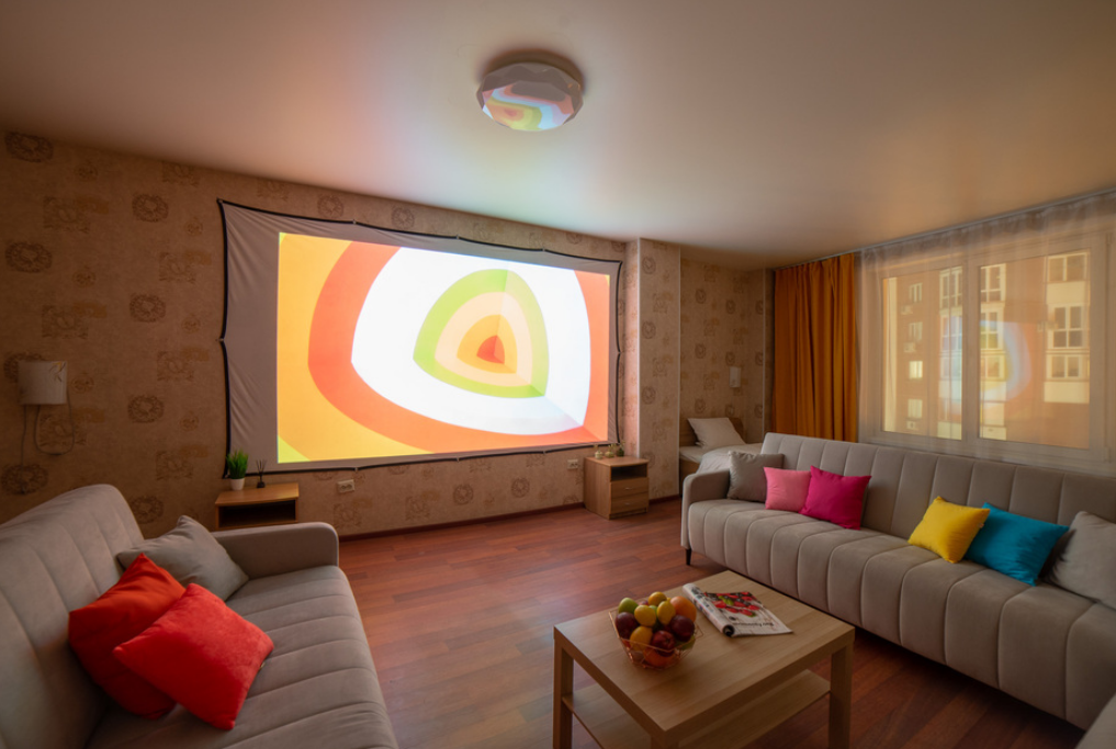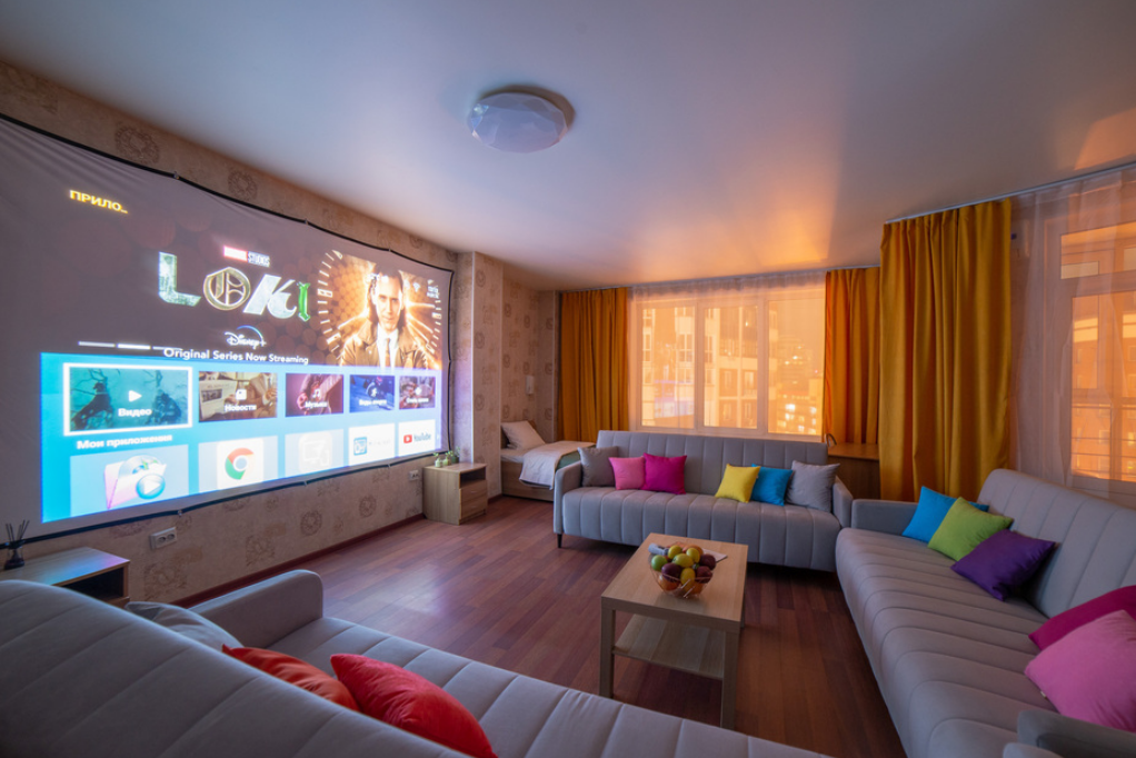 В номере: вешалка, диван раскладной, зеркало, кровать полутороспальная, прикроватные тумбочки, стол, стол для компьютера, стулья, шкаф, шкаф-купе, гладильная доска, духовой шкаф, кондиционер, микроволновая печь, плита электрическая, стиральная машина, сушилка для белья, телевизор, утюг, холодильник, электрочайник