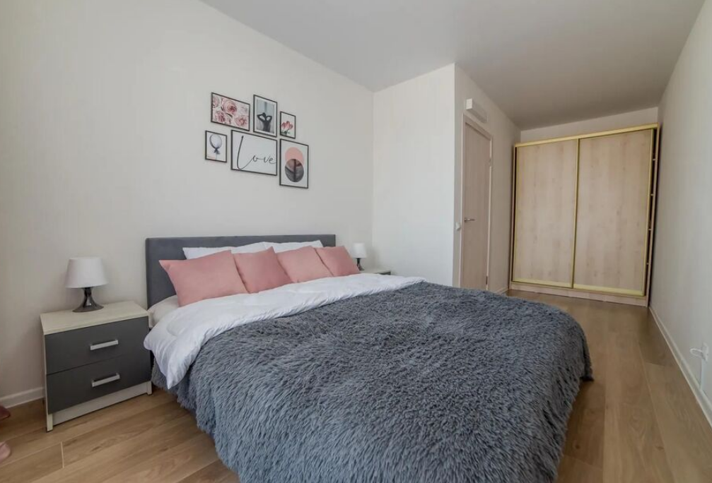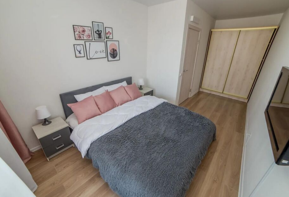 В номере: вешалка, диван раскладной, зеркало, кровать двуспальная, прикроватные тумбочки, стол, стулья, шкаф-купе, гладильная доска, духовой шкаф, микроволновая печь, набор посуды, плита электрическая, стиральная машина, сушилка для белья, телевизор, утюг, холодильник, электрочайник
