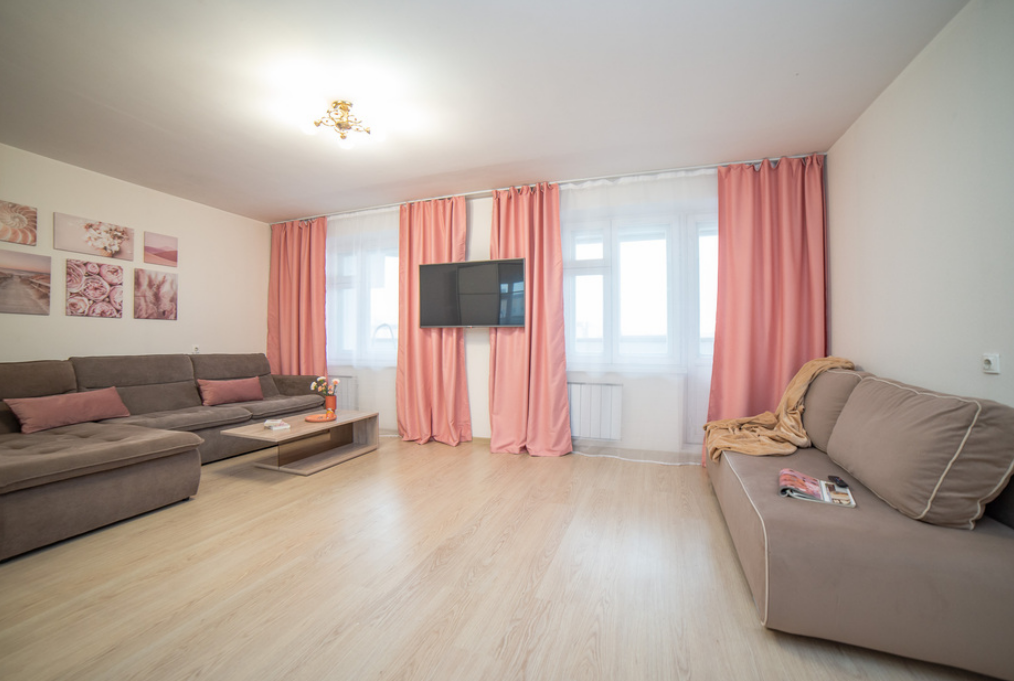 В номере: вешалка, диван раскладной, зеркало, кровать двуспальная, прикроватные тумбочки, стол, стулья, шкаф-купе, гладильная доска, микроволновая печь, набор посуды, плита электрическая, стиральная машина, сушилка для белья, телевизор, утюг, холодильник, электрочайник