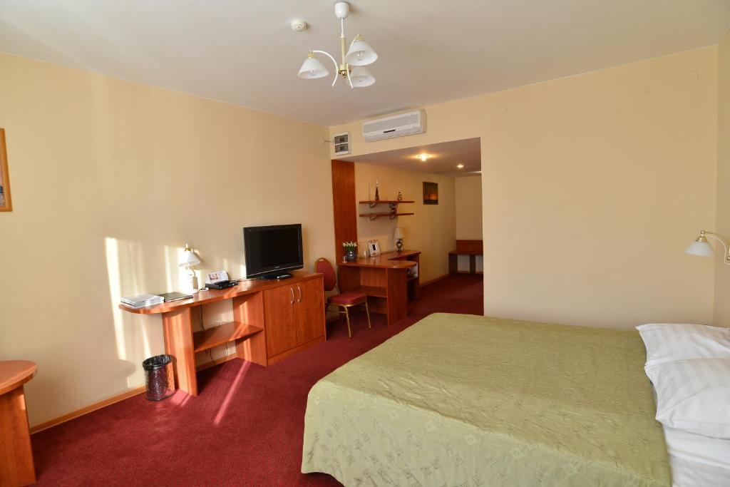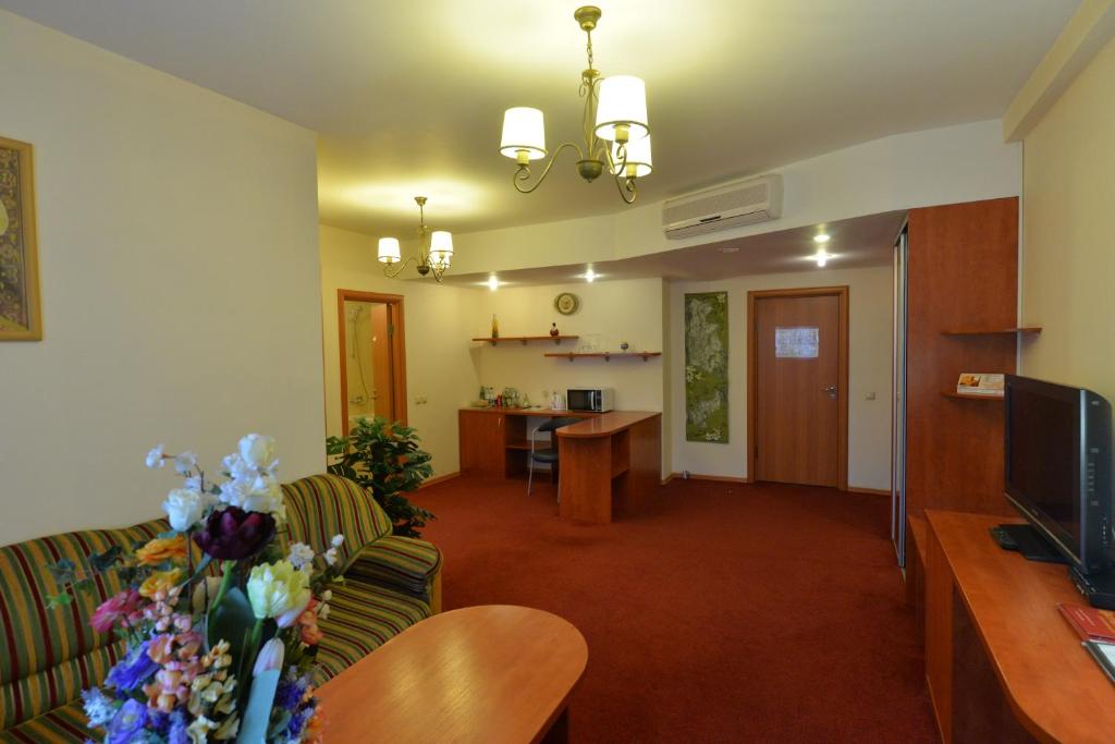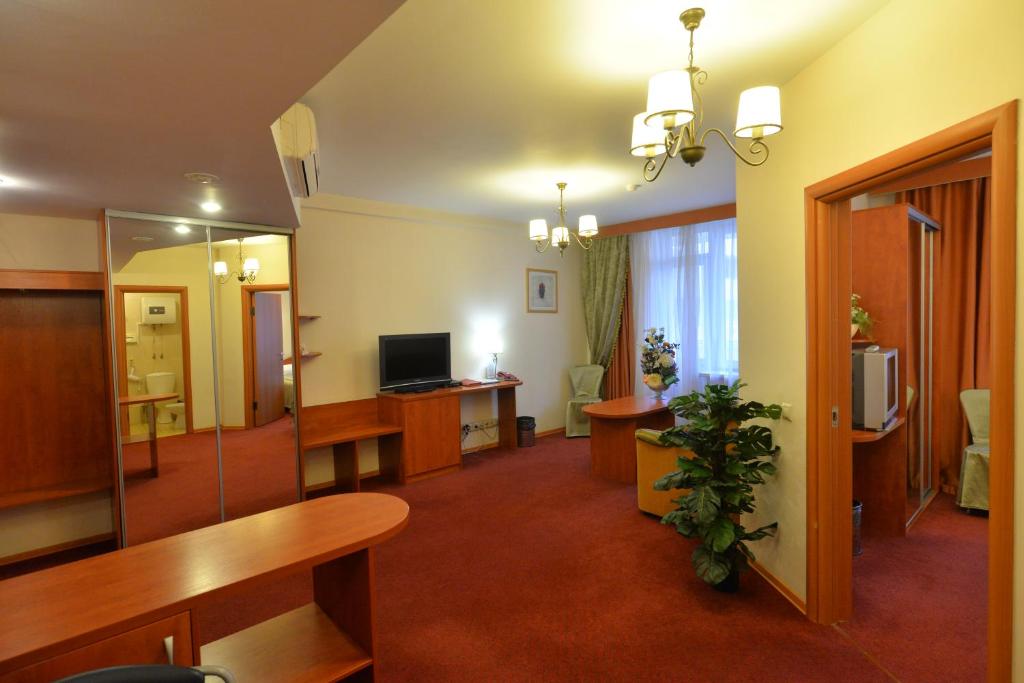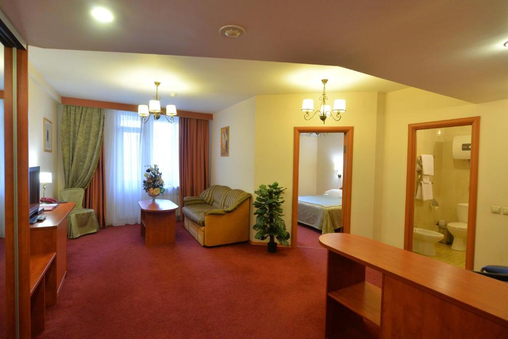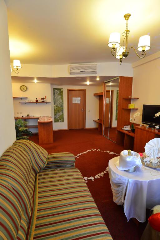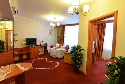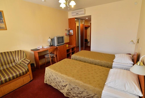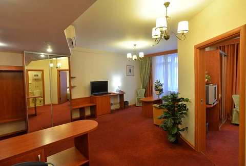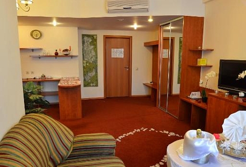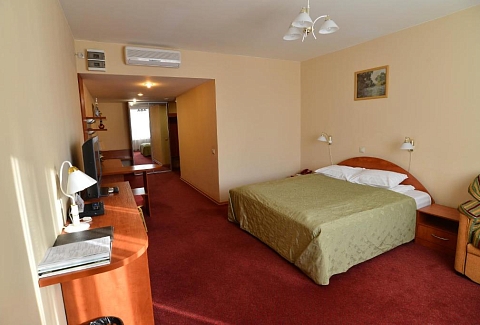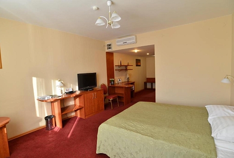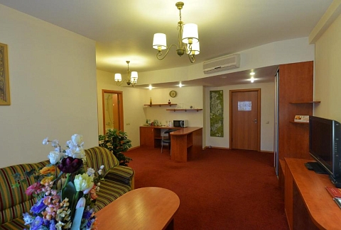 В номере: диван, кровать двуспальная, прикроватные тумбочки, стол, стул, шкаф, кондиционер, сейф, телевизор ЖК, холодильник, чайный набор посуды, электрочайник