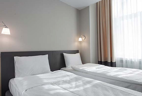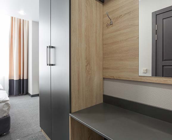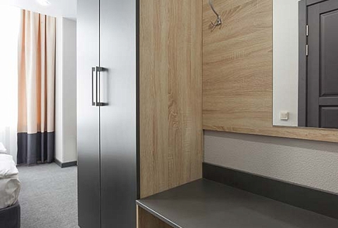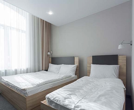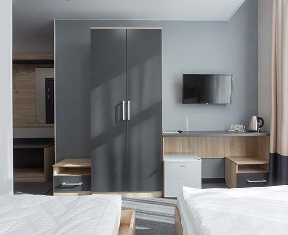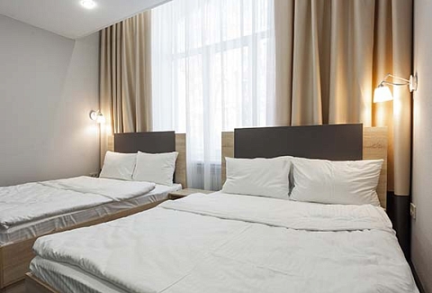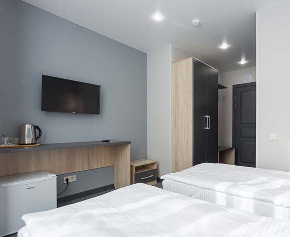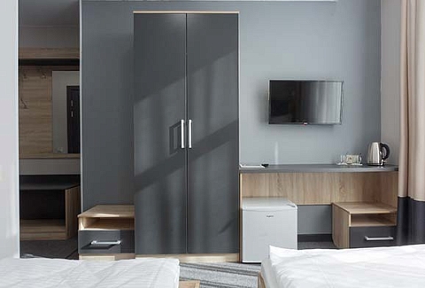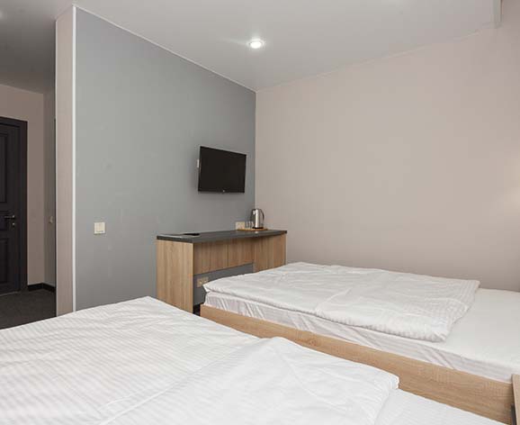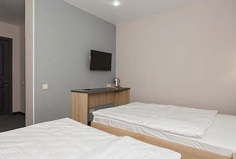 В номере: вешалка, зеркало, кровати односпальные /одна двуспальная кровать, тумба, шкаф, кондиционер, кулер, мини-холодильник, телевизор, телефон, чайная станция, электрочайник
