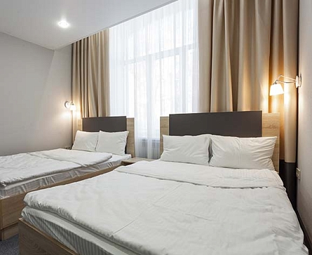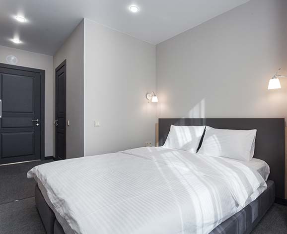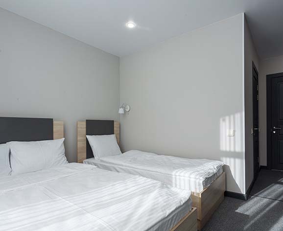 Ванная комната — современная, с высоким уровнем комфорта.Интерьеры выдержаны в лаконичном минималистичном стиле: светлые тона, продуманная планировка и белоснежное постельное бельё создают атмосферу свежести и уюта. Каждый номер — это пространство с полной комплектацией мебели и вниманием к деталям.Отель работает круглосуточно и оснащён системой видеонаблюдения, обеспечивая безопасность и спокойствие гостей.