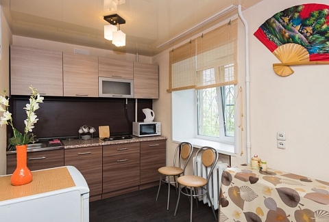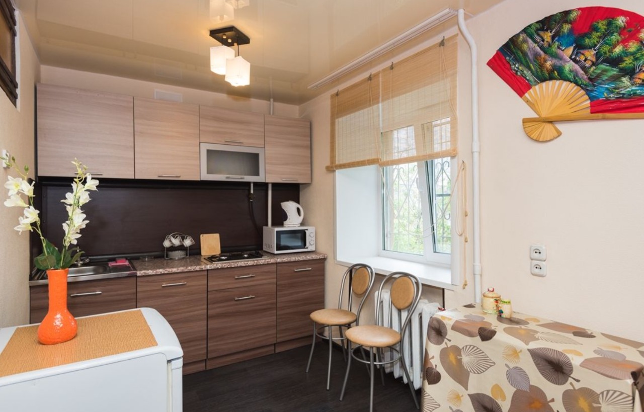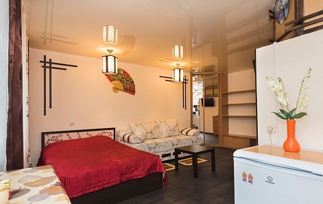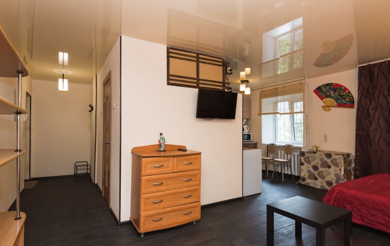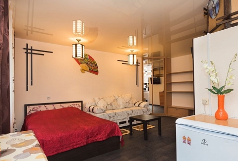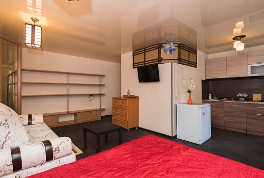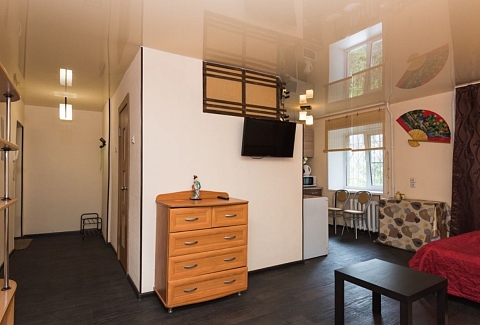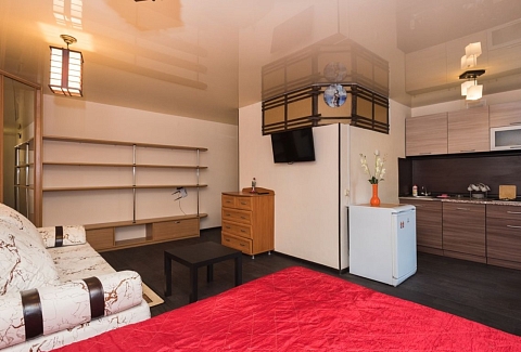 В номере: вешалка, диван, зеркало, кровать двуспальная, стол, стулья, шкаф, микроволновая печь, плита газовая, телевизор, холодильник, чайный набор посуды, электрочайник