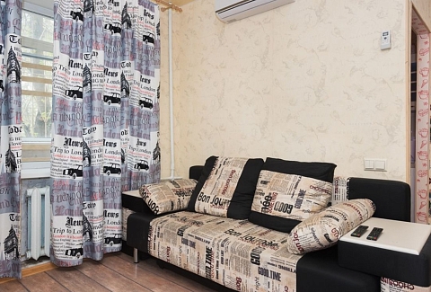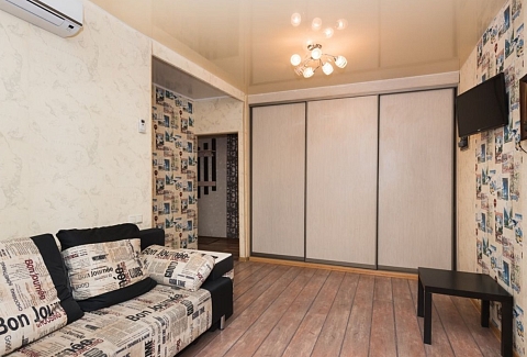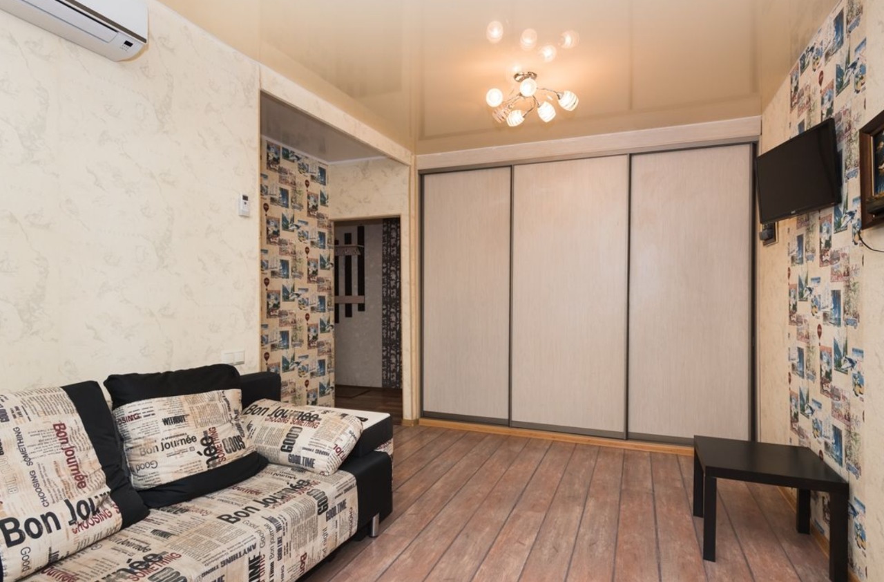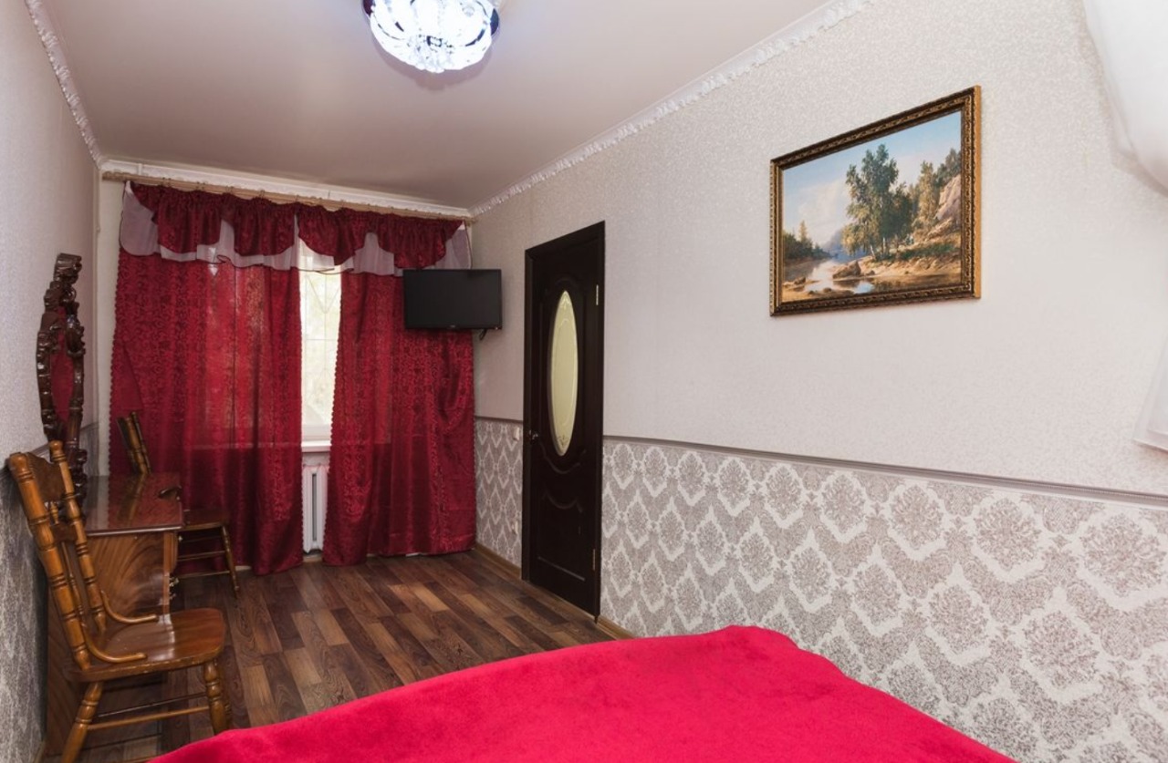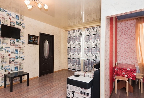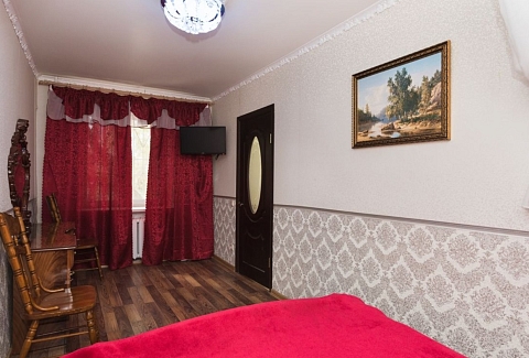 В номере: вешалка, диван, зеркало, кровать двуспальная, стол, стулья, шкаф, кондиционер, микроволновая печь, плита газовая, телевизор, холодильник, чайный набор посуды, электрочайник