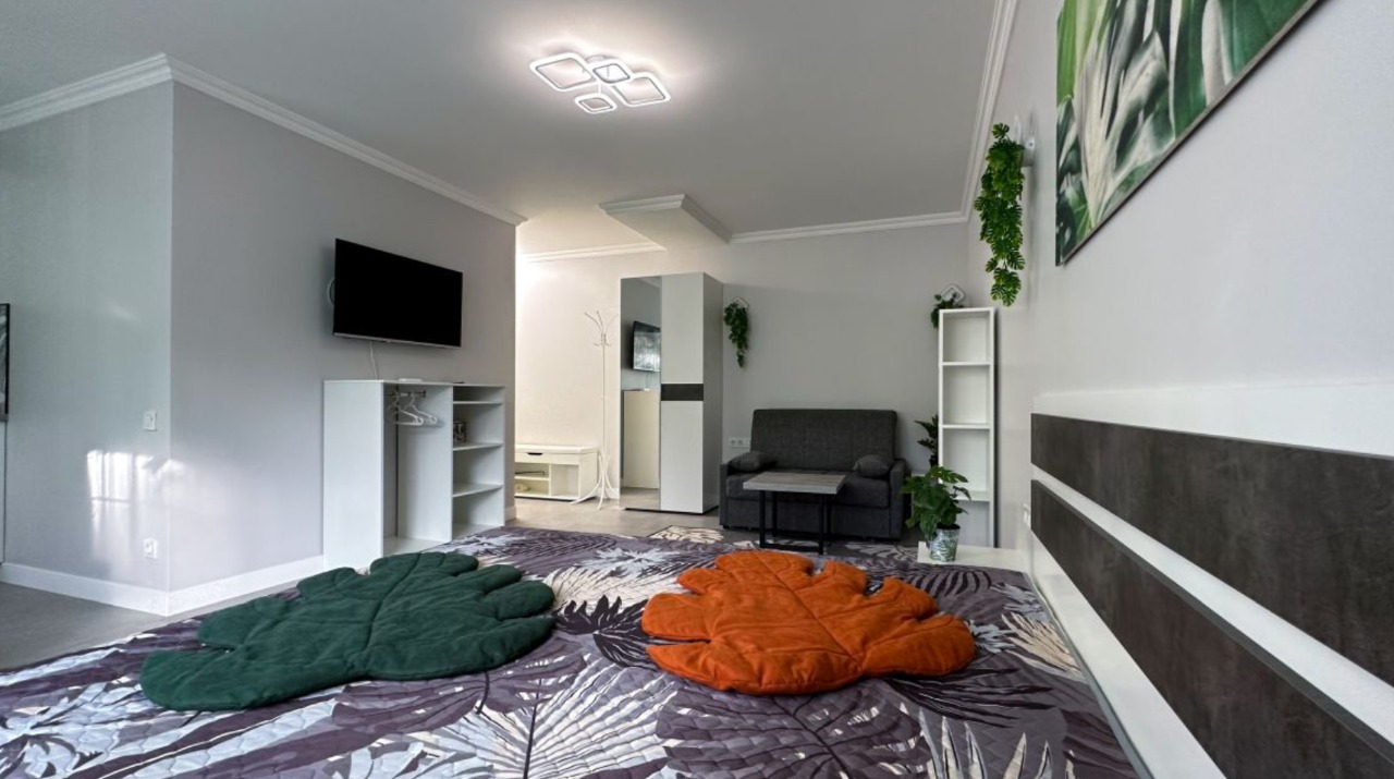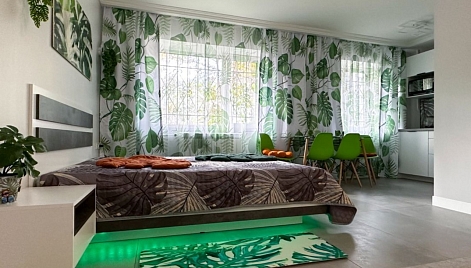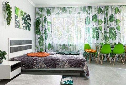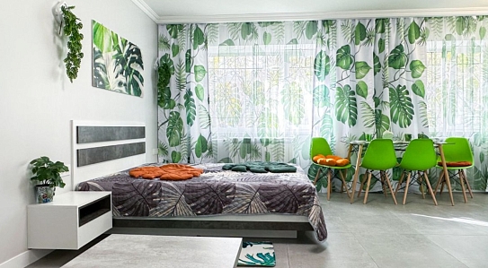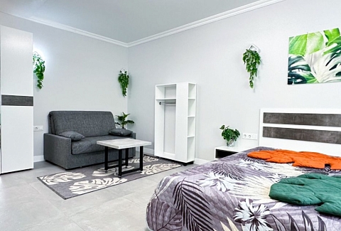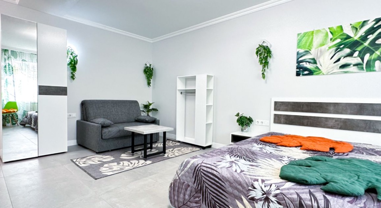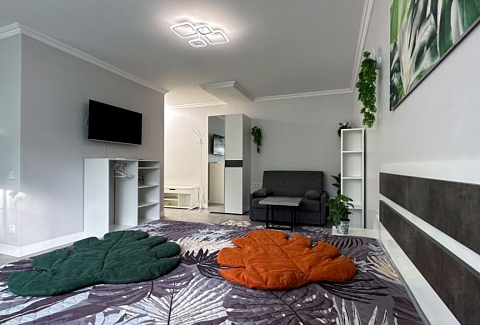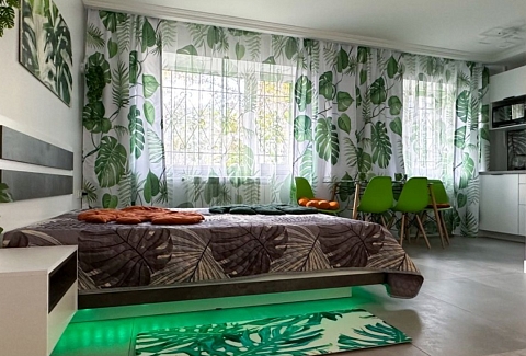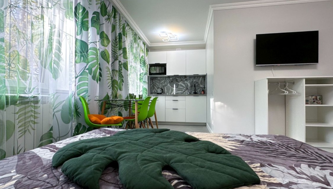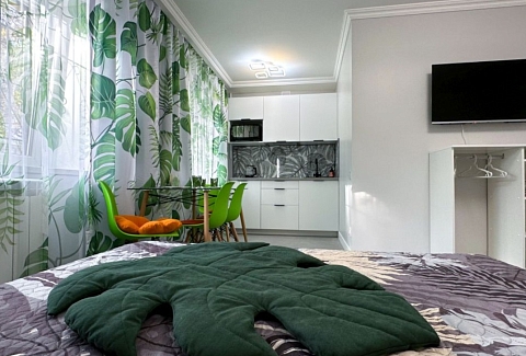 В номере: вешалка, диван, зеркало, кровать двуспальная, стол, стулья, шкаф, микроволновая печь, телевизор, холодильник, чайный набор посуды, электрочайник