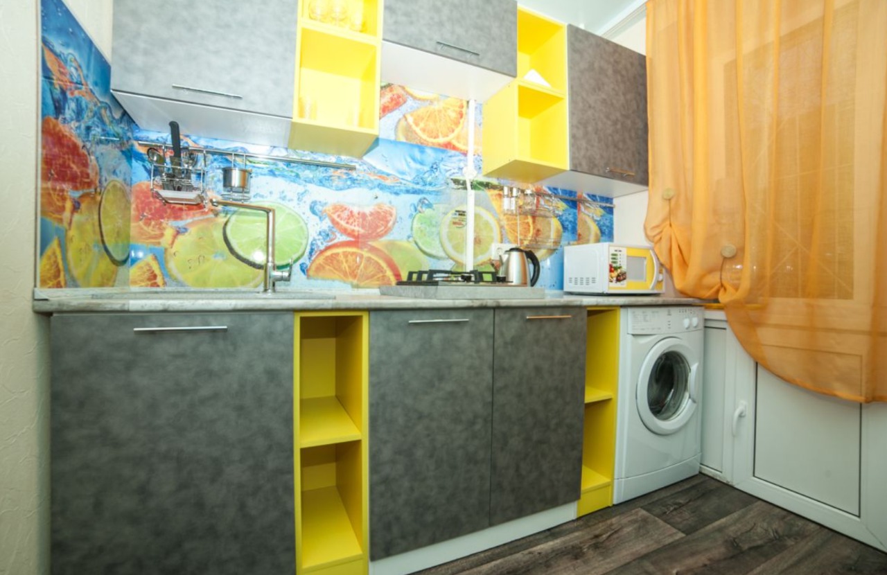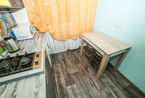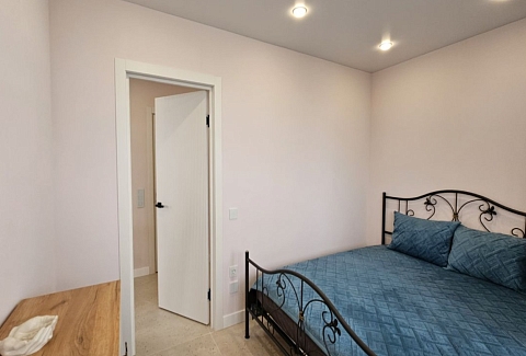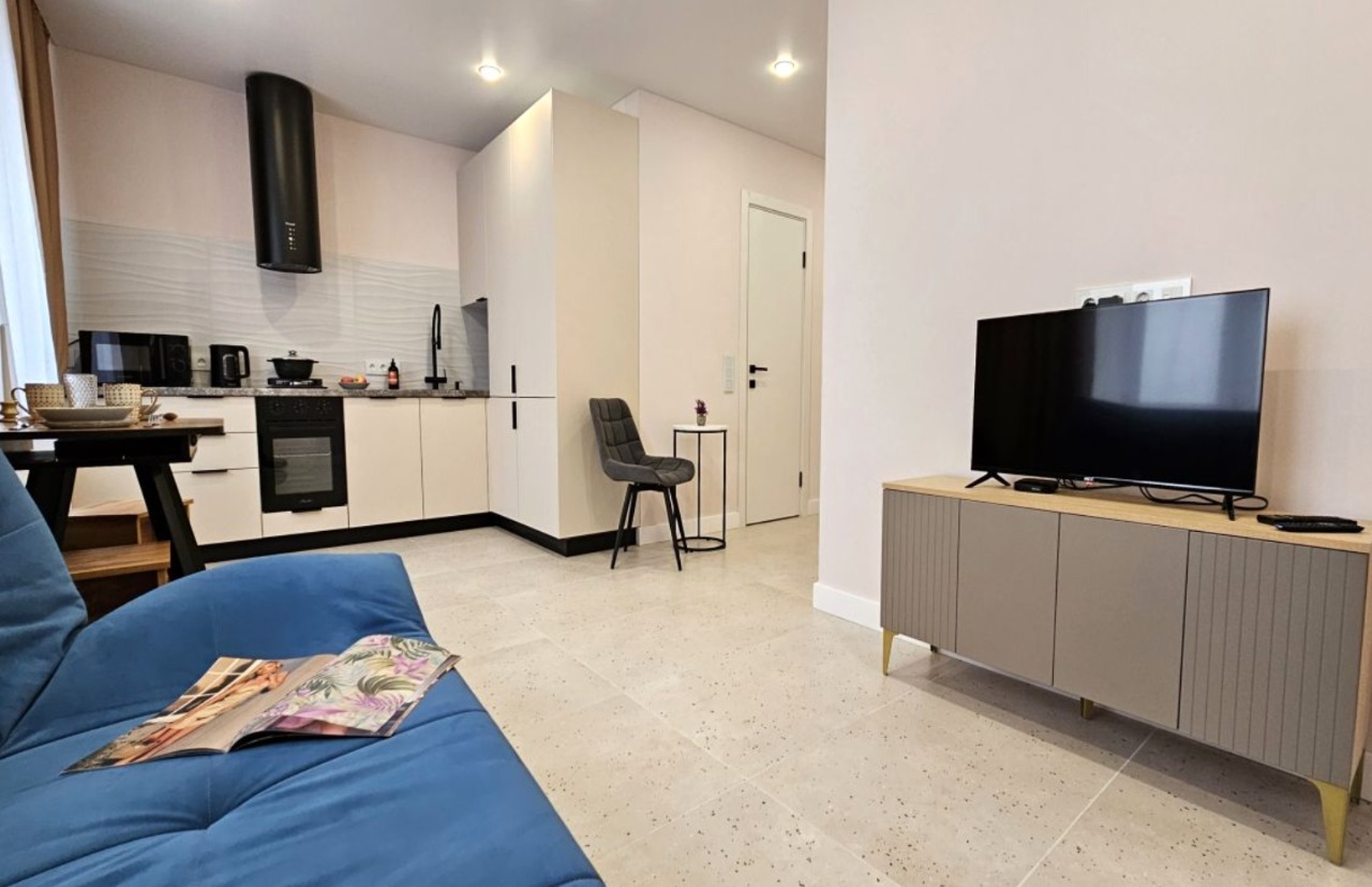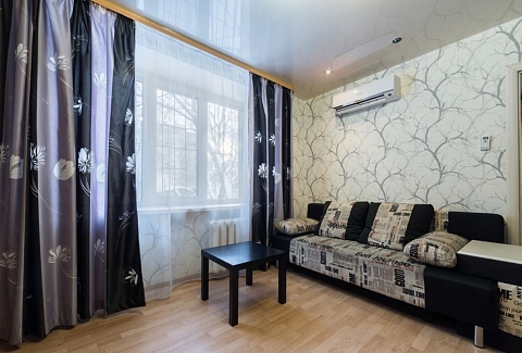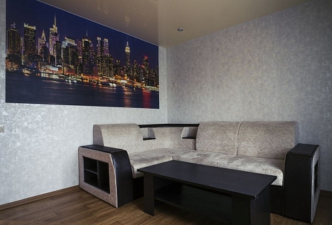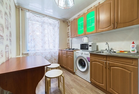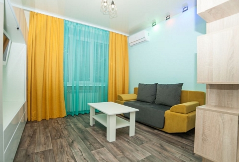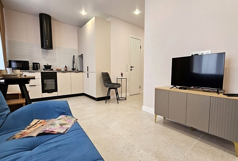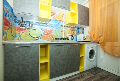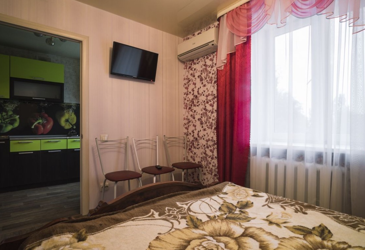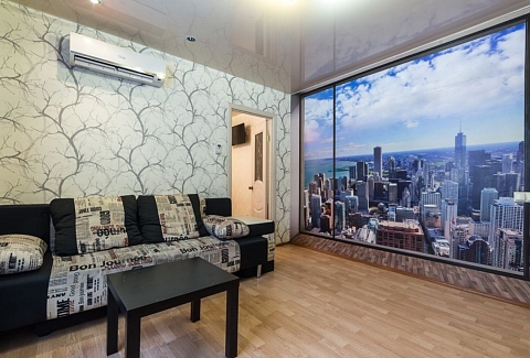 В номере: вешалка, диван, зеркало, кровать двуспальная, стол, стулья, шкаф, кондиционер, микроволновая печь, плита газовая, стиральная машина, телевизор, холодильник, чайный набор посуды, электрочайник