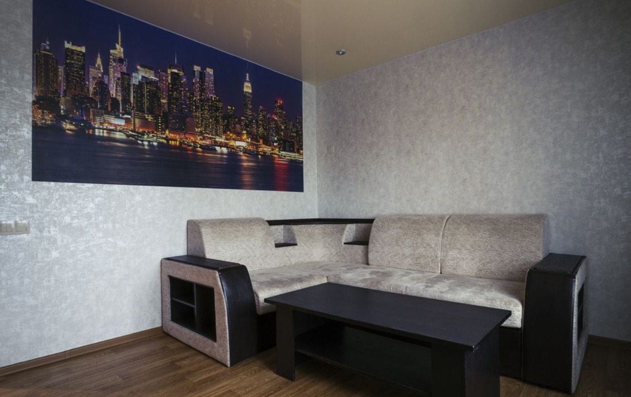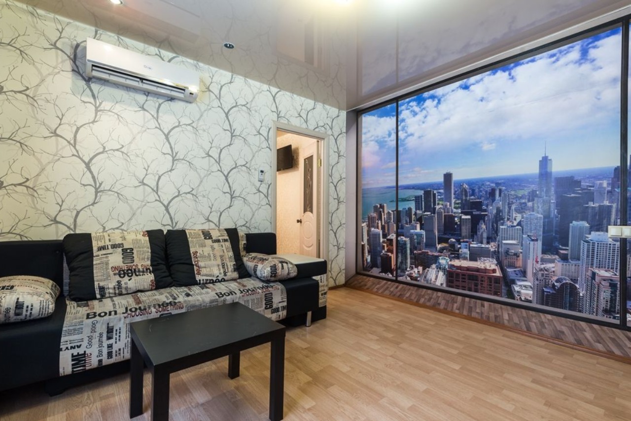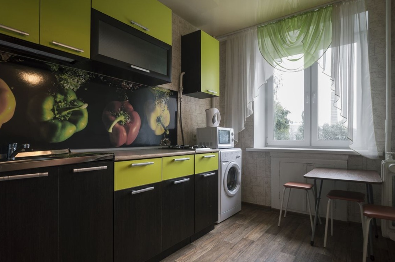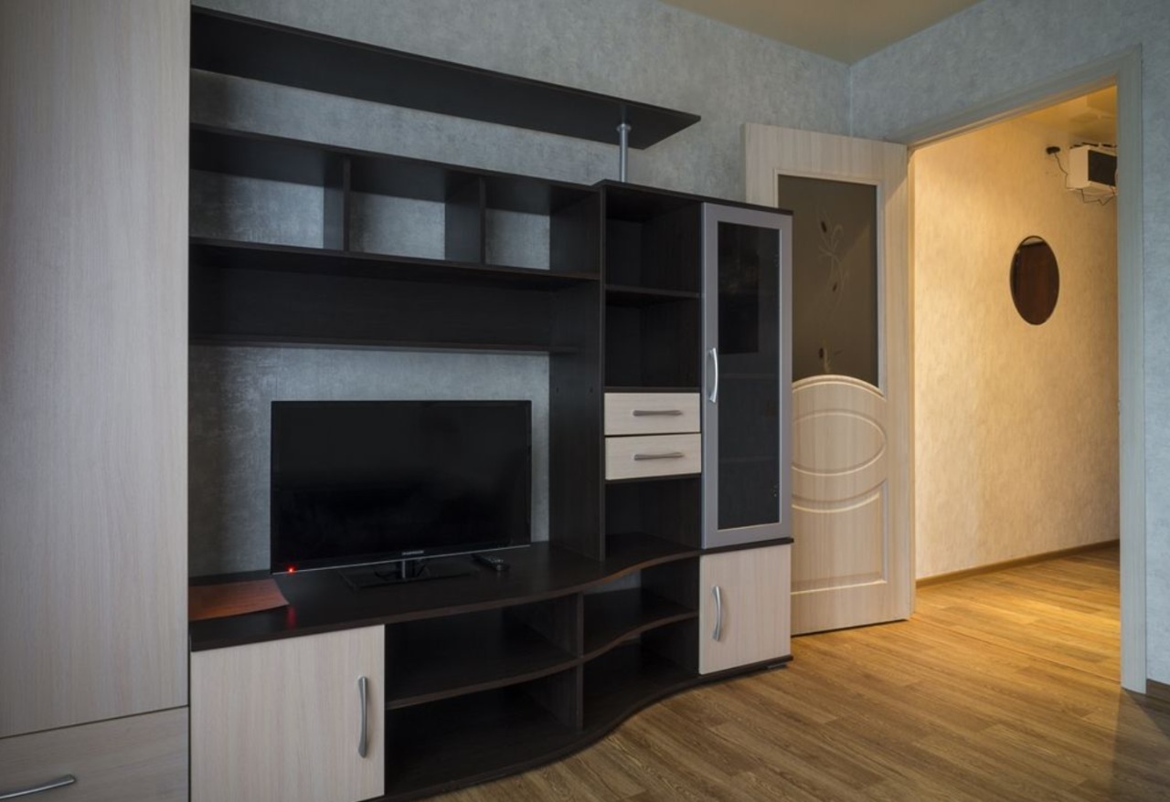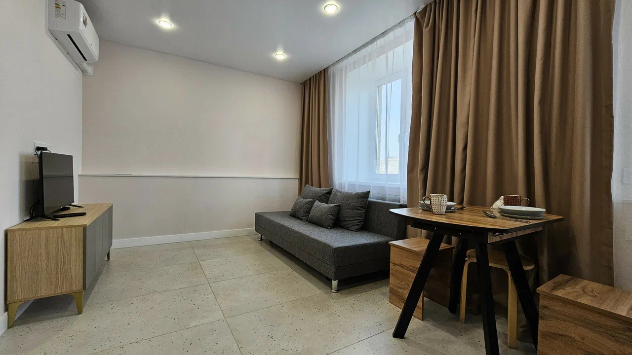 В номере: вешалка, диван, зеркало, кровать двуспальная, стол, стулья, шкаф, кондиционер, микроволновая печь, плита газовая, стиральная машина, телевизор, холодильник, чайный набор посуды, электрочайник