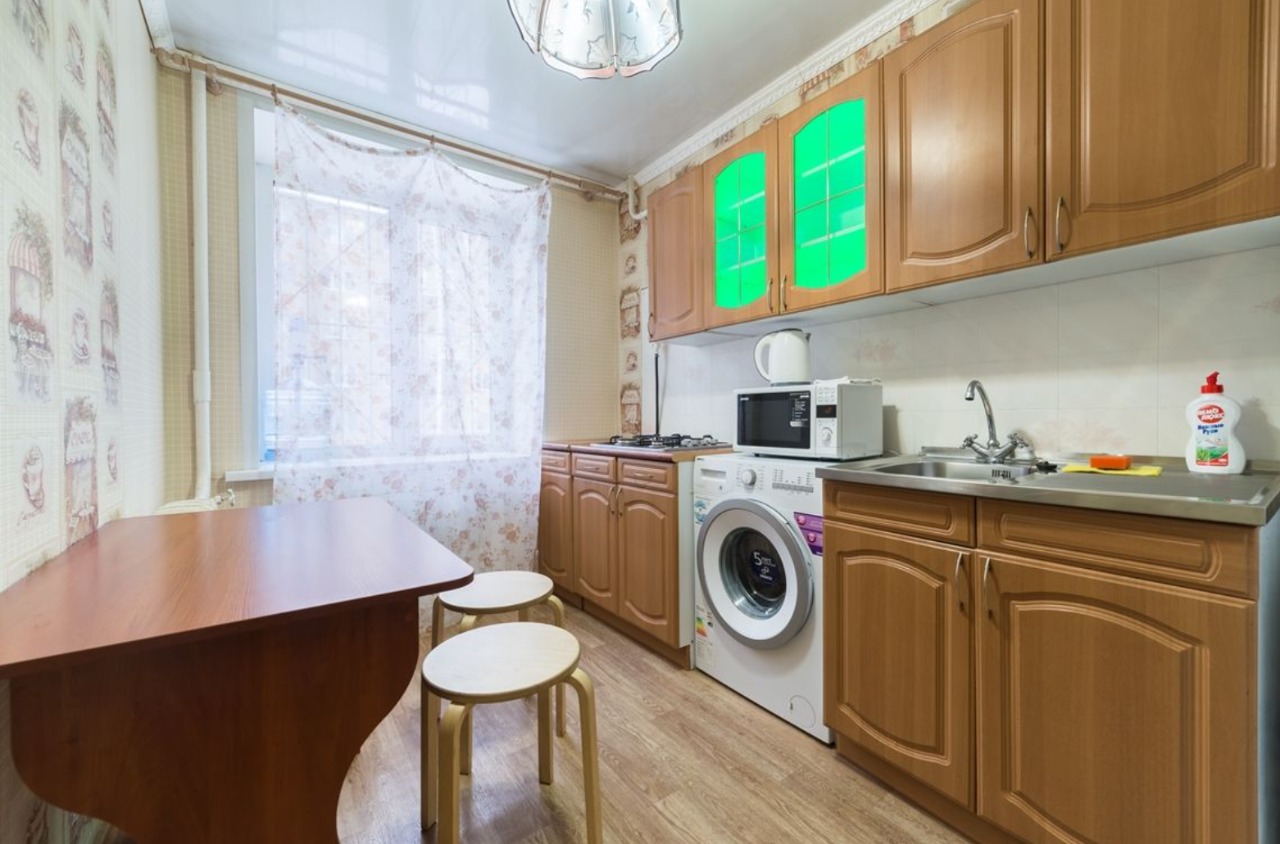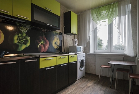 В номере: вешалка, диван, зеркало, кровать двуспальная, стол, стулья, шкаф, микроволновая печь, плита газовая, стиральная машина, телевизор, холодильник, чайный набор посуды, электрочайник