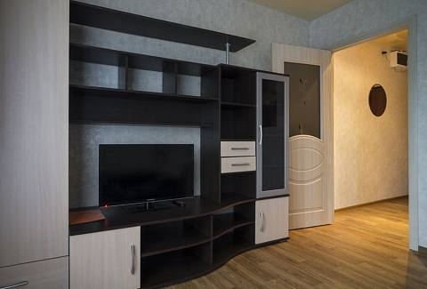 В номере: вешалка, диван, зеркало, кровать двуспальная, стол, стулья, шкаф, кондиционер, микроволновая печь, плита газовая, стиральная машина, телевизор ЖК, холодильник, чайный набор посуды, электрочайник