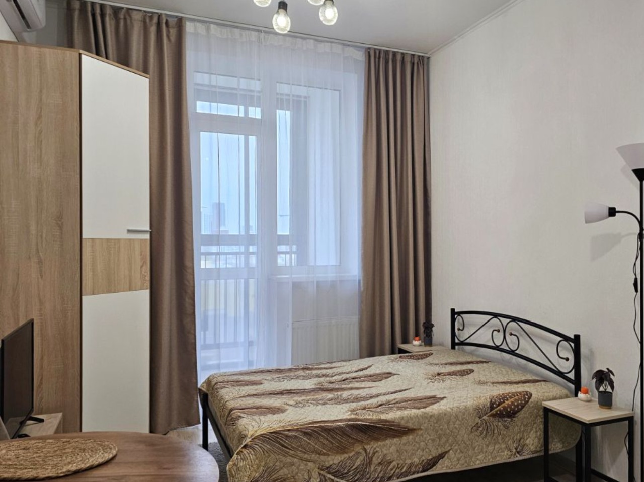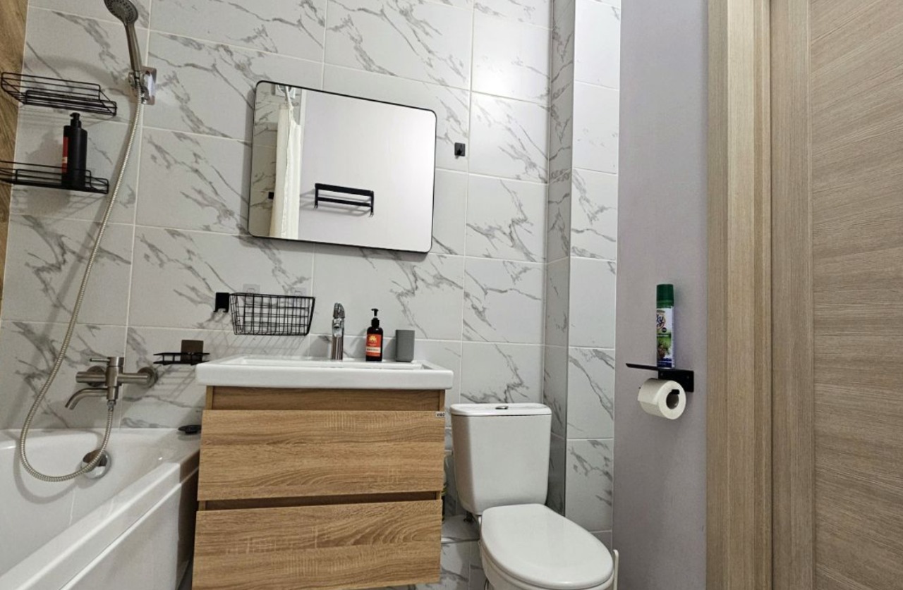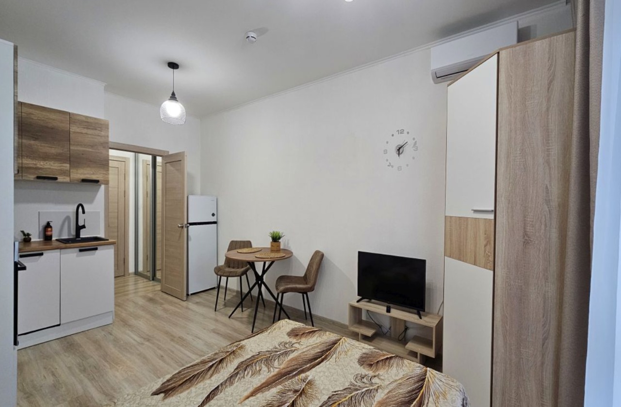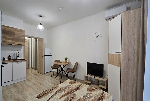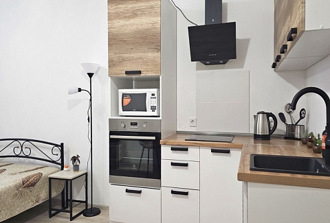 В номере: вешалка, зеркало, кровать двуспальная, стол, стулья, шкаф, микроволновая печь, мини-холодильник, плита электрическая, стиральная машина, телевизор, чайный набор посуды, электрочайник