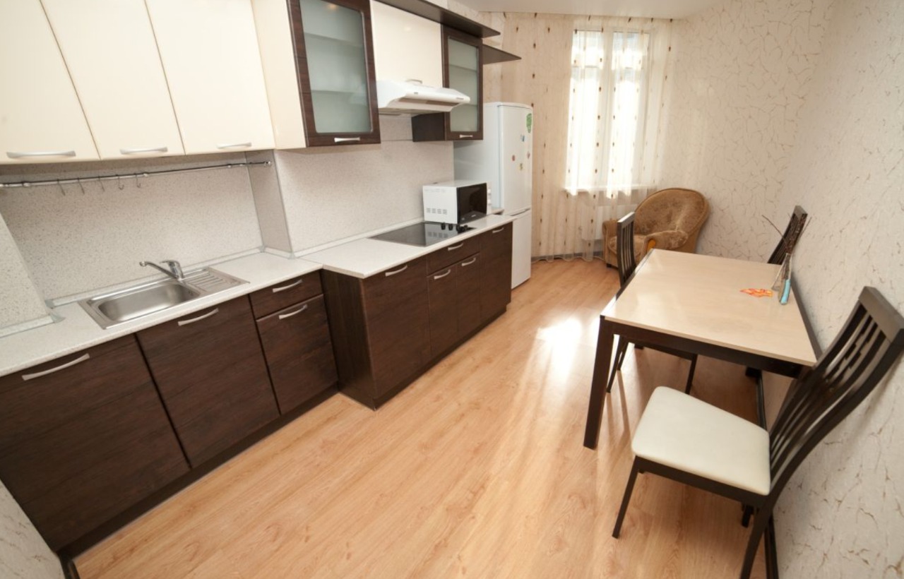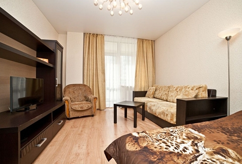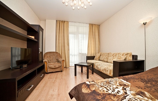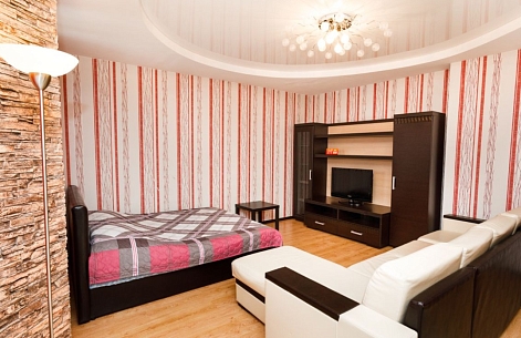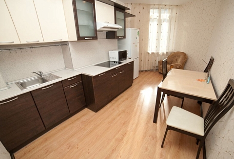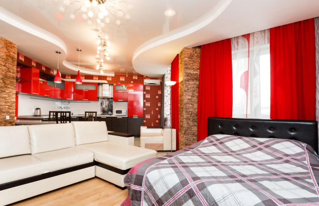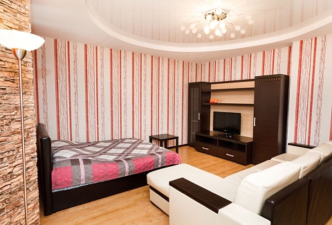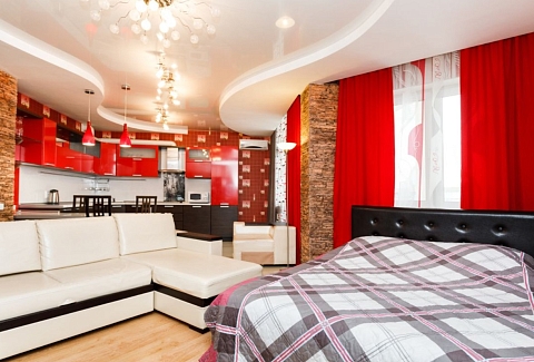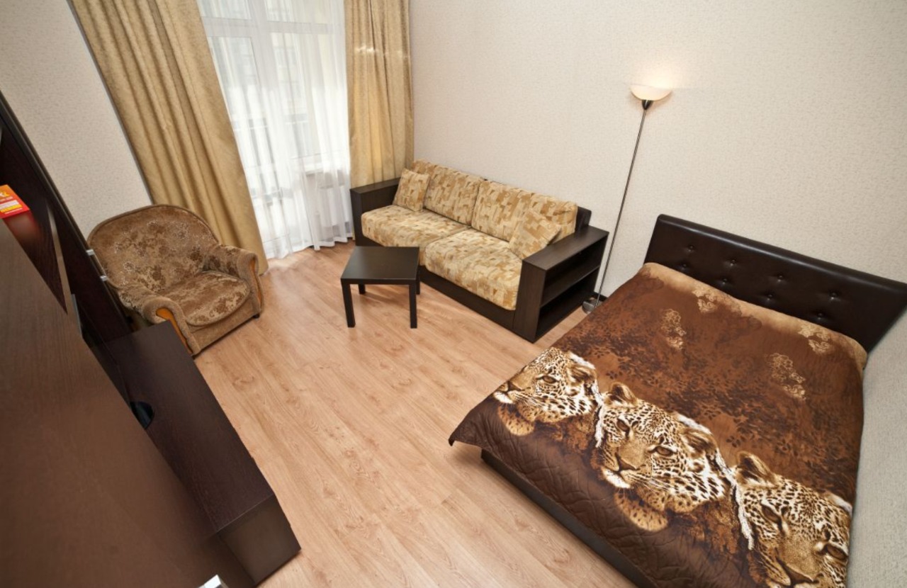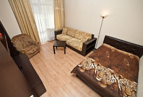 В номере: вешалка, диван, зеркало, кровать двуспальная, стол, стулья, шкаф, микроволновая печь, плита электрическая, телевизор, чайный набор посуды, электрочайник