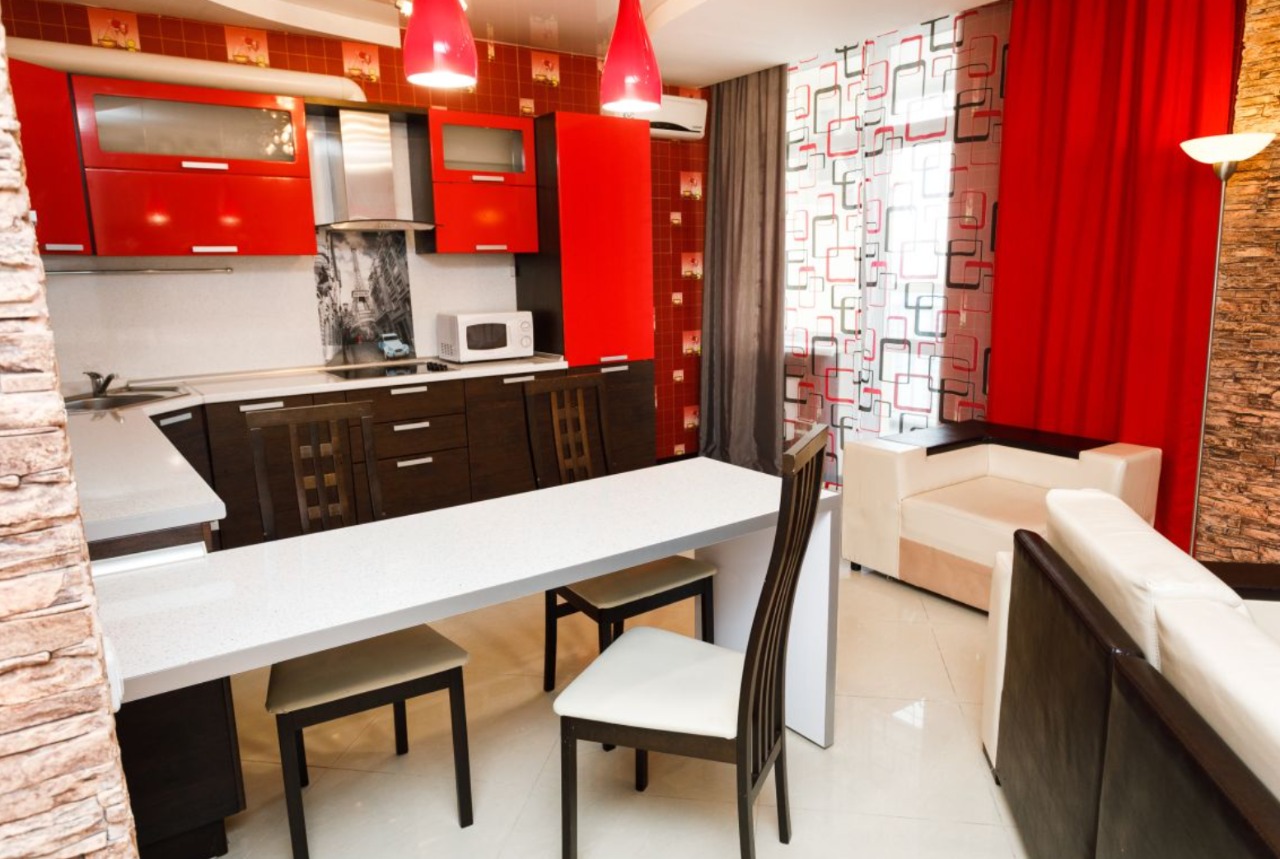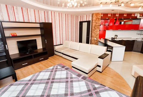 В номере: вешалка, диван, зеркало, кровать двуспальная, стол, столик журнальный, стулья, шкаф, микроволновая печь, плита электрическая, телевизор, холодильник, чайный набор посуды, электрочайник