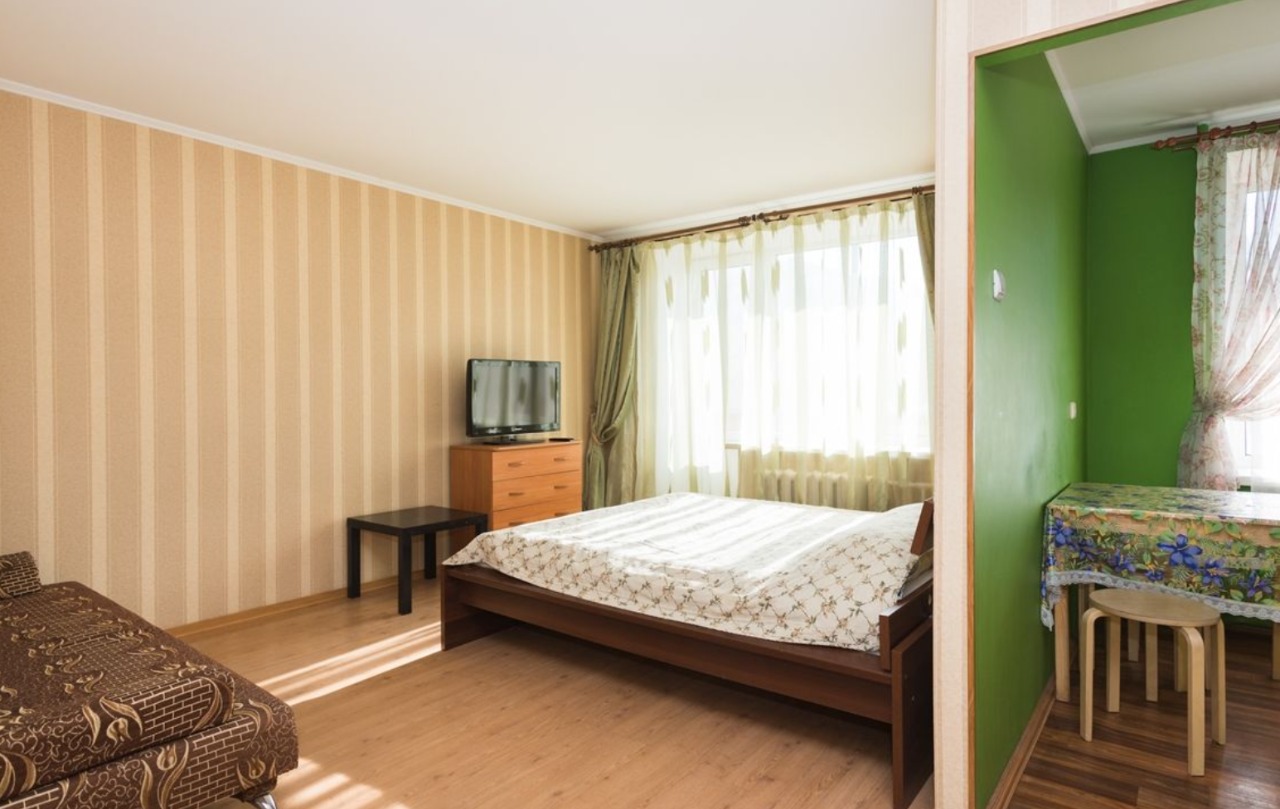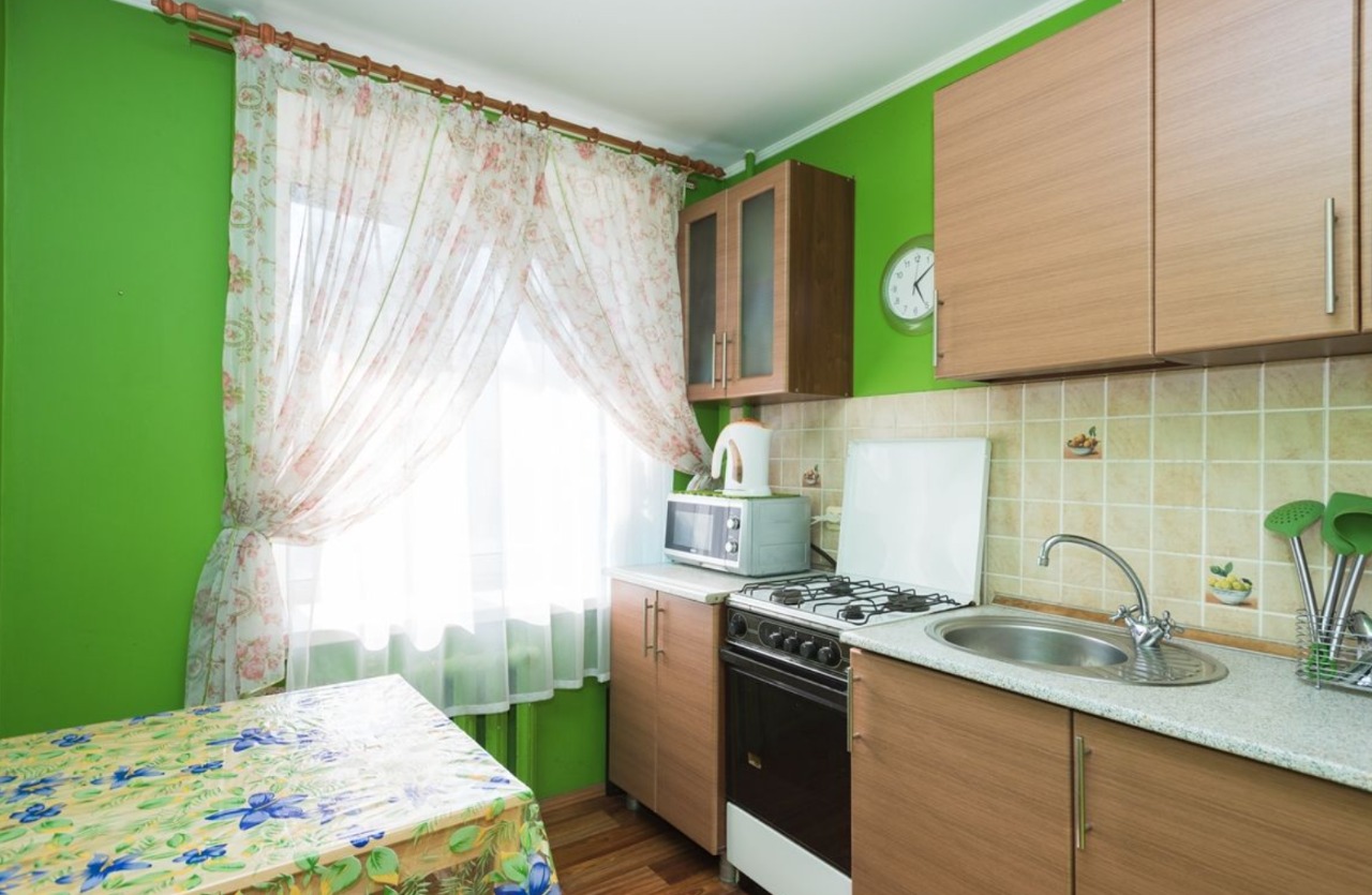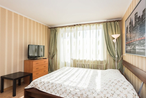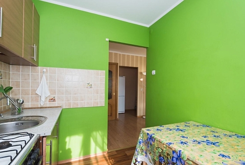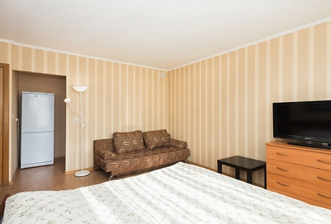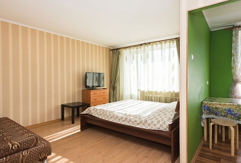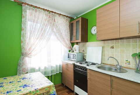 В номере: вешалка, диван, зеркало, кровать двуспальная, стол, стулья, шкаф, микроволновая печь, набор посуды, плита газовая, телевизор ЖК, холодильник, чайный набор посуды, электрочайник