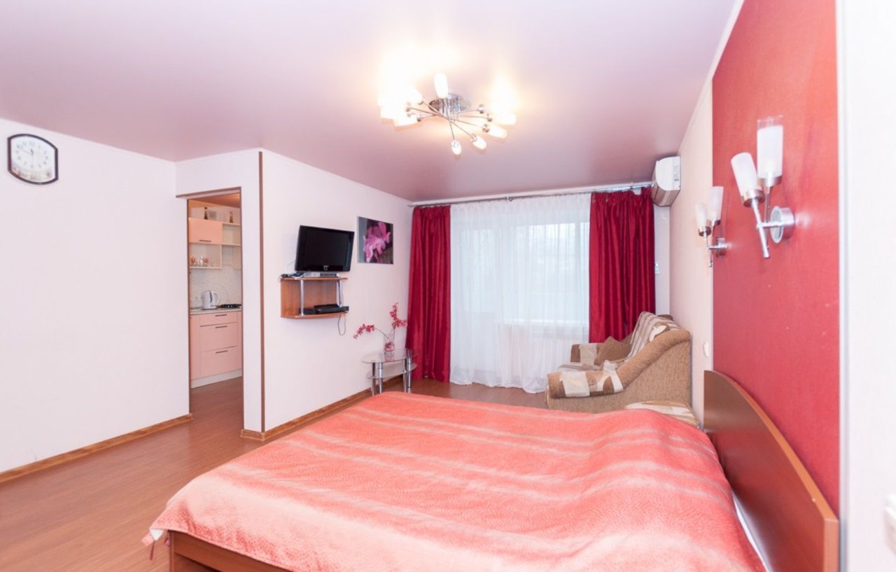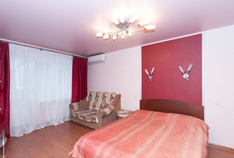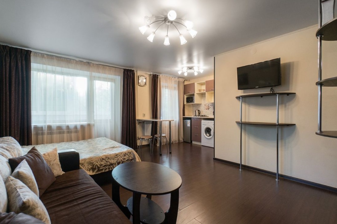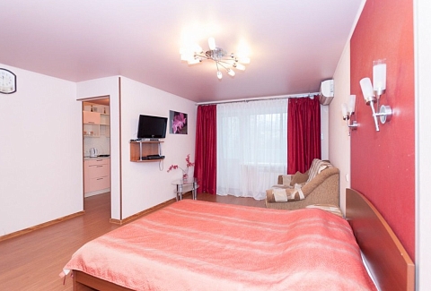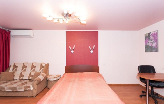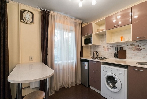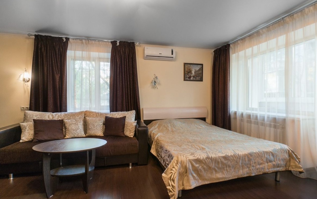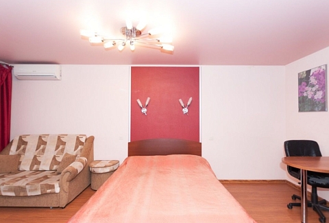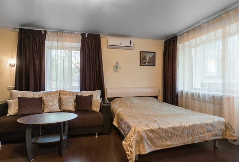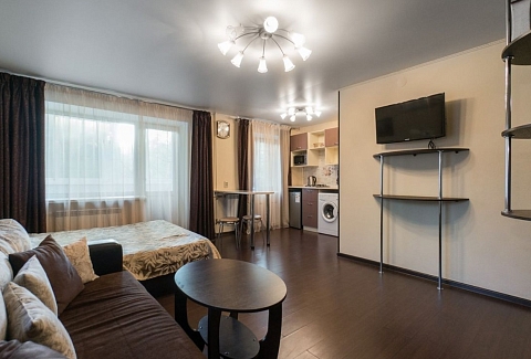 В номере: вешалка, диван, зеркало, кровать двуспальная, стол, стулья, шкаф, кондиционер, микроволновая печь, мини-холодильник, плита газовая, стиральная машина, телевизор ЖК, чайный набор посуды, электрочайник